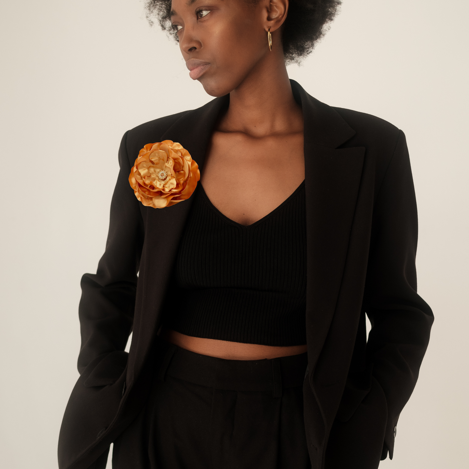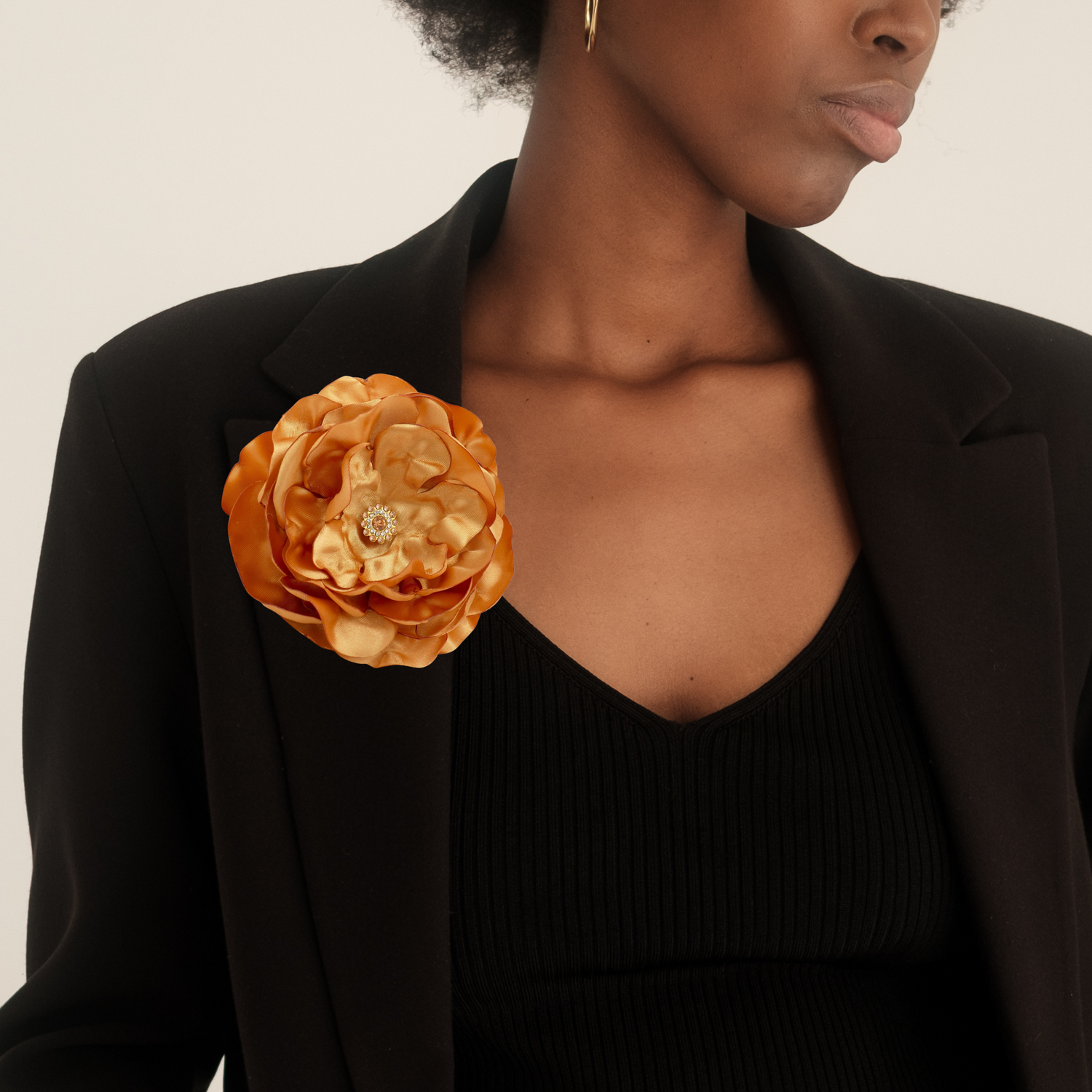 Dieser strahlende, goldene Blüten-Brosche aus Satin ist das perfekte Accessoire für warme und romantische Herzen.