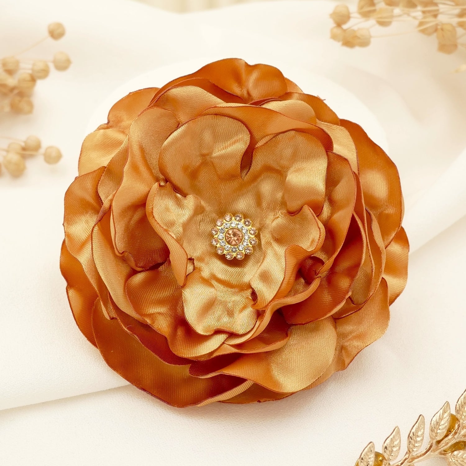 Die elegante Satinblüte hat einen Durchmesser von 11 cm und trägt in ihrer Mitte einen Strasscabochon. Das elegante Gold strahlt wohlige Wärme und Freundlichkeit aus.