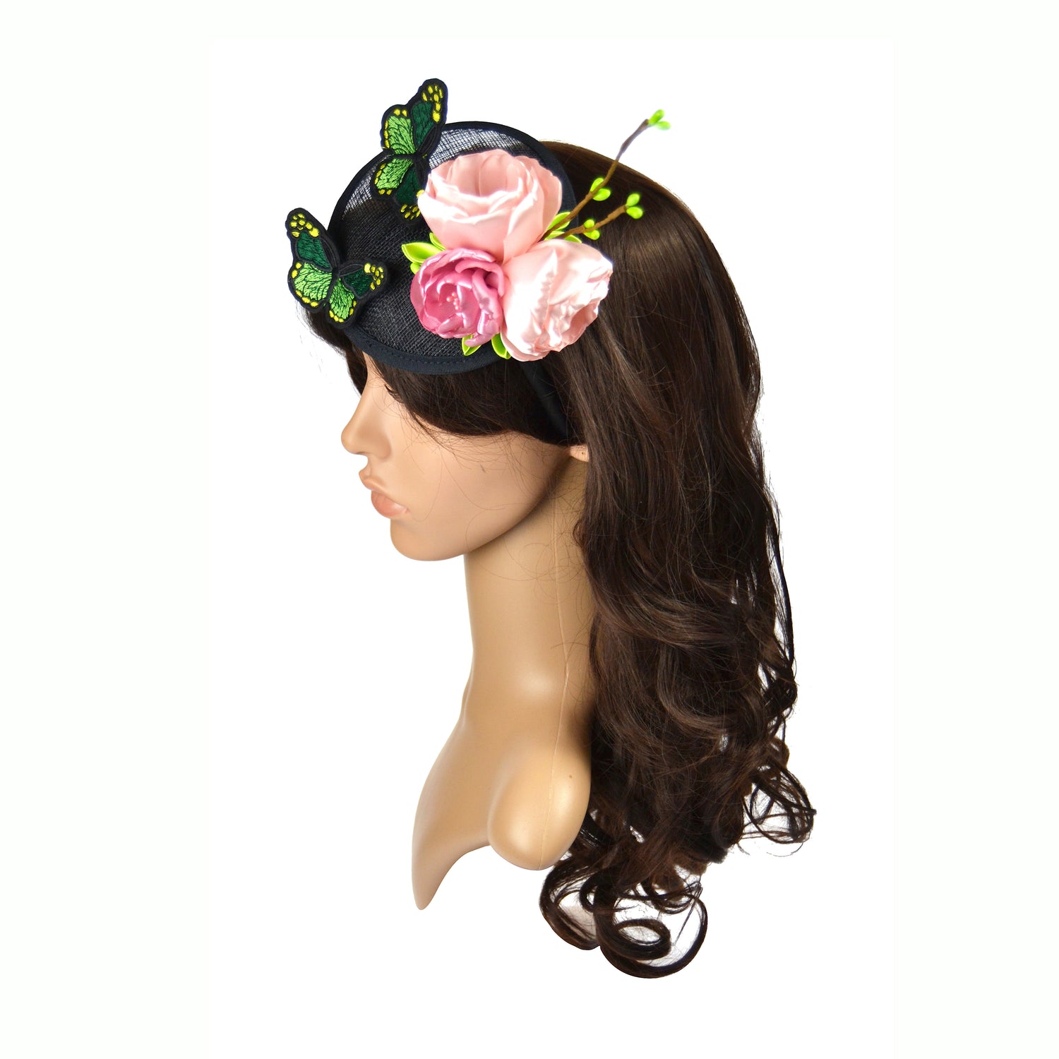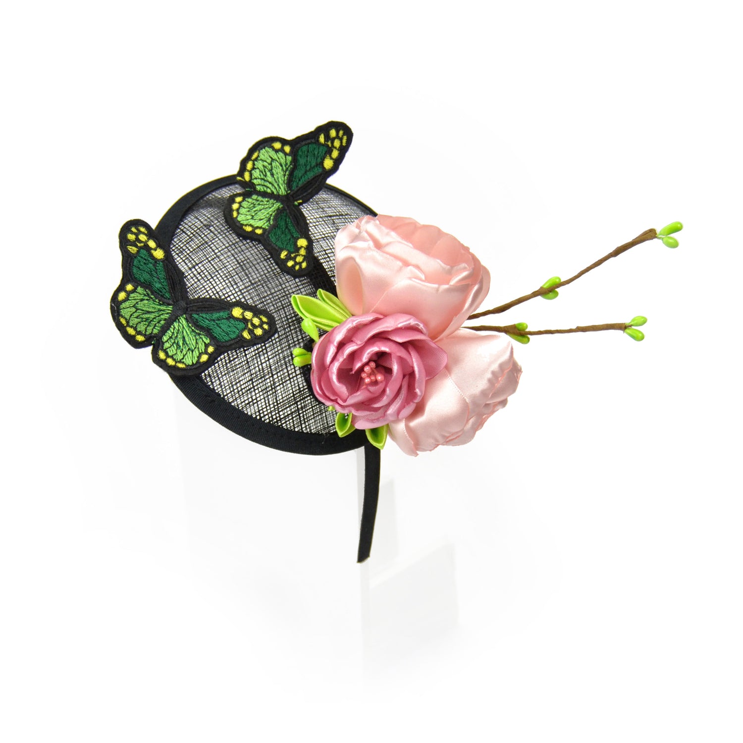 Frisch und strahlend schön ist dieser Fascinator mit üppigen Blüten und gestickten Schmetterlingen.