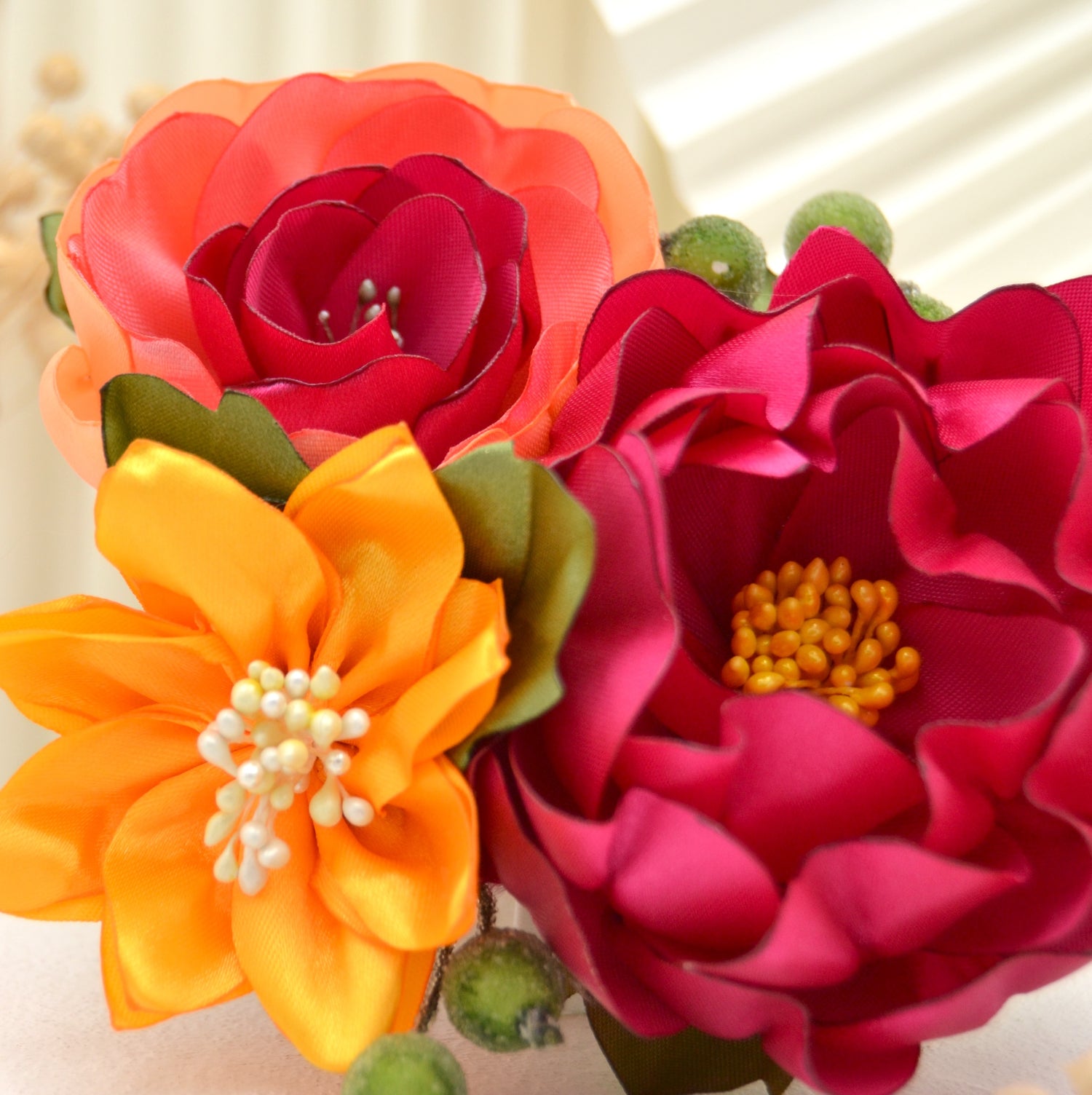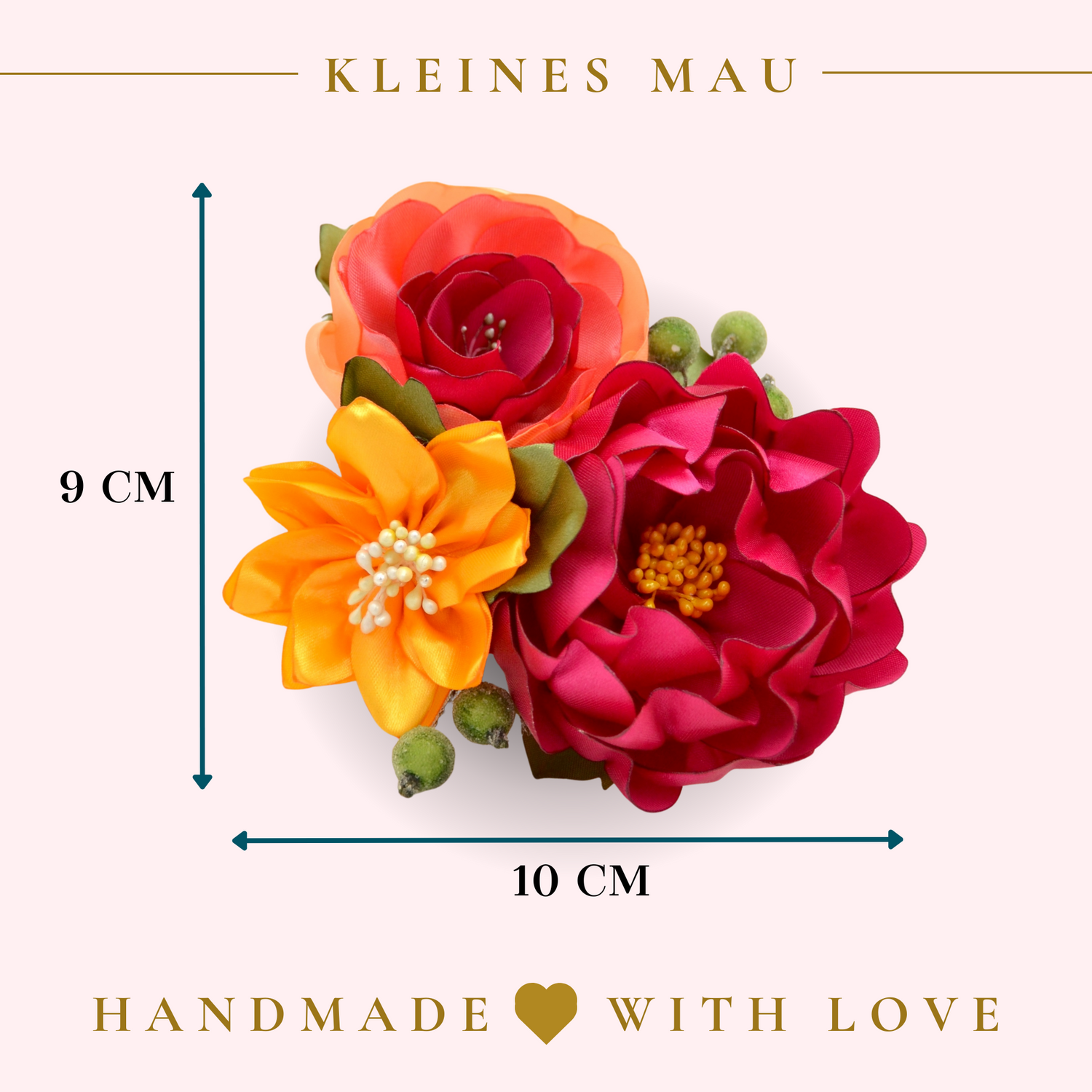 Tropischer Fascinator Haarclip "Exotic Trio" mit bunten handgefertigten Blüten aus Satin