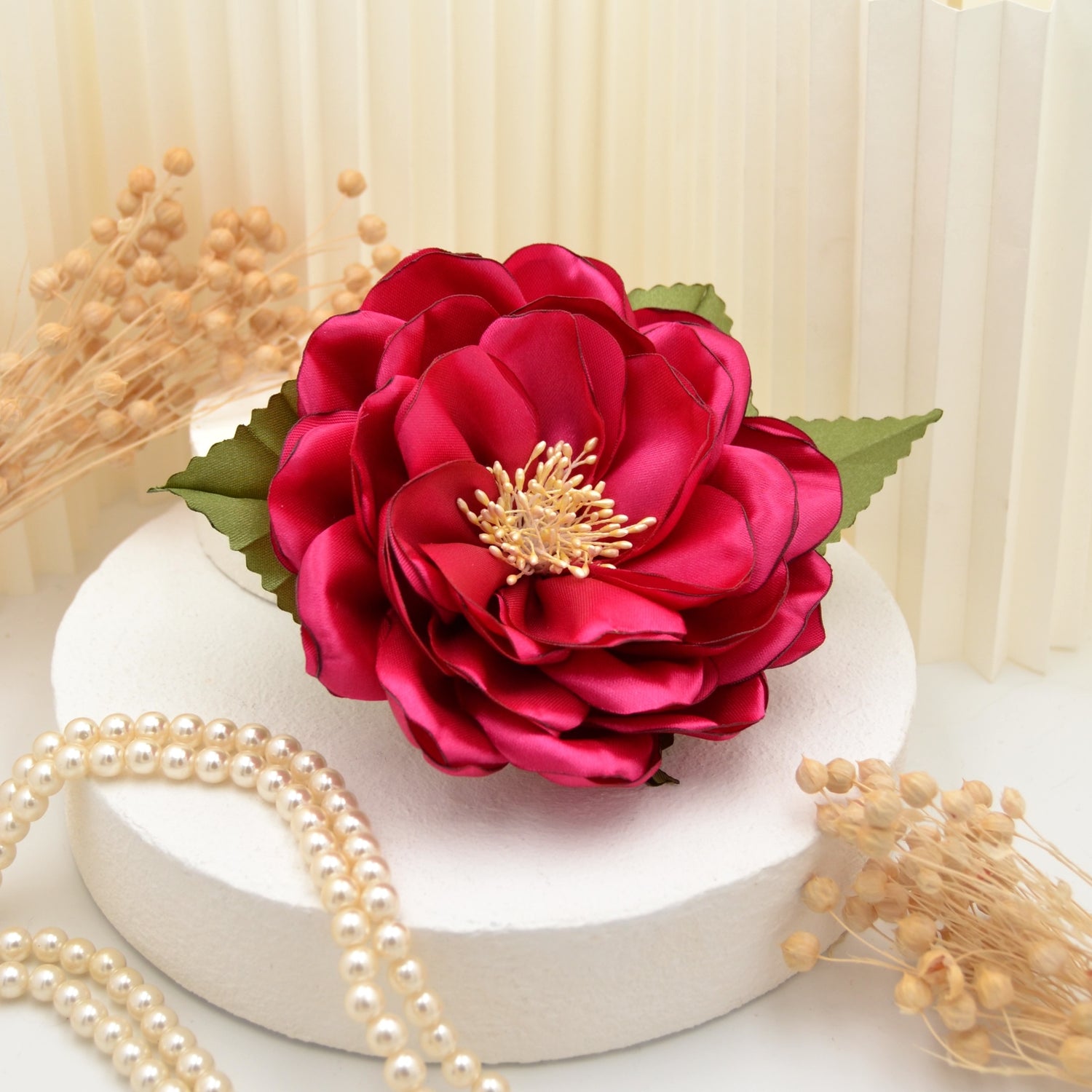 Diese üppige, dreidimensionale Blüte wurde von Hand gefertigt und verleiht deinem Outfit ein strahlenden, femininen Touch!