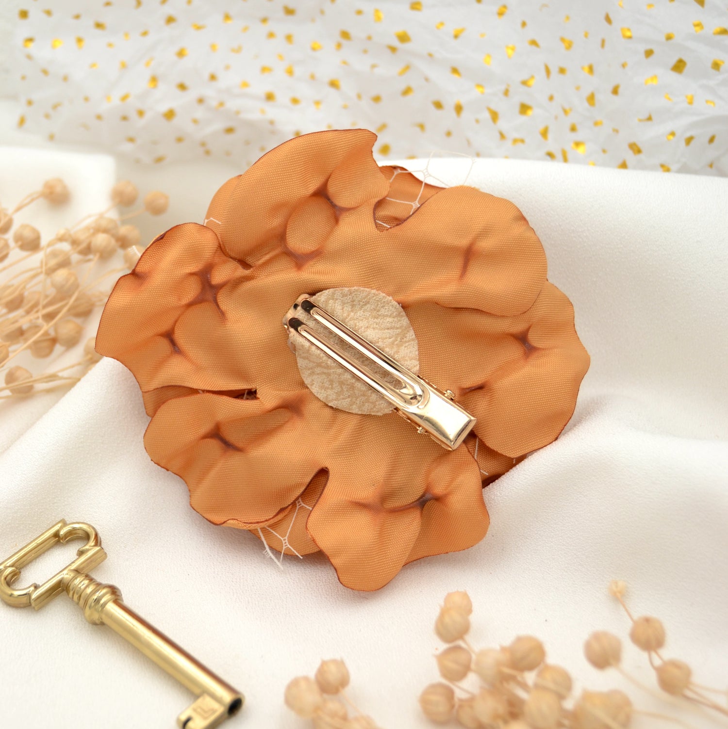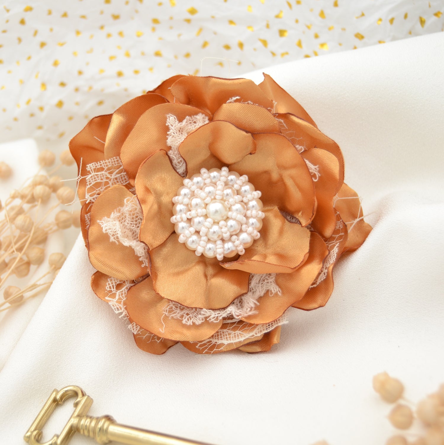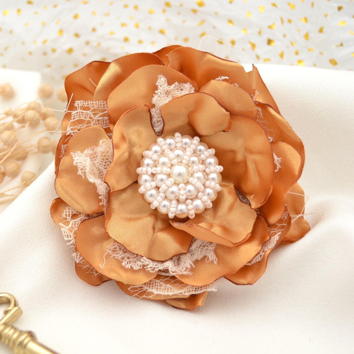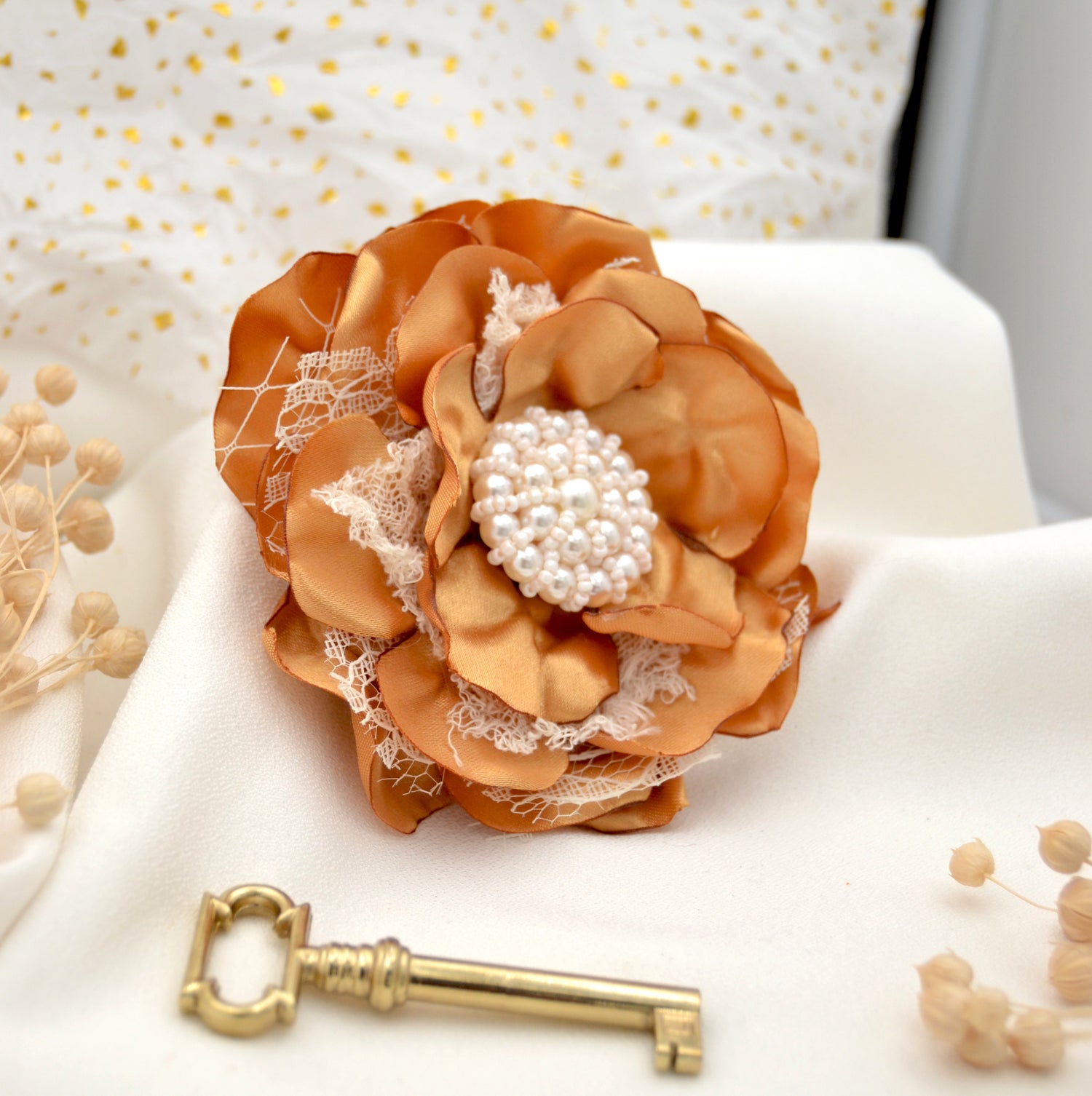 Verleihen Sie Ihrer Frisur einen Hauch von Vintage-Charme mit diesem wunderschönen Haarpin. Die Blüte ist aus einem Mix aus goldfarbenem Satin und cremefarbener Spitze gefertigt, was ihr einen einzigartigen und raffinierten Look verleiht.