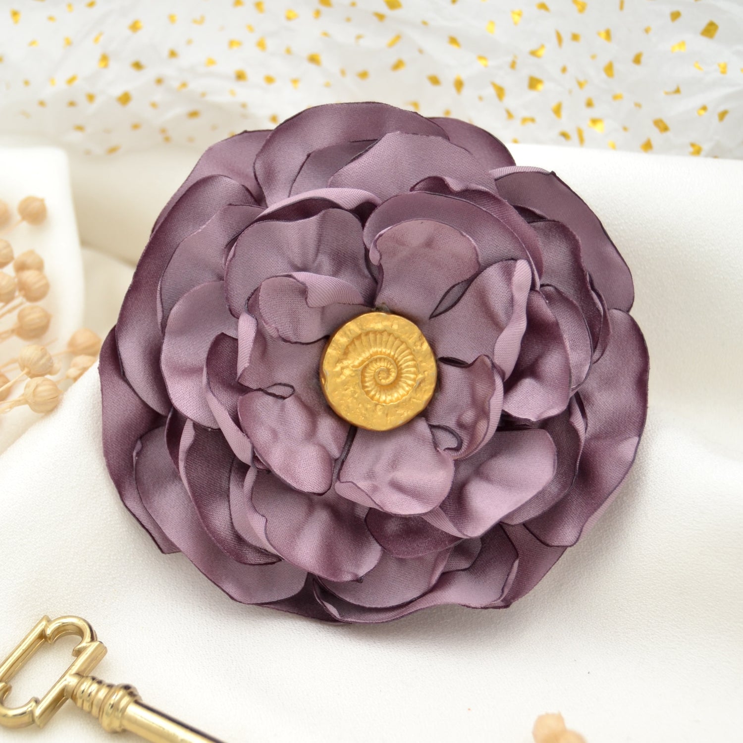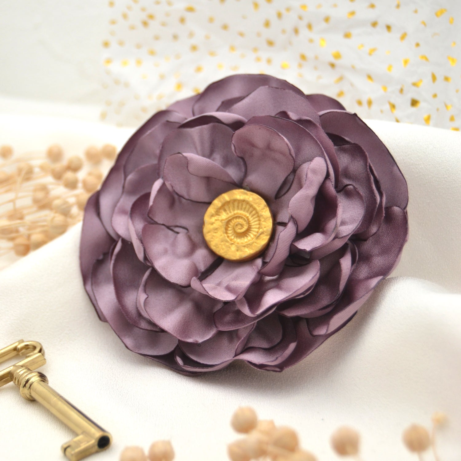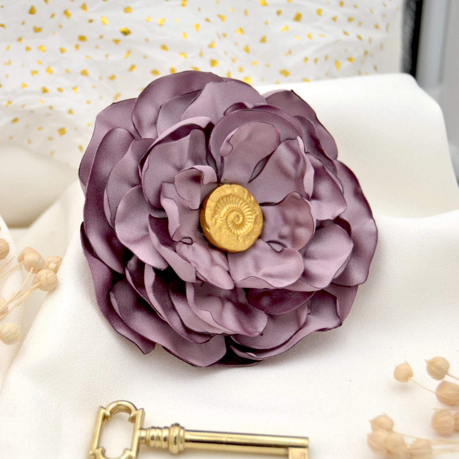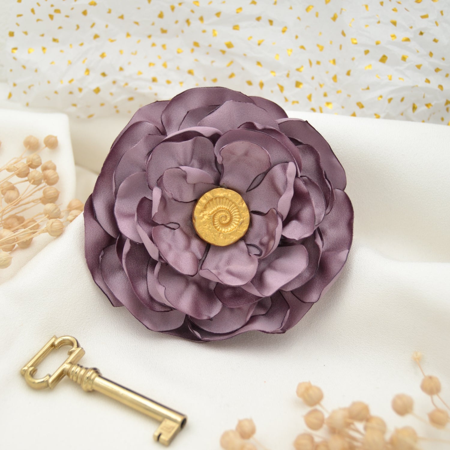 Verleihe deiner Frisur einen Hauch von Vintage-Charme mit diesem wunderschönen Haarclip. Die Blüte ist aus semi-mattem lila Satin gefertigt und trägt in der Mitte einen wunderschönen goldfarbenen Cabochon. , was ihr einen einzigartigen und raffinierten Look verleiht.
