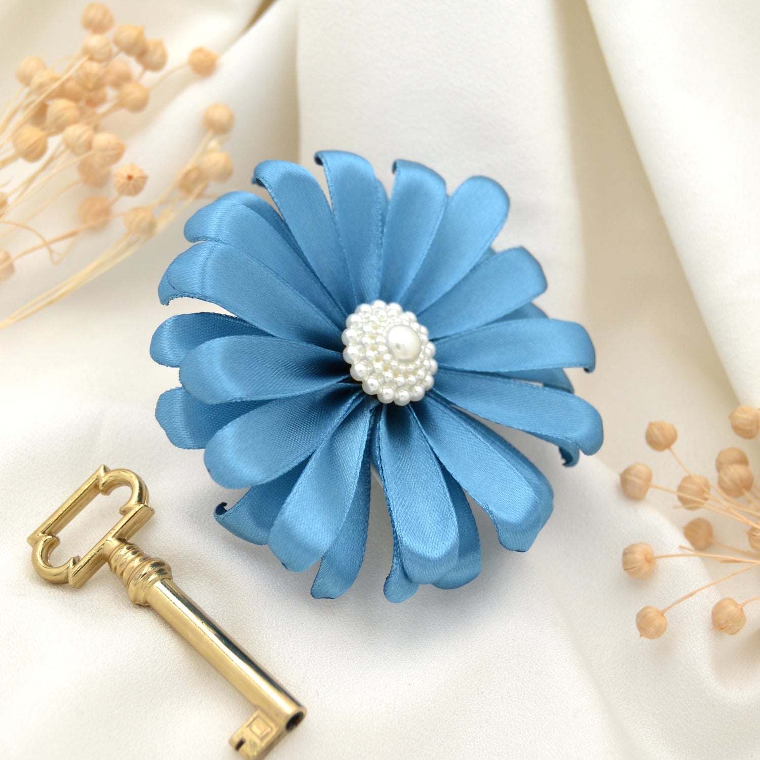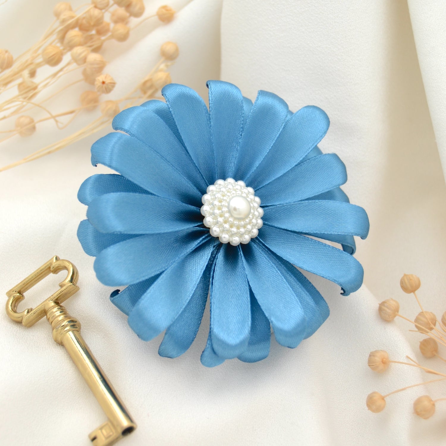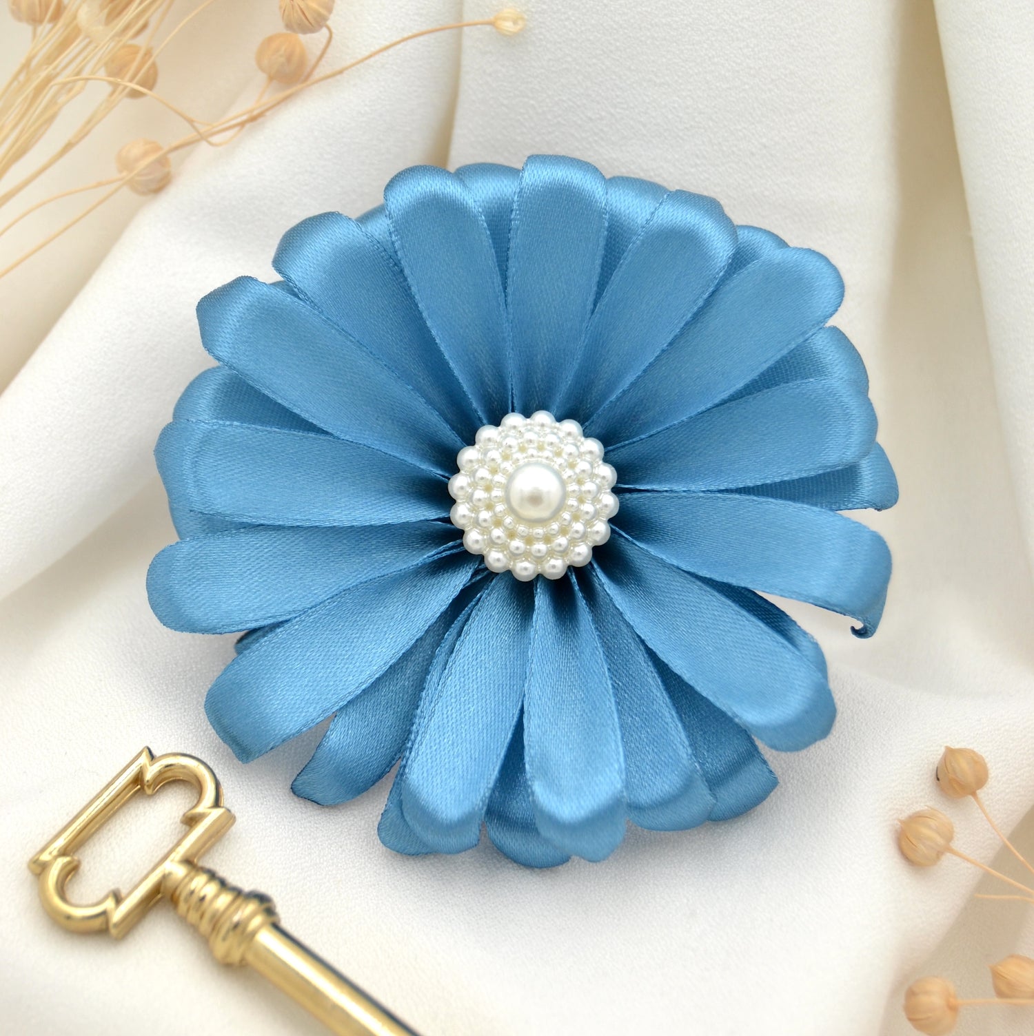 Diese blaue, einer echten Gerbera inspirierten, handgefertigte Satinblüte bringt deinen Look zum leuchten!