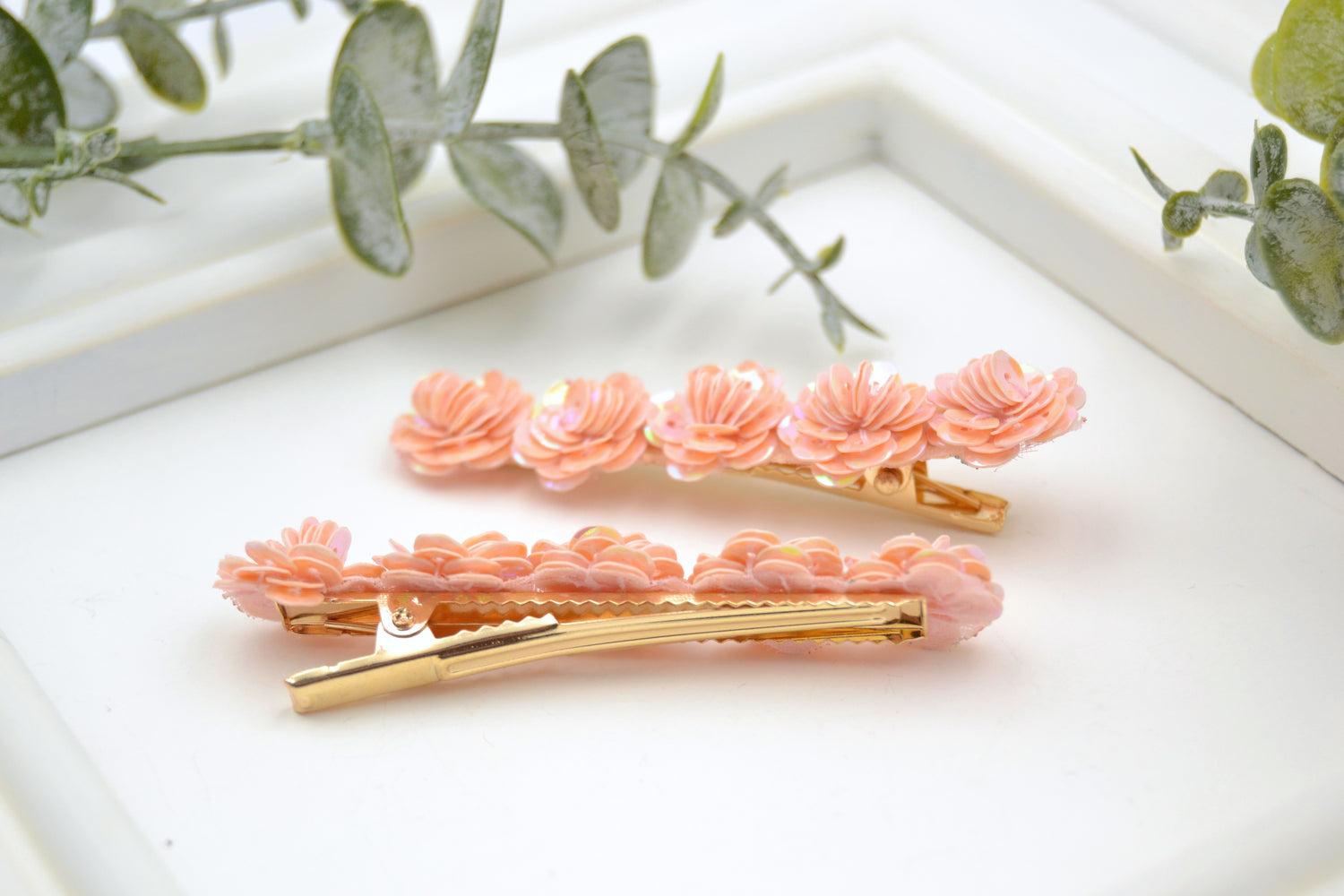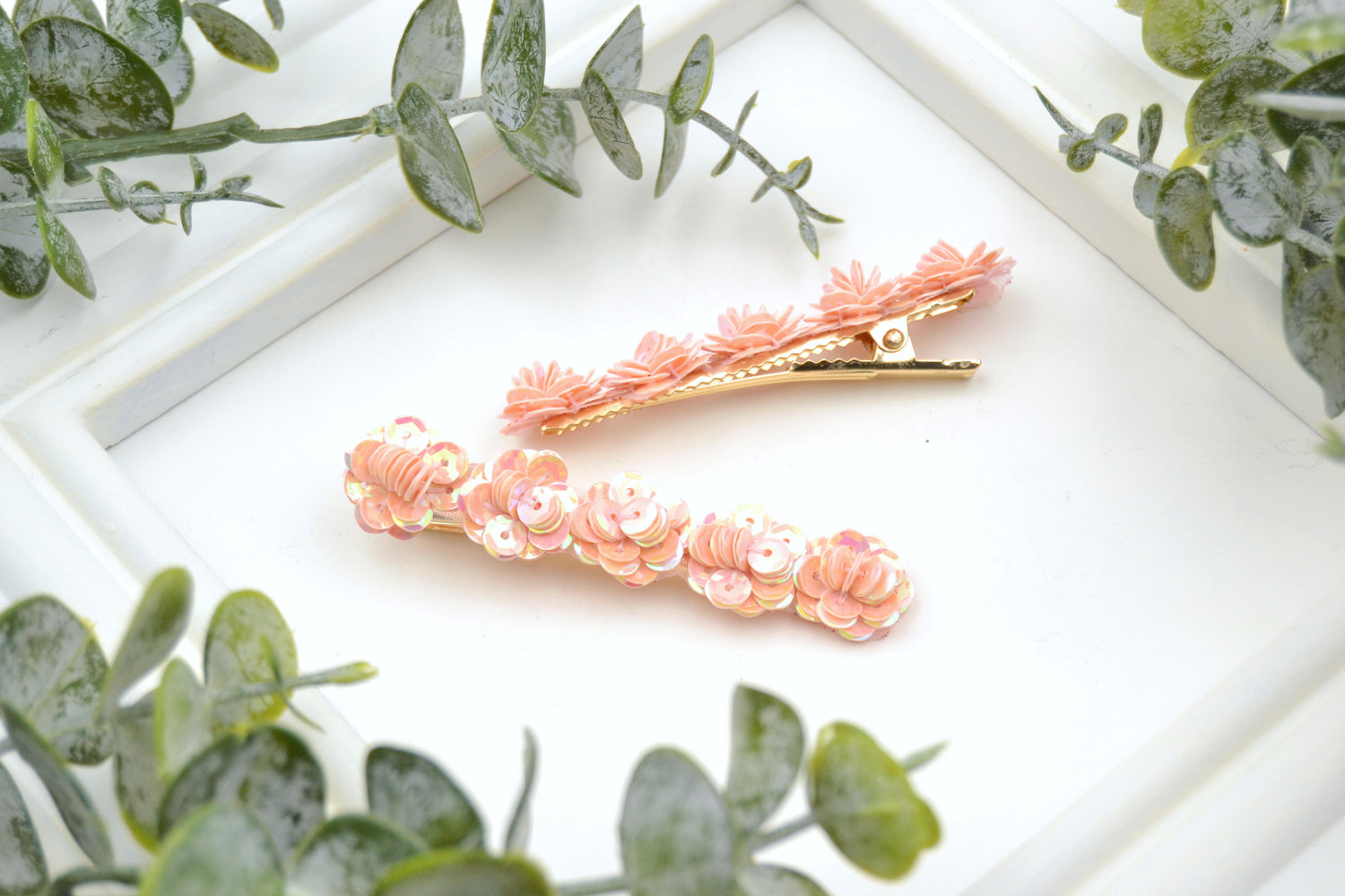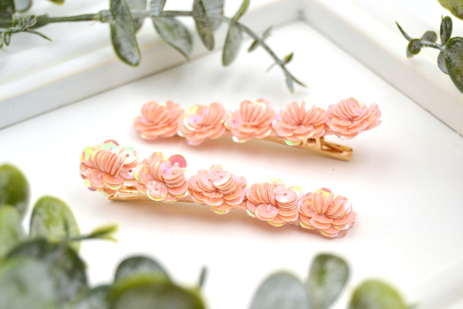 Mit diesem Set aus zwei goldenen Haarspangen kannst du deine Frisur zum Funkeln bringen. Jede Haarspange trägt fünf kleine, pfirsichfarbene Paillettenblumen, die deiner Frisur einen Hauch von
