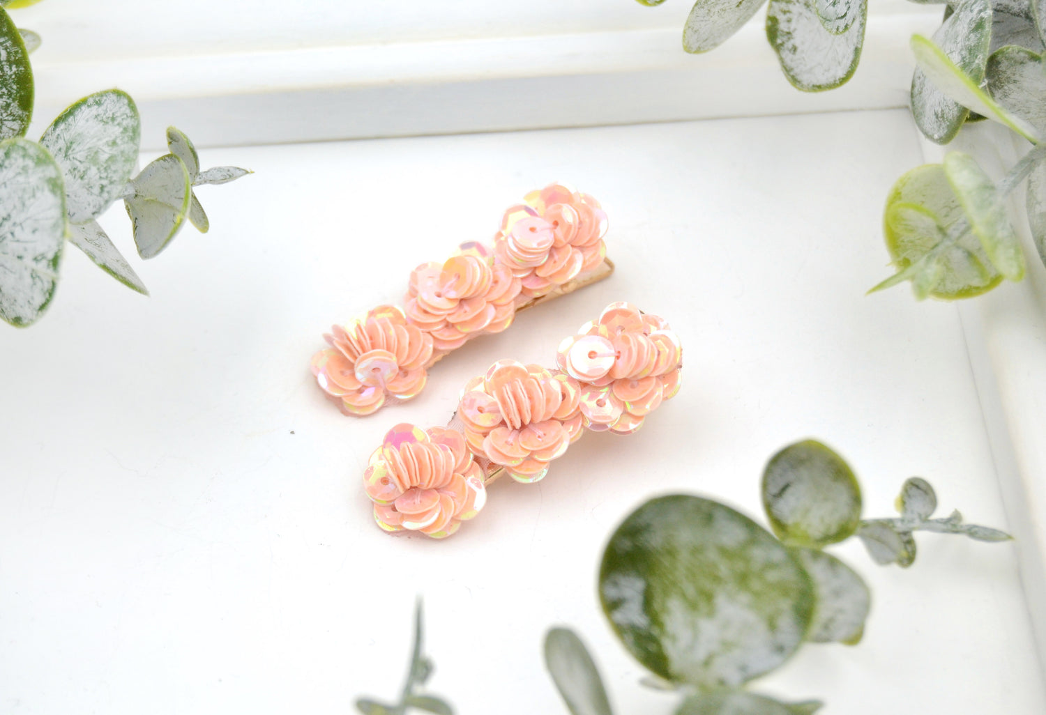Mit diesem Set aus zwei goldenen Haarspangen kannst du deine Frisur zum Funkeln bringen. Jede Haarspange trägt drei kleine, pfirsichfarbene Paillettenblumen, die deiner Frisur einen Hauch von