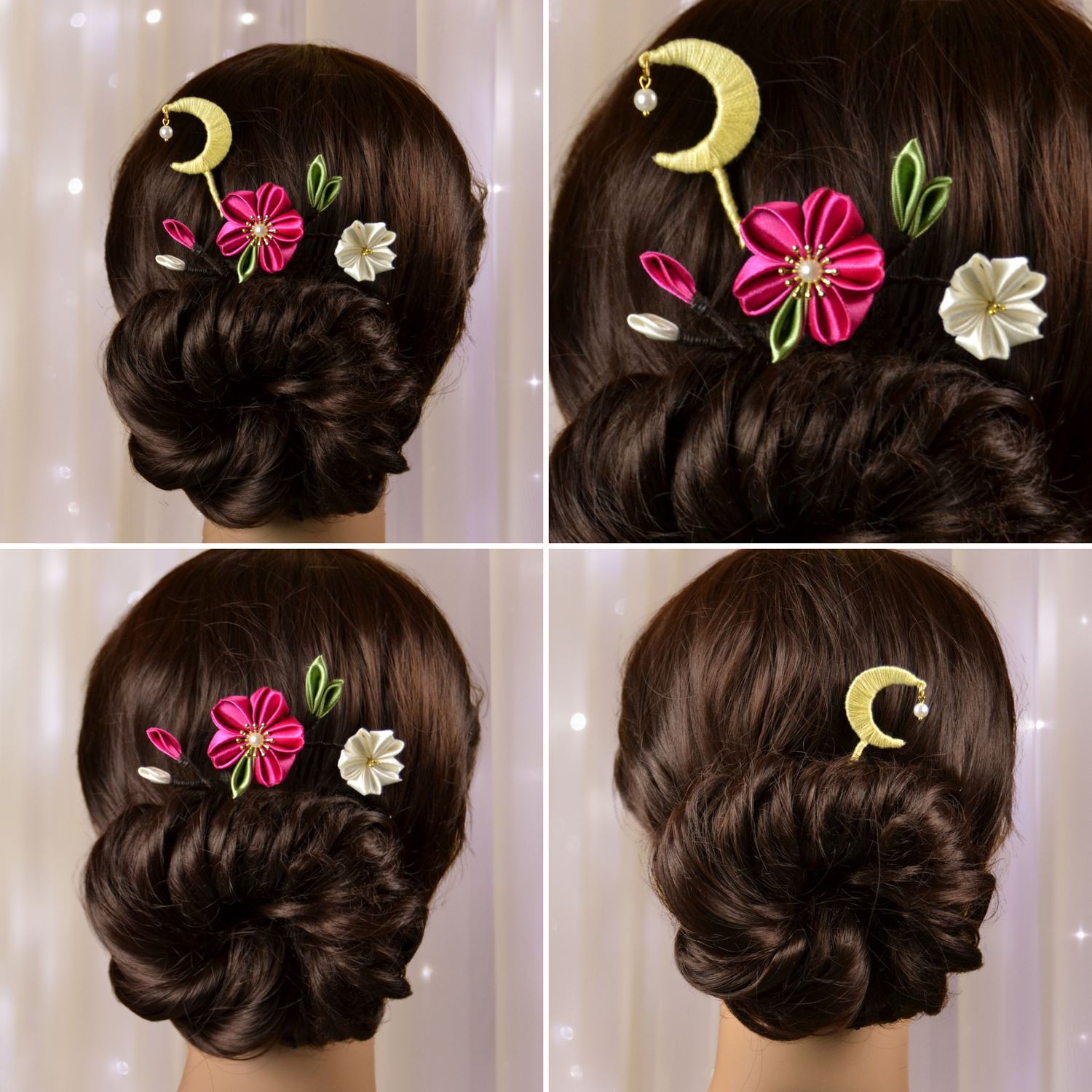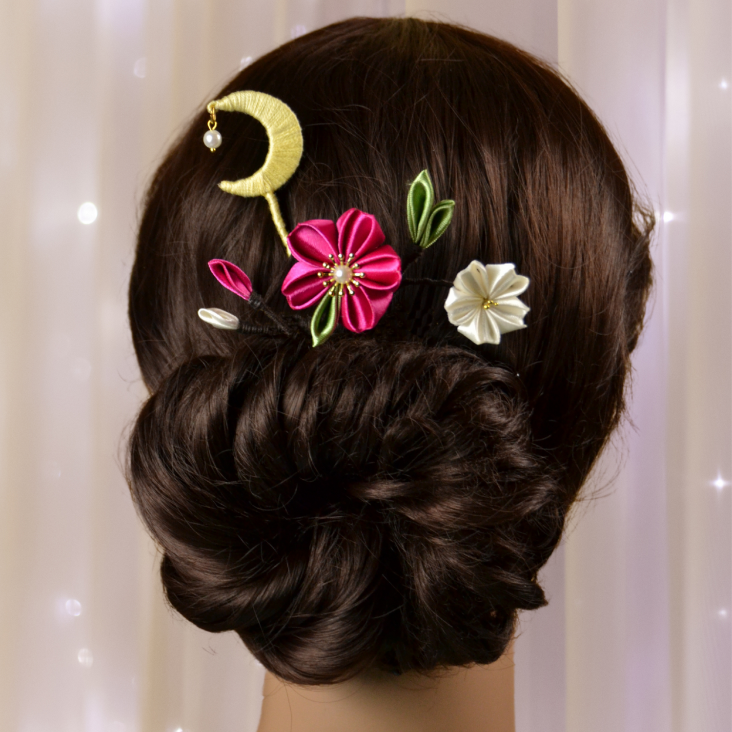 Hier präsentiere ich euch ein außergewöhnliches und vielfältiges Haarschmuck Set, bestehend aus einem Haarkamm mit Kanzashi Blüten und Knospen in Pink und Ivory umrankt von filigranen grünen Blättern und einer Haarnadel mit einem kleinen hellgelben Mond an dessen Spitze eine kleine Perle baumelt.