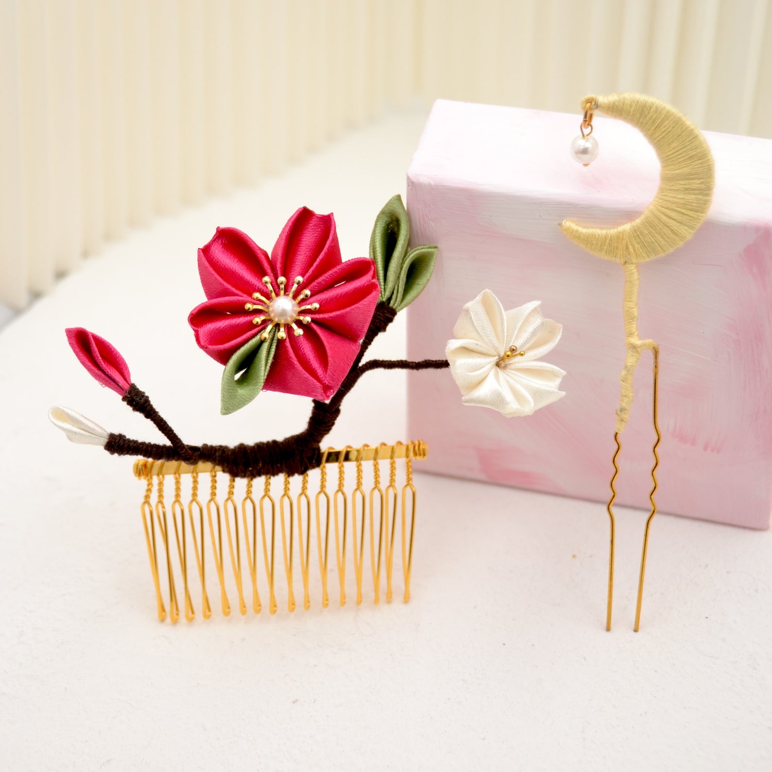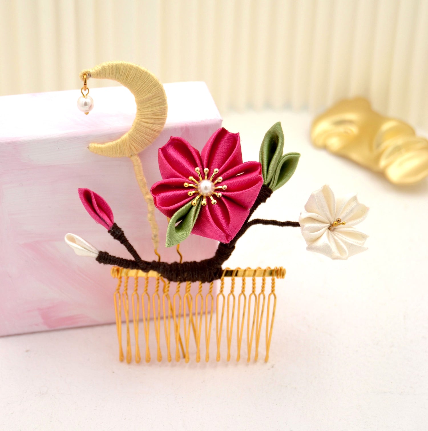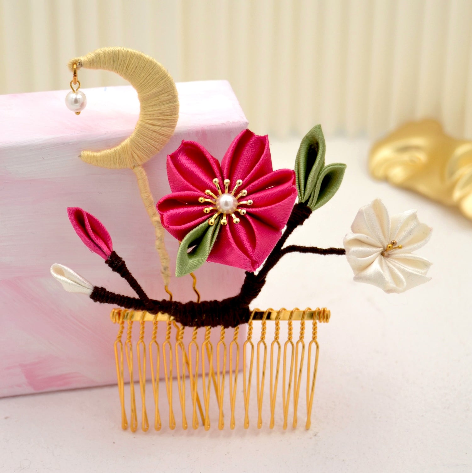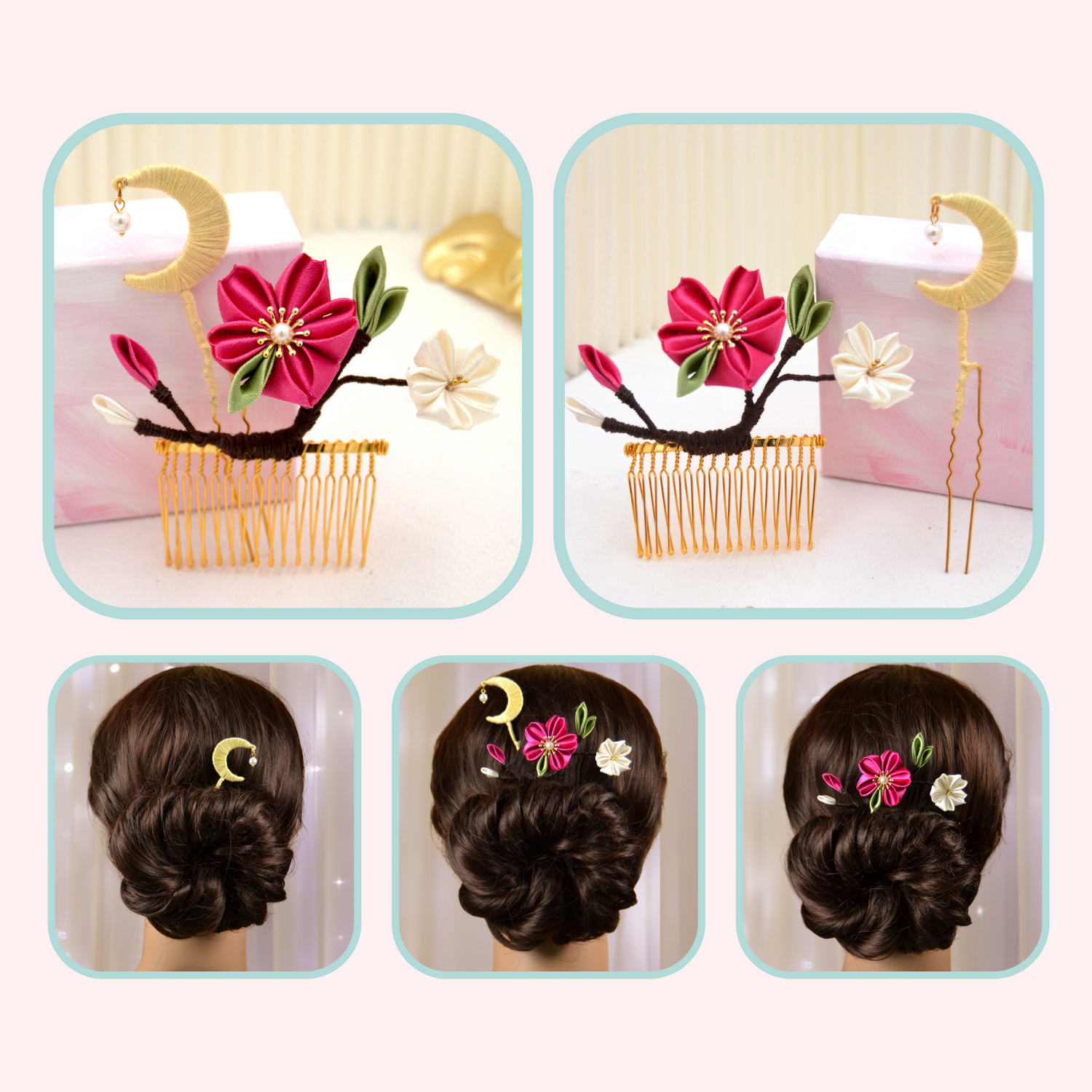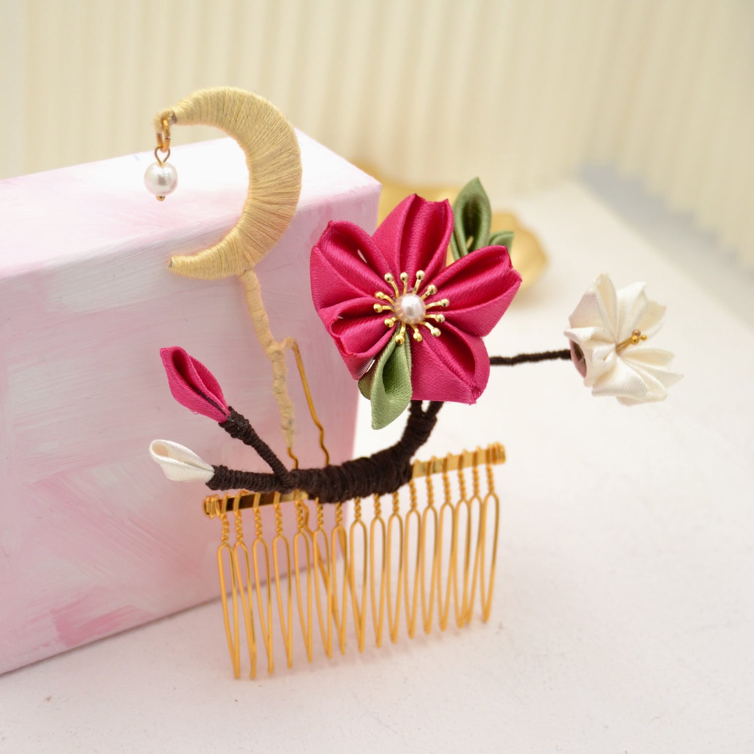 Blüten, Blätter und Knospen wurden alle in der traditionellen japanischen Kanzashi-Technik handgefaltet wurden. Die Blüten, Blätter und Knospen sind komplett verdrahtet und können dadurch in ihrer Ausrichtung noch justiert werden, was sie zu einem vielseitigen und anpassbaren Accessoire macht.