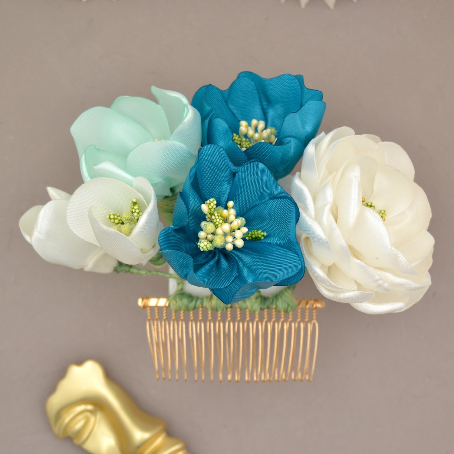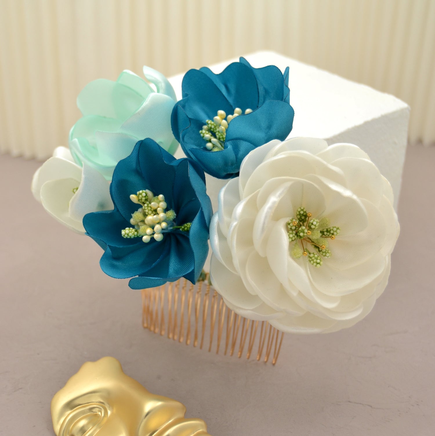 Entzückender, einzigartiger Haarkamm mit einem Bouquet aus sechs handgefertigten Blüten aus Satin. Dieses Accessoire wurde inspiriert von den leuchtenden Farben des Meeres und der frischen Briese der See.
