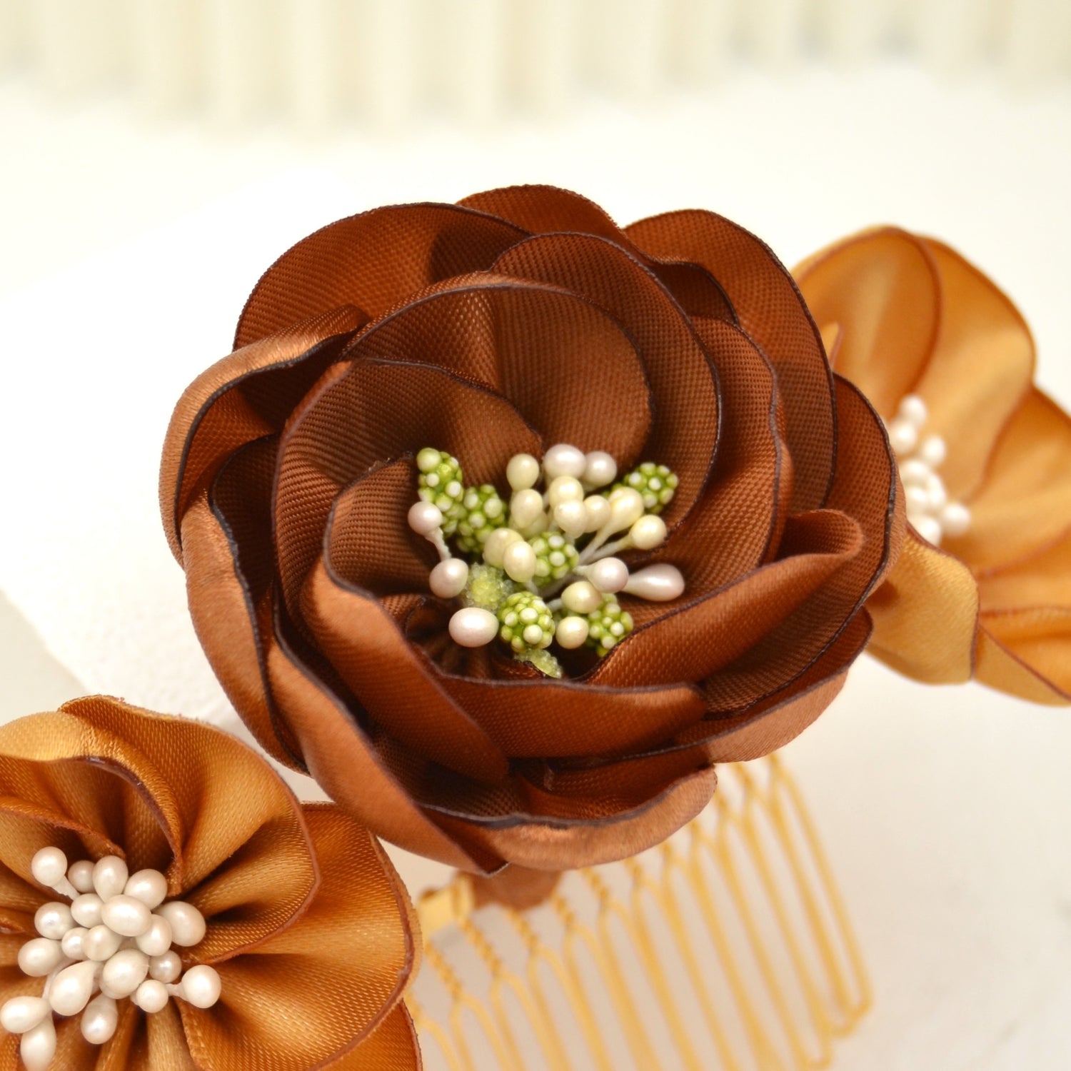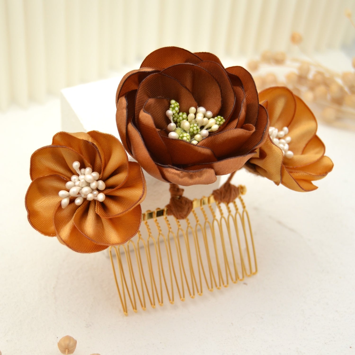 Dieses wunderschöne Stück besteht aus einem goldfarbenen Metallkamm, der drei romantische, goldfarbene und braune Blumen trägt.