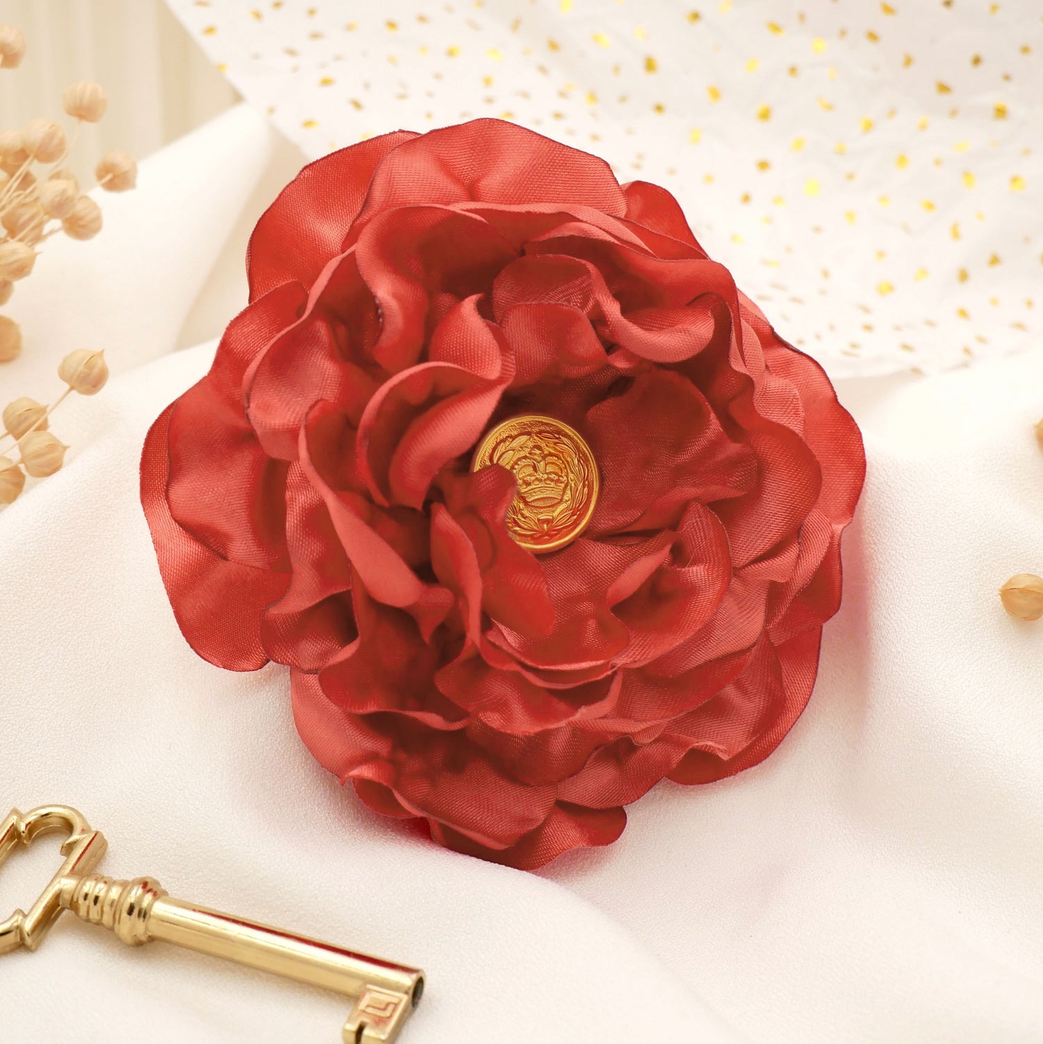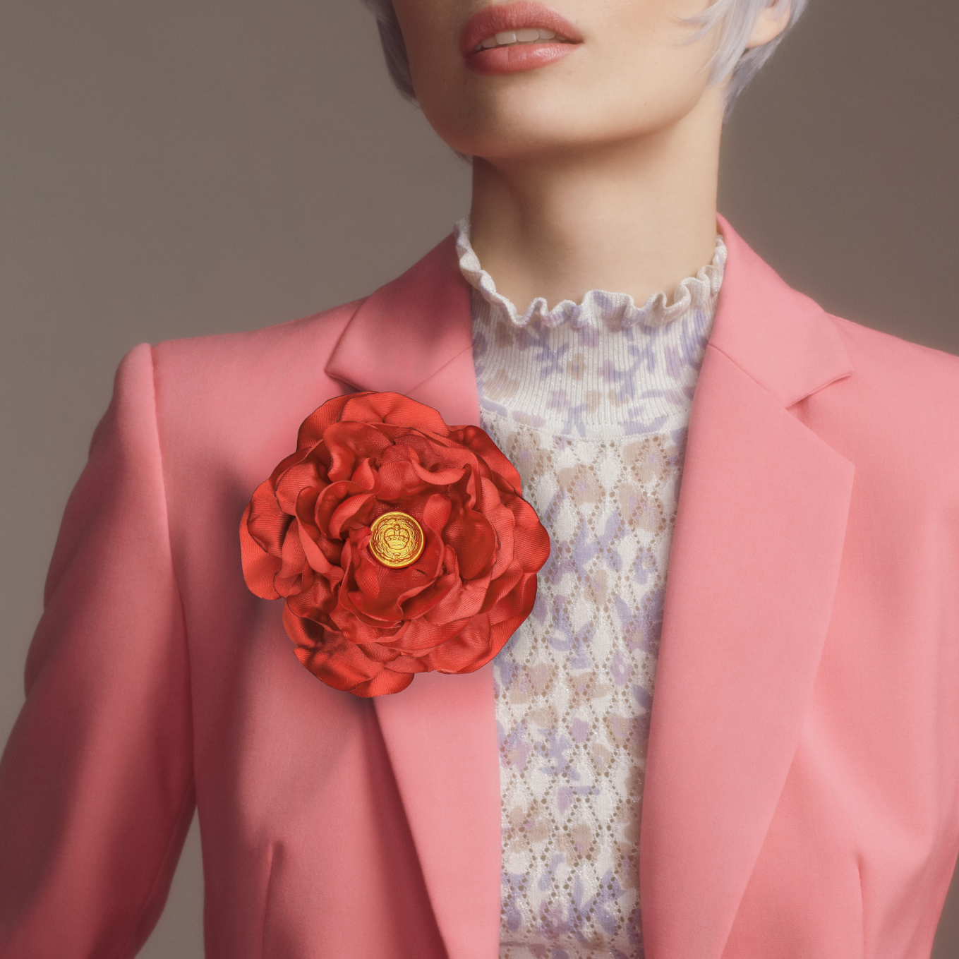 Dieser strahlende, orangerote Blüten-Brosche aus Satin ist das perfekte Accessoire für warme und romantische Herzen.