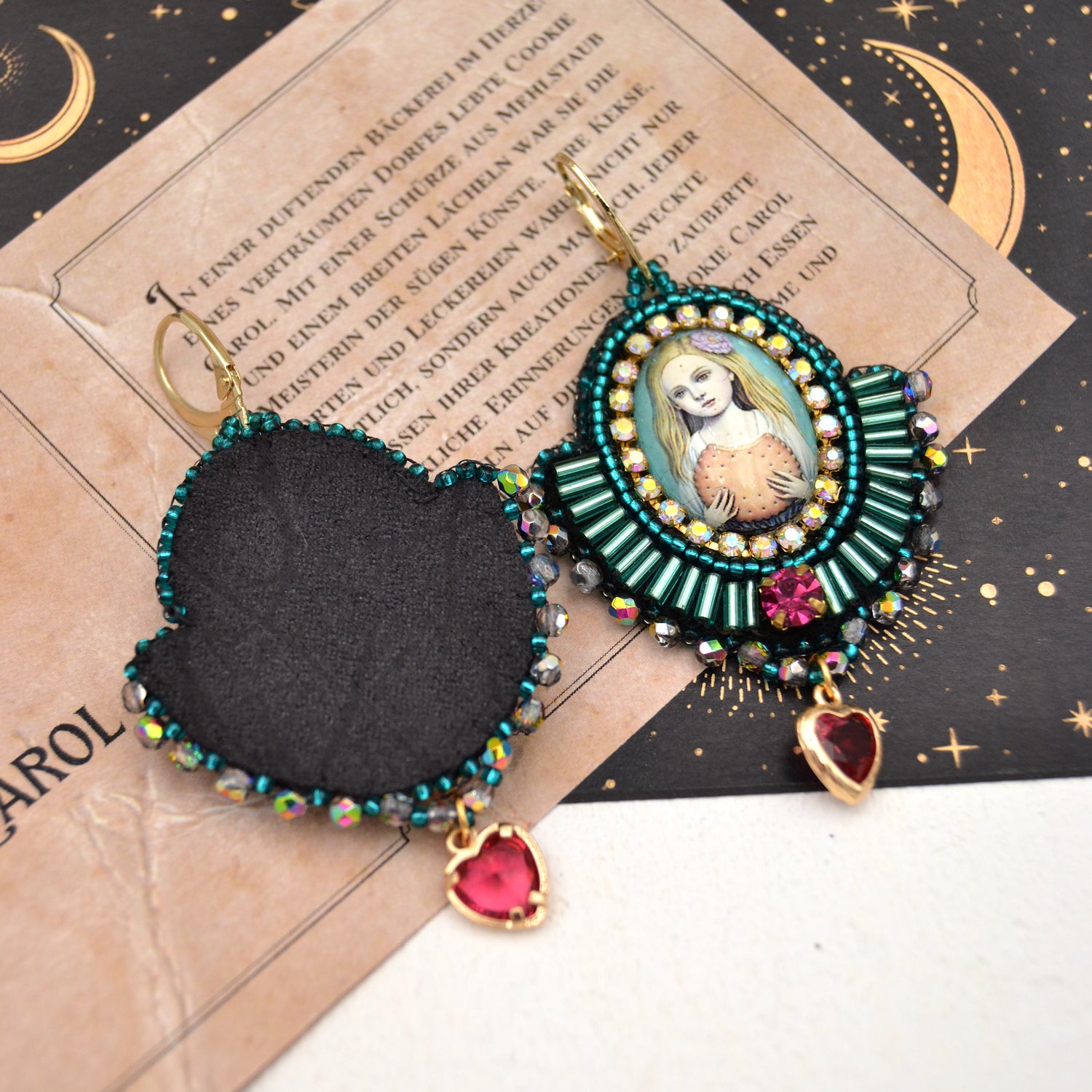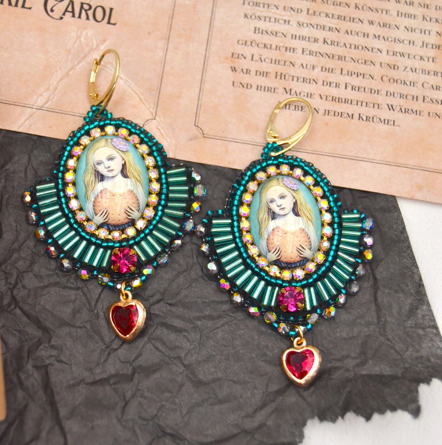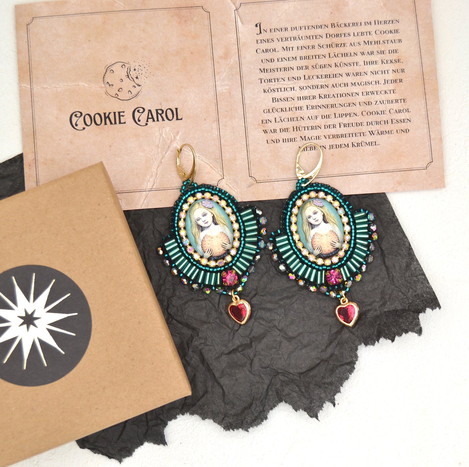 Trage den zauberhaften Geist von "Cookie Carol" mit unseren entzückenden Ohrringen. Diese einzigartigen Stücke bringen die Magie einer duftenden Bäckerei in das Herz deines Stils. Jeder Ohrring präsentiert das bezaubernde Motiv von Cookie Carol, die in ihrer mehlbestäubten Schürze und mit einem breiten Lächeln die süßen Künste beherrscht. Ein kunstvoll umstickter Glascabochon ist von türkis- und petrolfarbenen Glasperlen umrahmt, die an die lebendige Aura von Köstlichkeiten erinnern. Ein bewegliches Kristallherz am unteren Ende der Ohrringe fängt das Licht ein und tanzt bei deinen Bewegungen, während du die Freude und Wärme von "Cookie Carol" mit dir trägst.