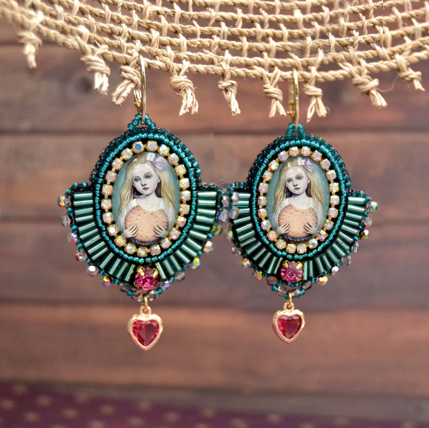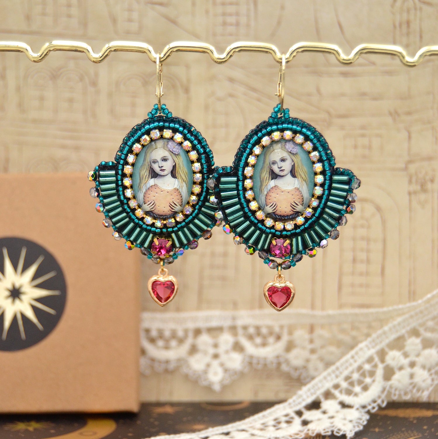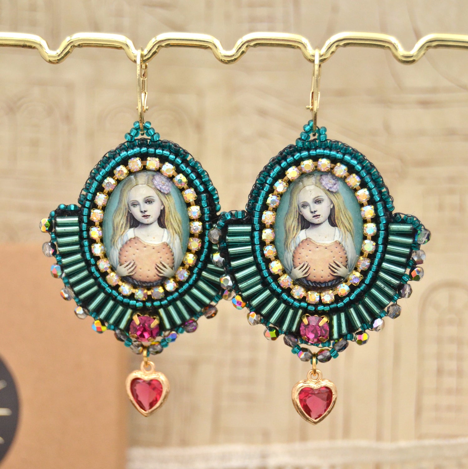 Trage den zauberhaften Geist von "Cookie Carol" mit unseren entzückenden Ohrringen. Diese einzigartigen Stücke bringen die Magie einer duftenden Bäckerei in das Herz deines Stils. Jeder Ohrring präsentiert das bezaubernde Motiv von Cookie Carol, die in ihrer mehlbestäubten Schürze und mit einem breiten Lächeln die süßen Künste beherrscht. Ein kunstvoll umstickter Glascabochon ist von türkis- und petrolfarbenen Glasperlen umrahmt, die an die lebendige Aura von Köstlichkeiten erinnern. Ein bewegliches Kristallherz am unteren Ende der Ohrringe fängt das Licht ein und tanzt bei deinen Bewegungen, während du die Freude und Wärme von "Cookie Carol" mit dir trägst.