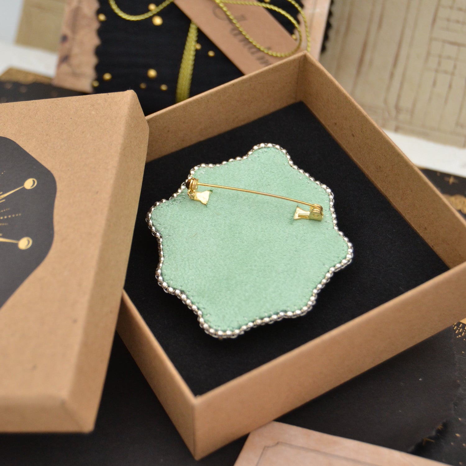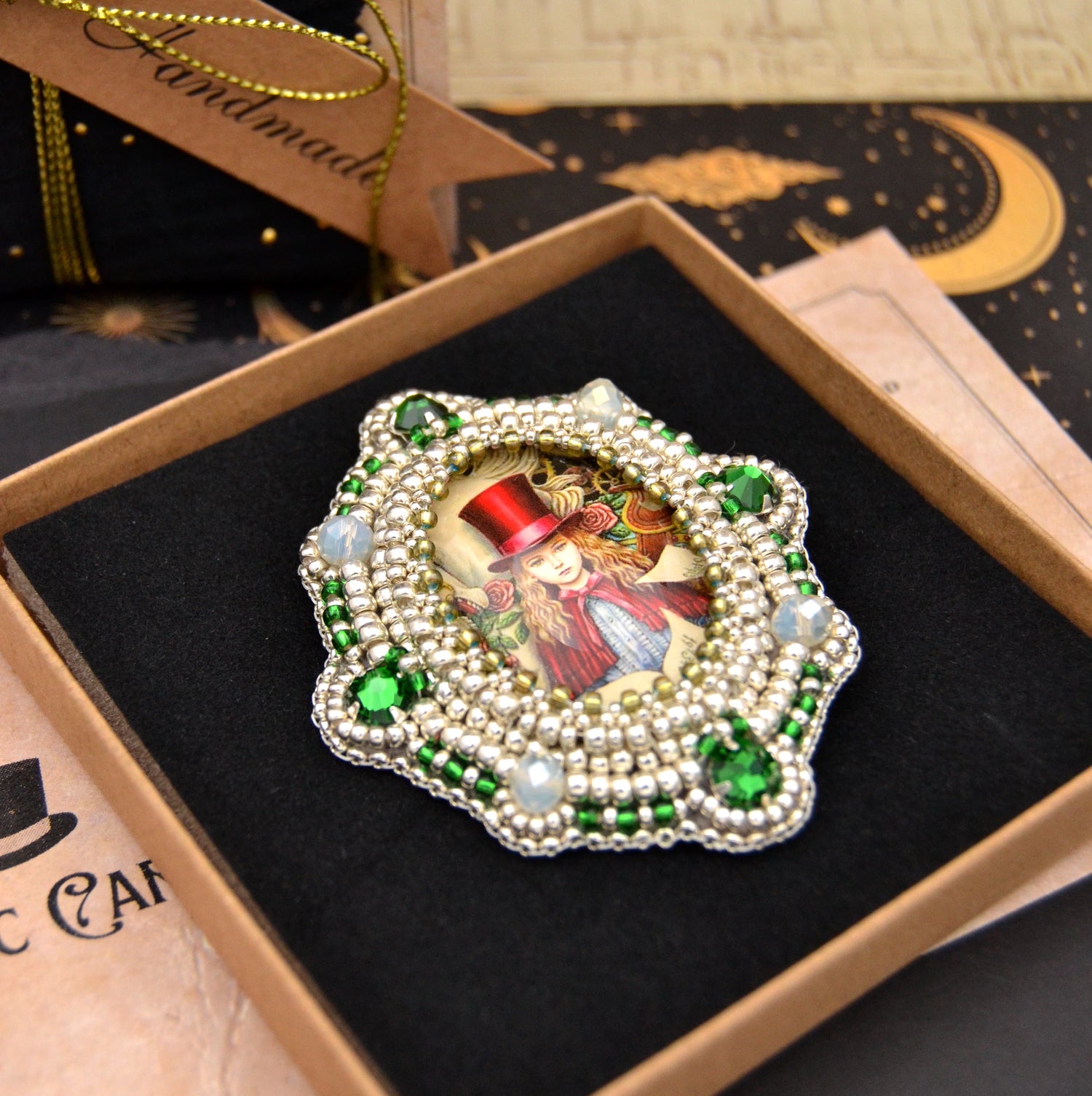 Der Glascabochon in der Mitte zeigt das fesselnde Motiv von Magic Carol selbst, während smaragdgrüne Kristalle und silberne, japanische Saatperlen den Cabochon umstickt umrahmen. Diese Elemente fangen das Licht ein und verleihen der Brosche eine geheimnisvolle Schönheit. Genauso wie Magic Carol die Grenzen zwischen Realität und Fantasie verschwimmen lassen konnte, wird auch diese Perlenbrosche dich in eine Welt voller Wunder entführen.