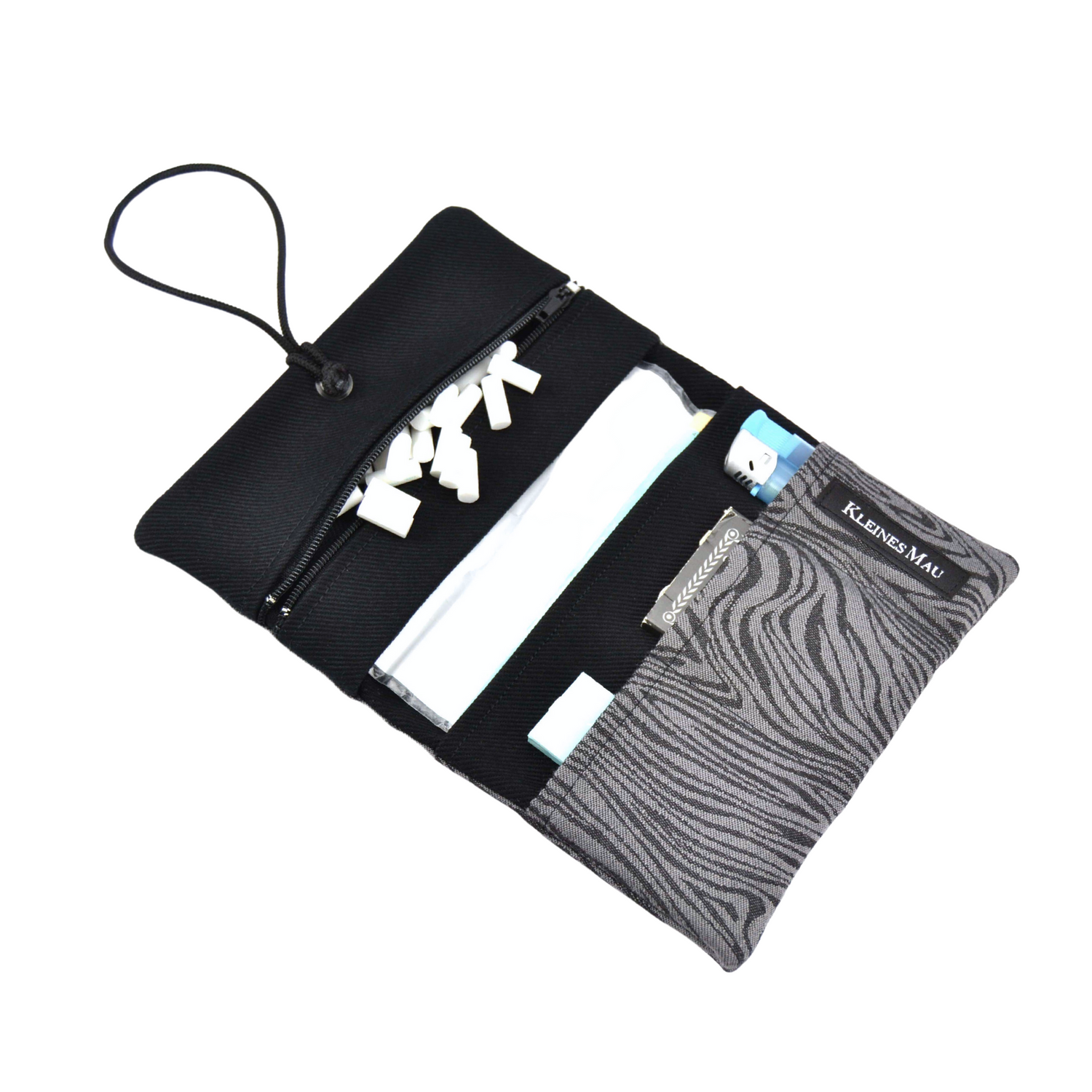 Der Beutel besteht aus einer Reißverschlußtasche, einem Fach für die Tabakpackung, sowie 3 Schubfächern für Papers, Feuerzeug oder was sonst noch mit muss.