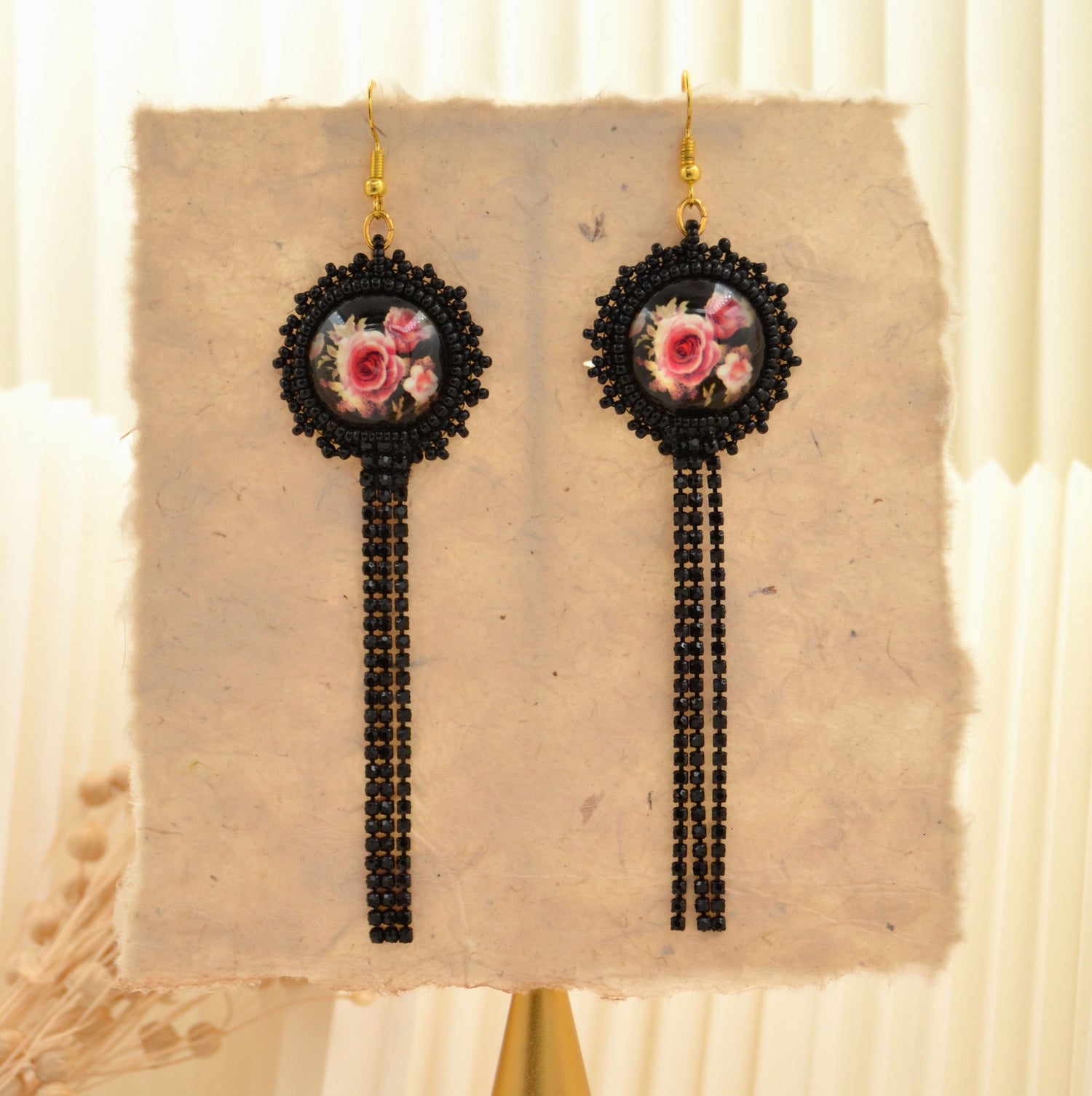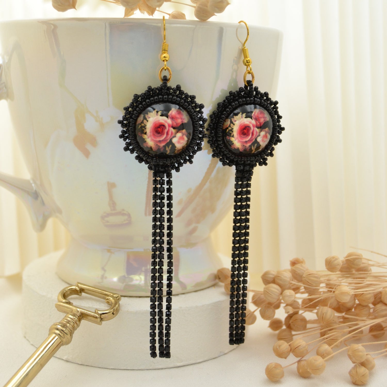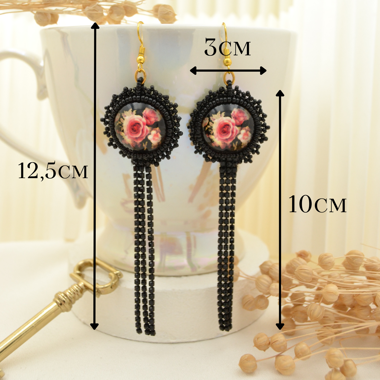 Lange Ohrringe "Eternal" romantisches Rosenmotiv mit schwarzen Perlen umstickt
