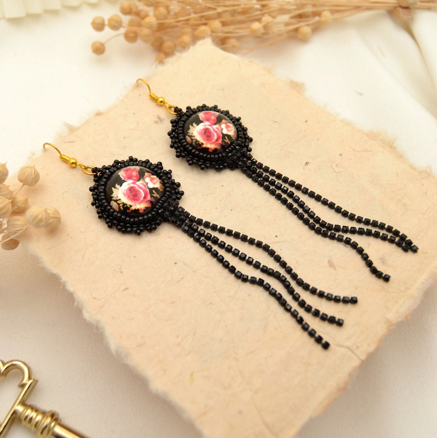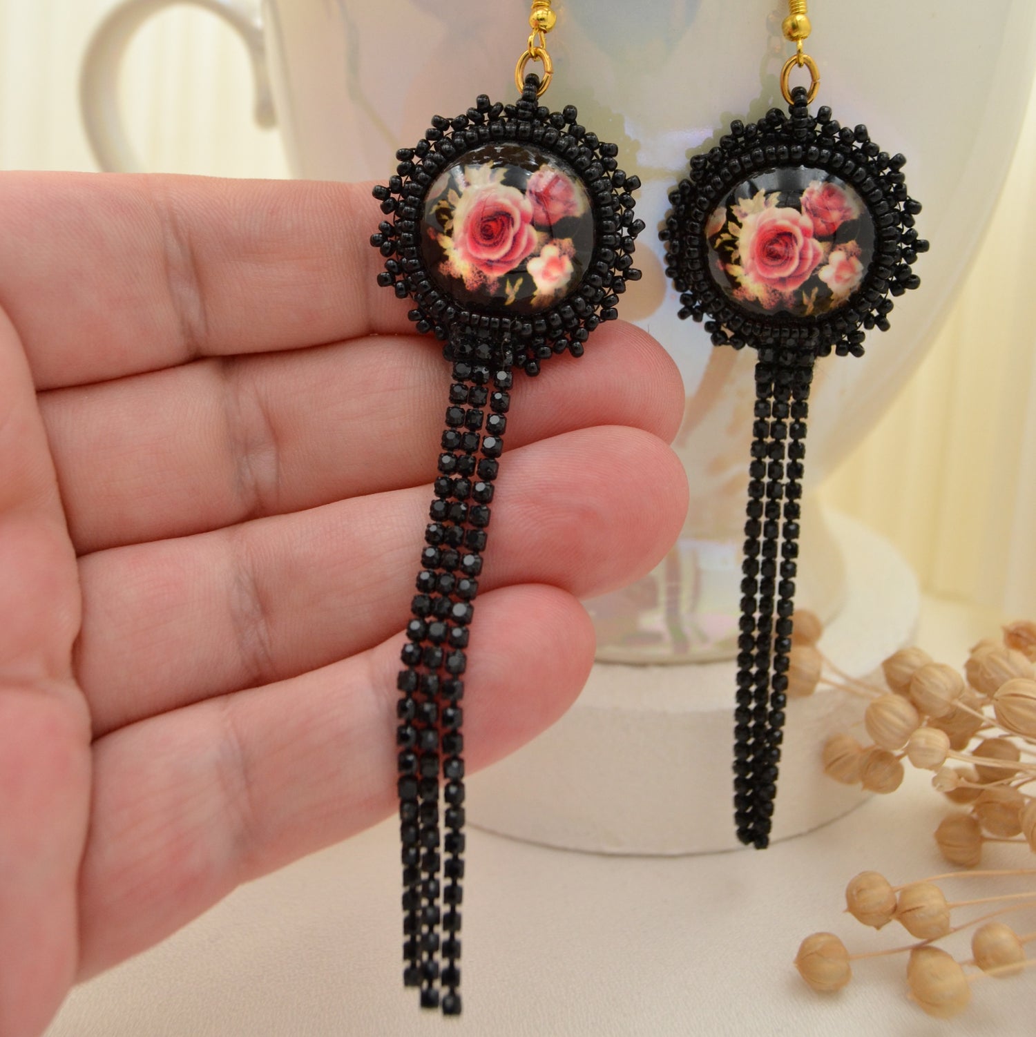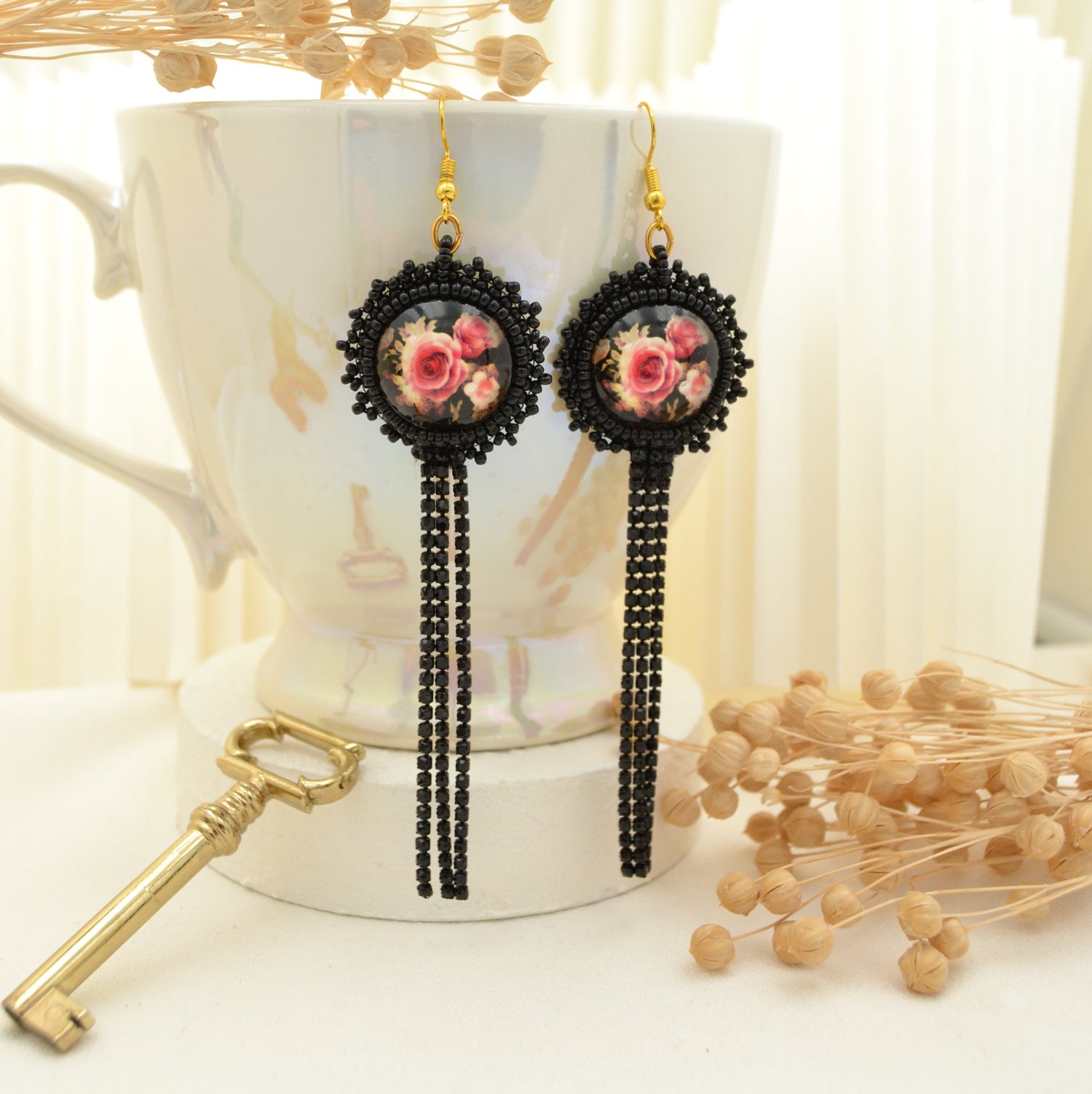 Lange Ohrringe "Eternal" romantisches Rosenmotiv mit schwarzen Perlen umstickt