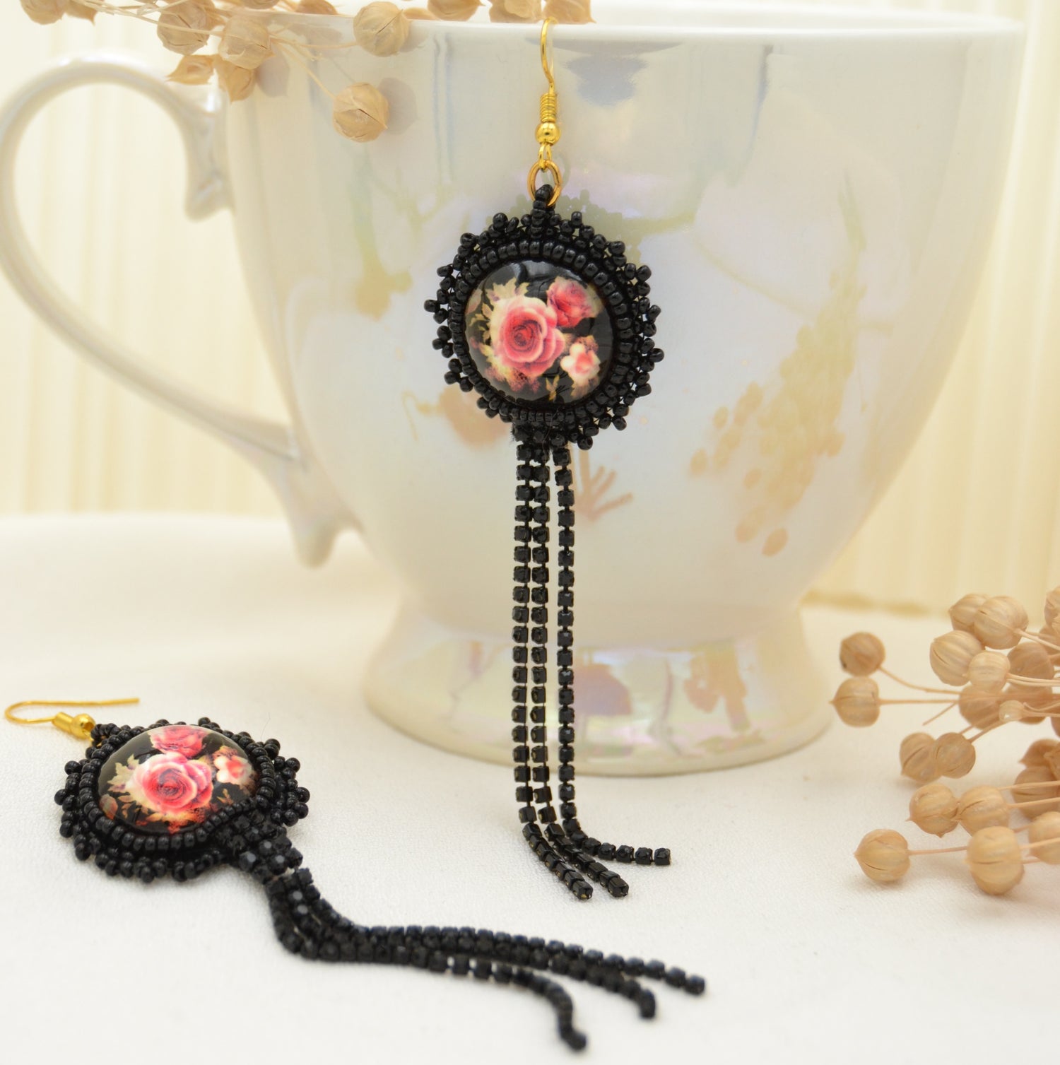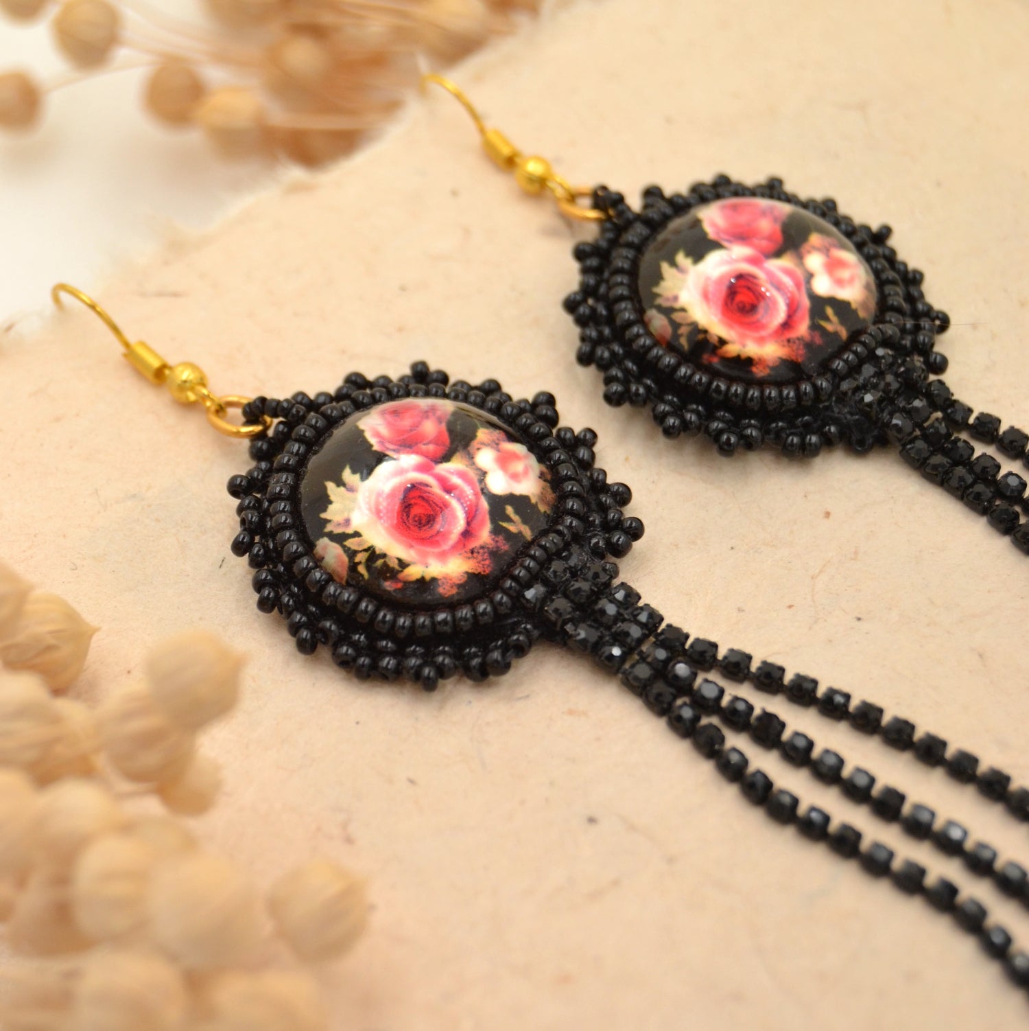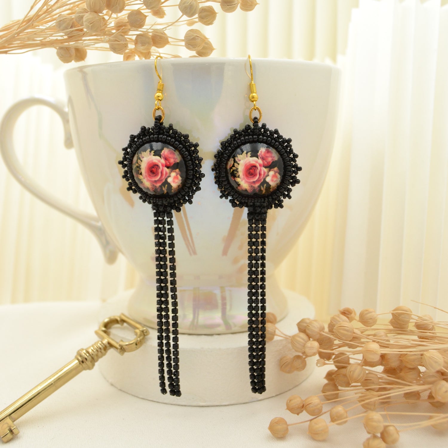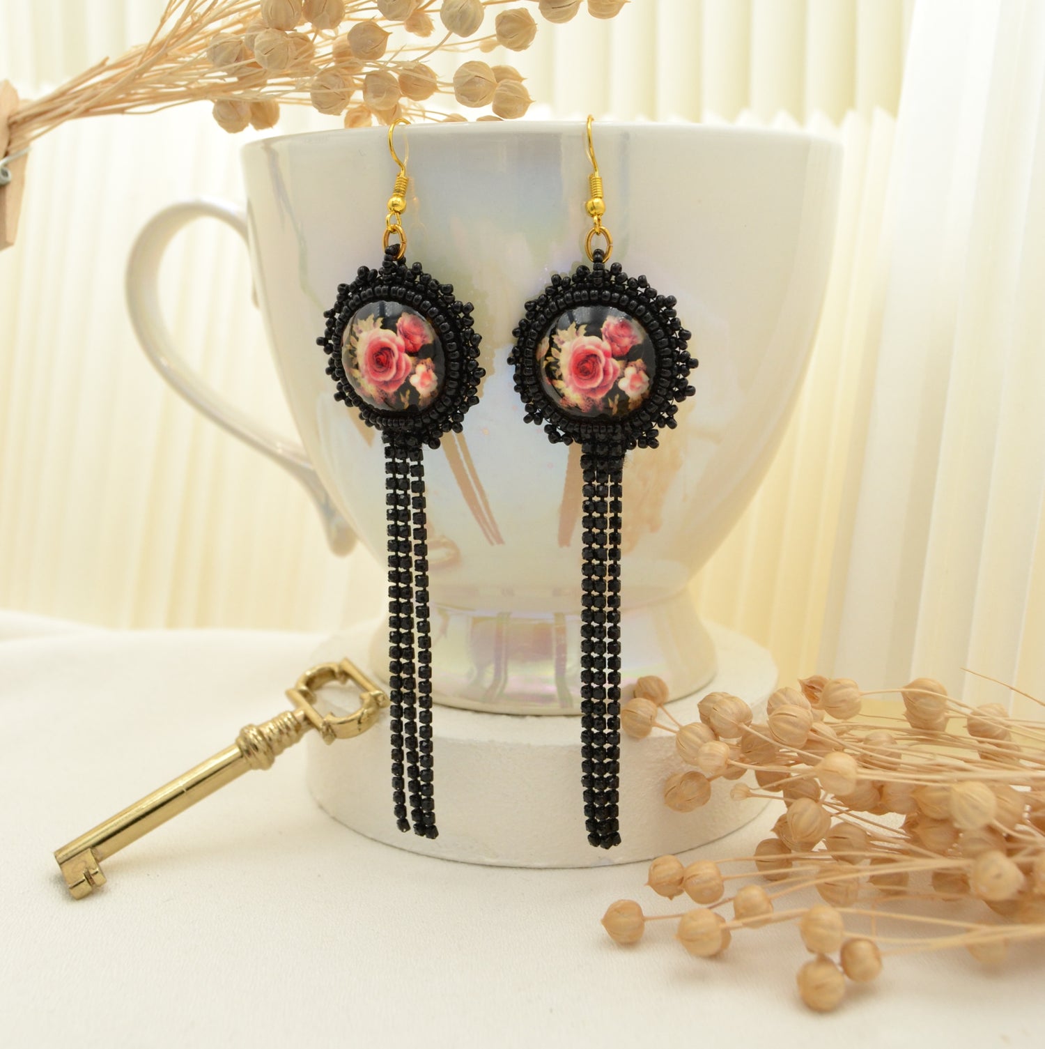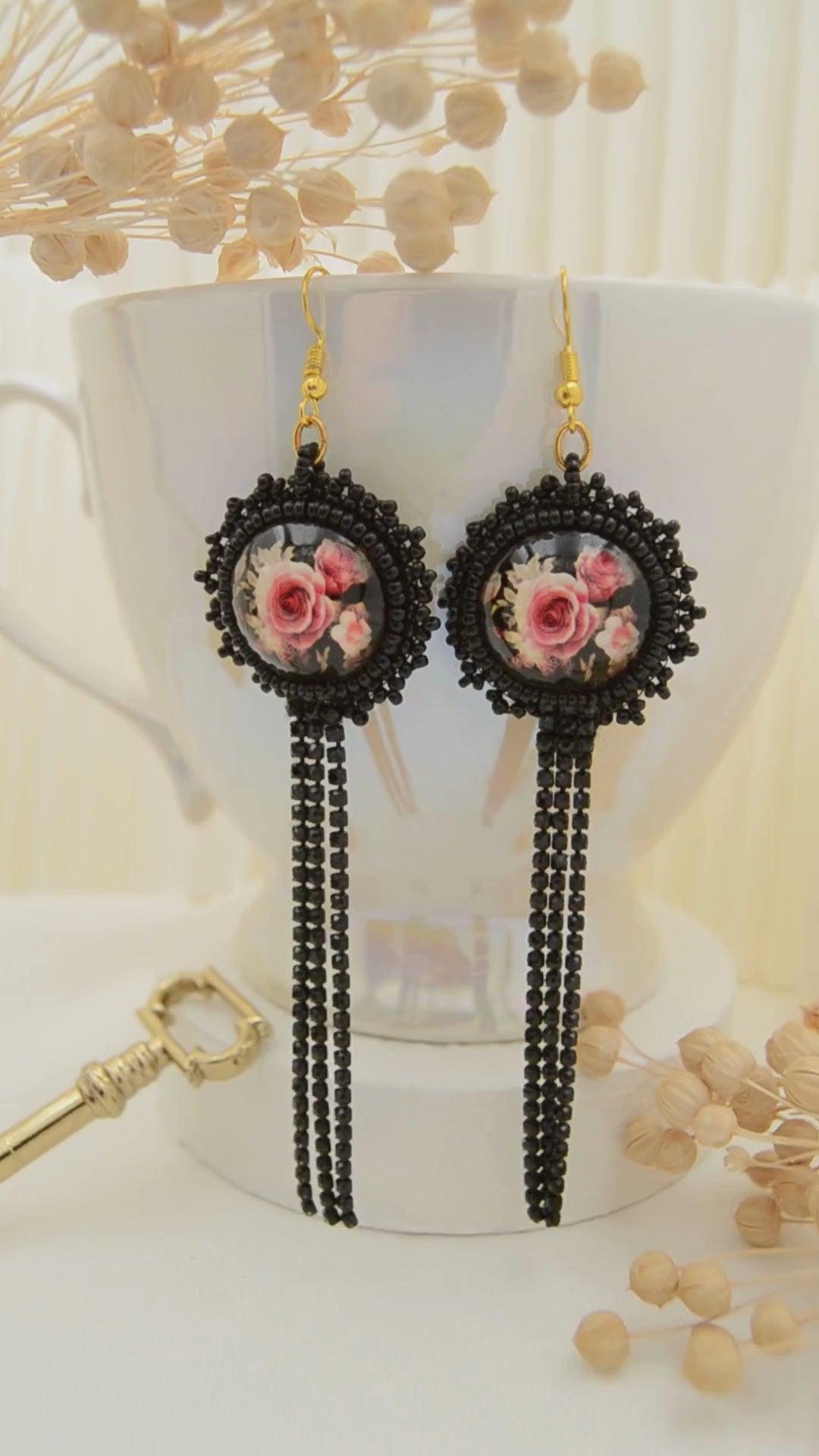 Diese handgefertigten Ohrringe vereinen romantisches Flair mit einer Prise Dramatik. Der Blickfang ist ein kunstvoller Cabochon mit zartem Rosenmotiv, umrandet von fein aufgestickten, schwarzen Miyuki-Glasperlen. Die Perlen setzen die Rosen elegant in Szene und schaffen eine raffinierte Spitzenoptik.