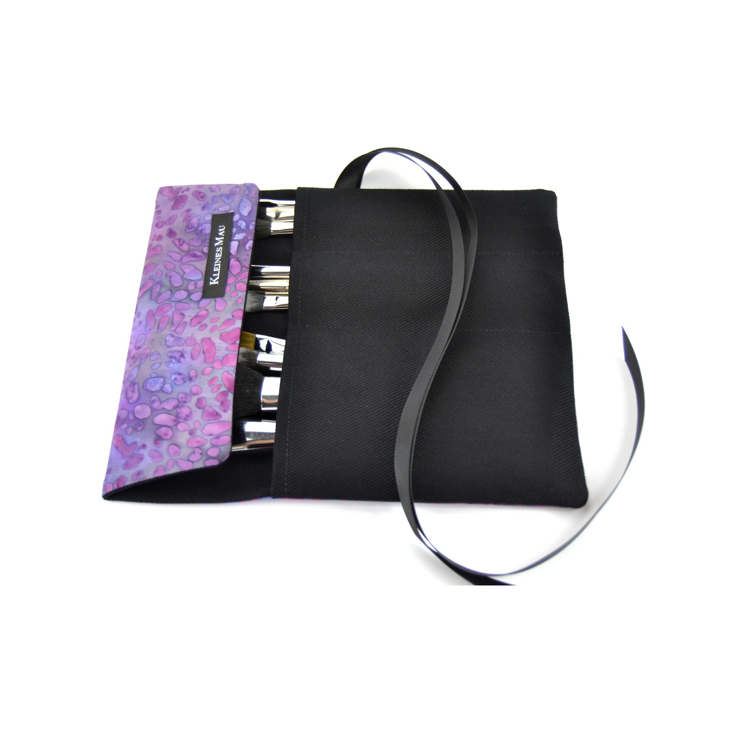 In diese Fächer können komfortabel je einer oder mehrere Pinsel eingesteckt werden. Schutzklappe runter, zusammenklappen mit dem Satinband verschließen. Voilà!