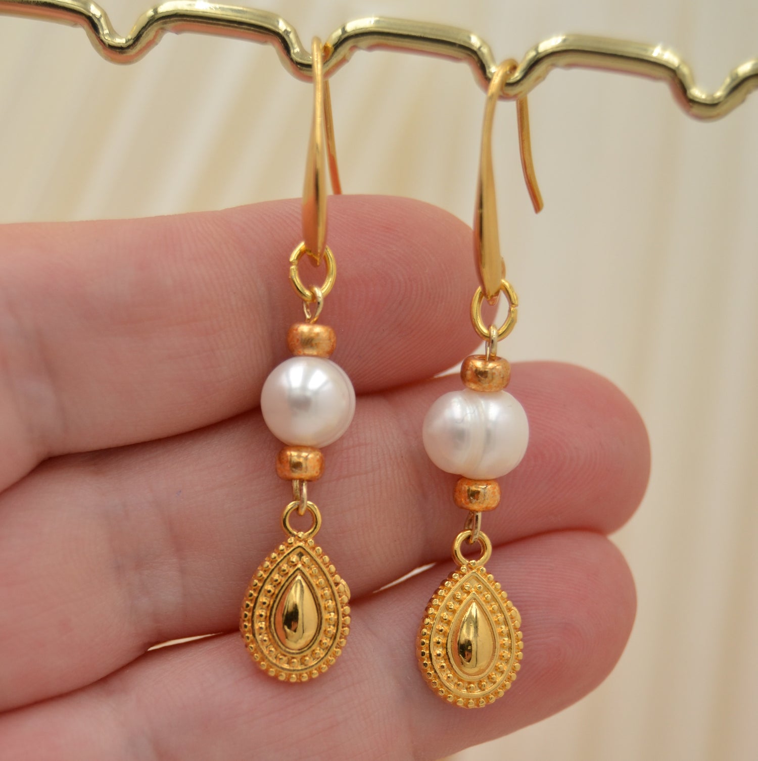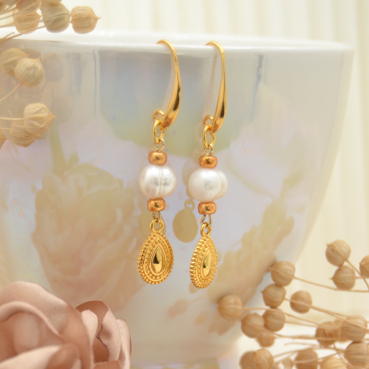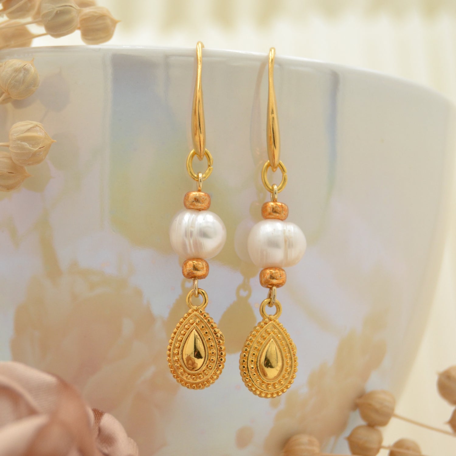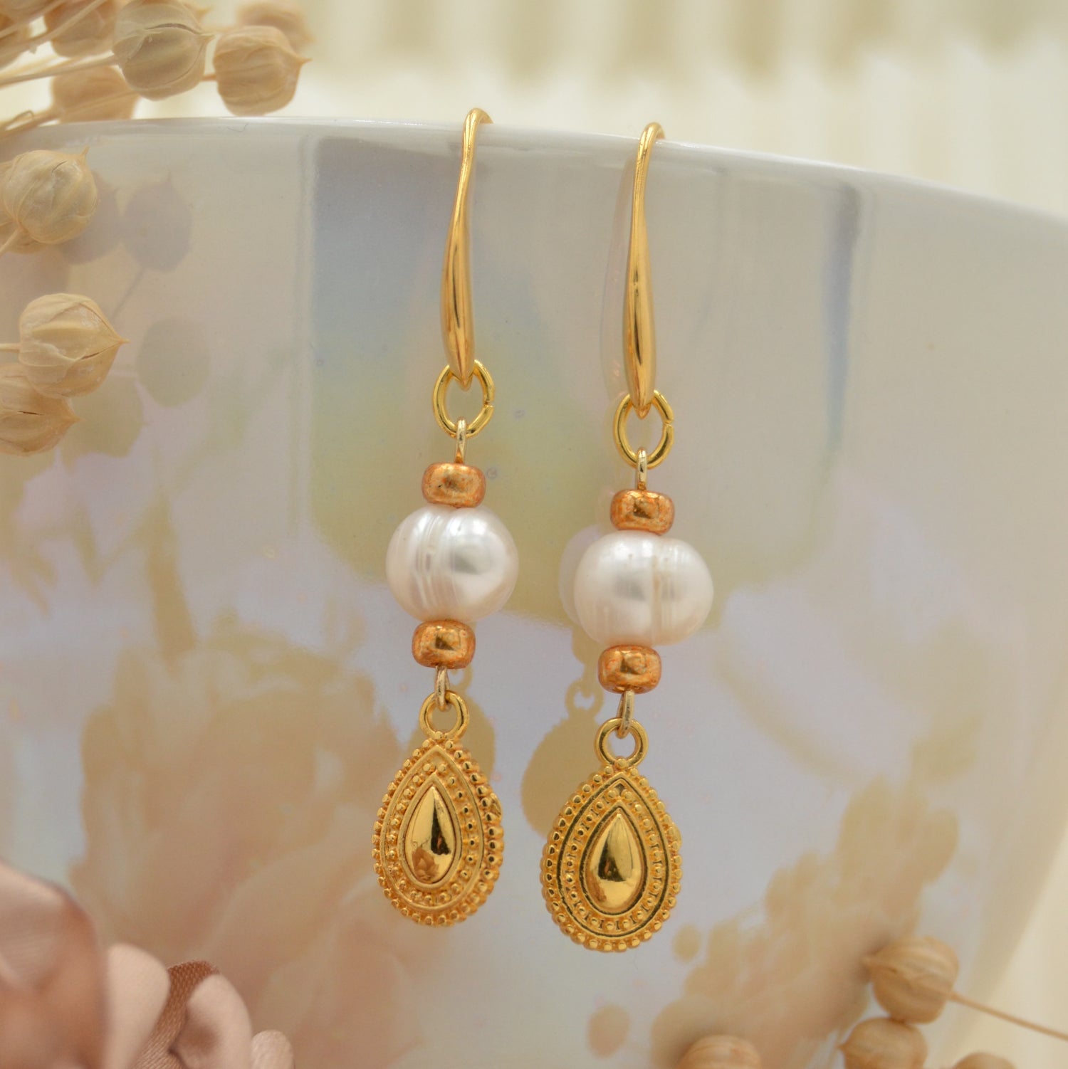 Diese Ohrringe sind die perfekte Mischung aus klassischer Eleganz und moderner Raffinesse. An den schlichten, goldfarbenen Ohrhaken hängen ca. 8 mm große Süßwasserperlen, die jedem Look eine edle Note verleihen. Dazu kommt der zarte, tropfenförmige Anhänger in Goldoptik mit filigranen Ornamenten – ein echter Hingucker, der die Perlen wunderbar ergänzt.