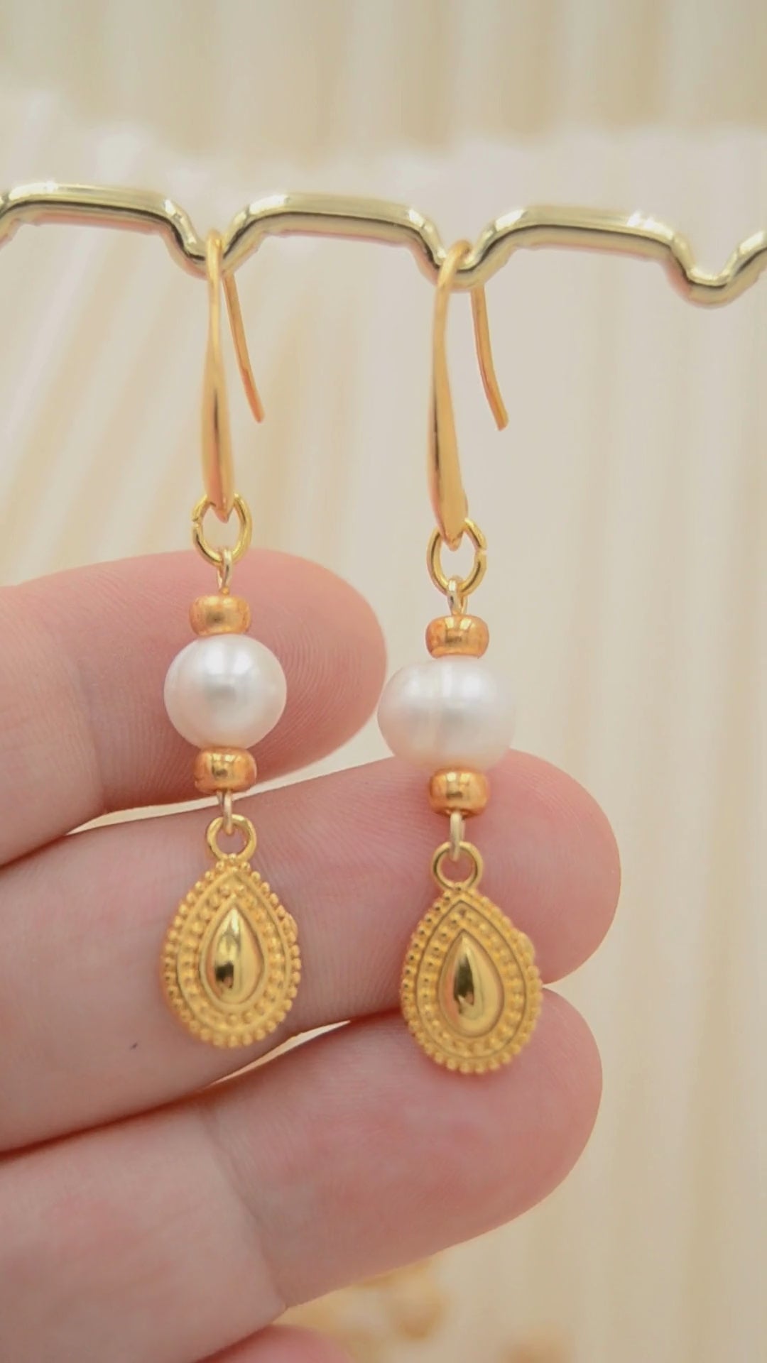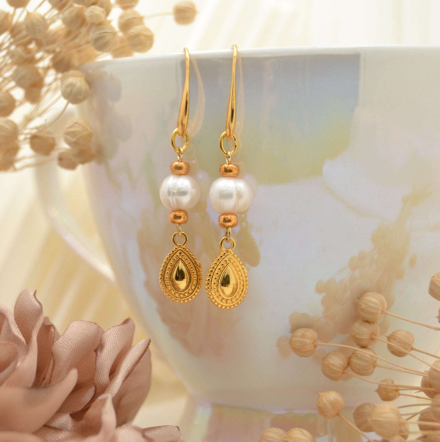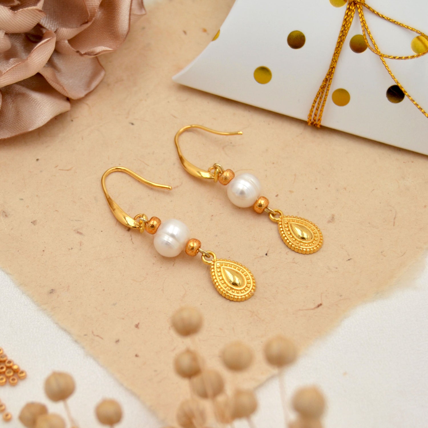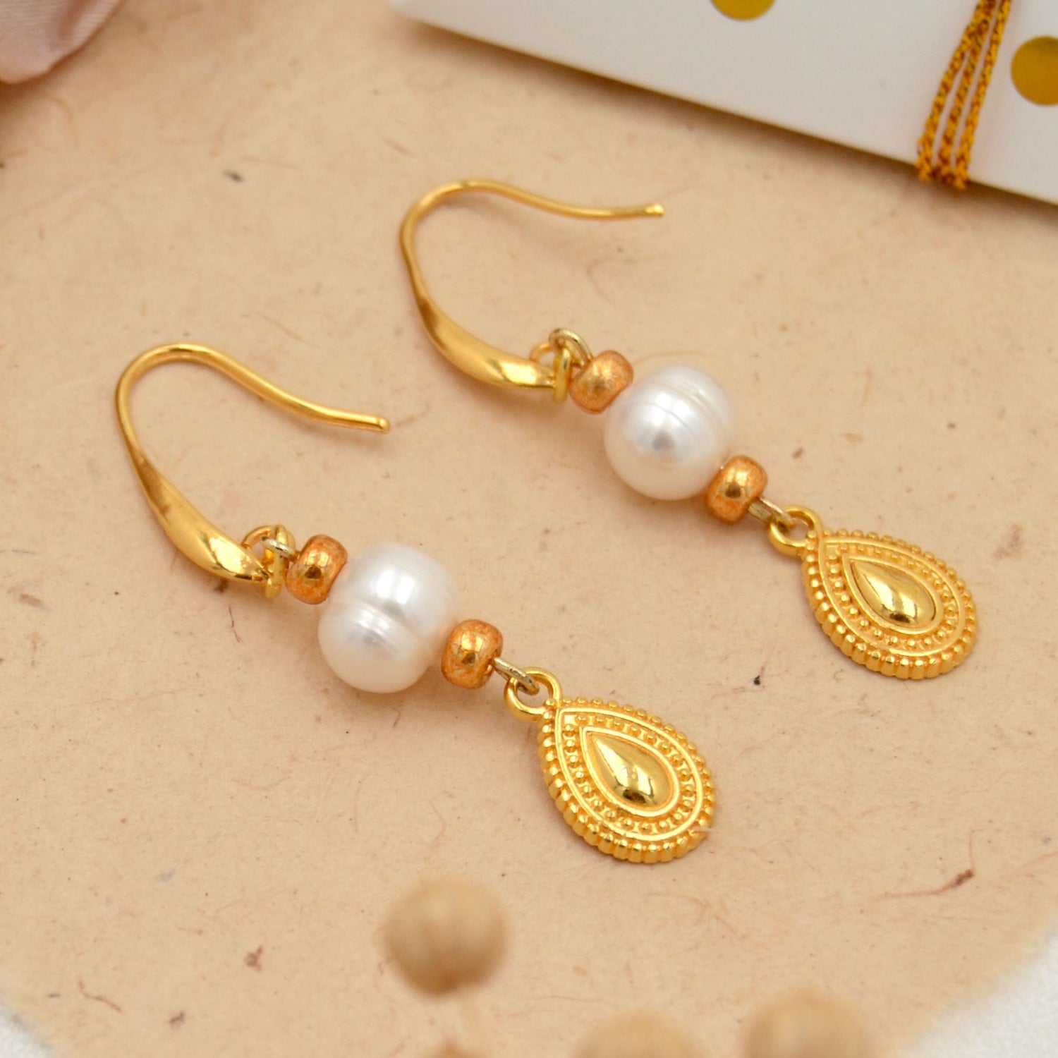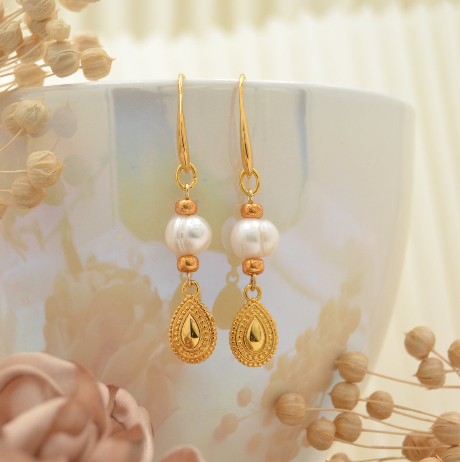 Diese Ohrringe sind die perfekte Mischung aus klassischer Eleganz und moderner Raffinesse. An den schlichten, goldfarbenen Ohrhaken hängen ca. 8 mm große Süßwasserperlen, die jedem Look eine edle Note verleihen. Dazu kommt der zarte, tropfenförmige Anhänger in Goldoptik mit filigranen Ornamenten – ein echter Hingucker, der die Perlen wunderbar ergänzt.