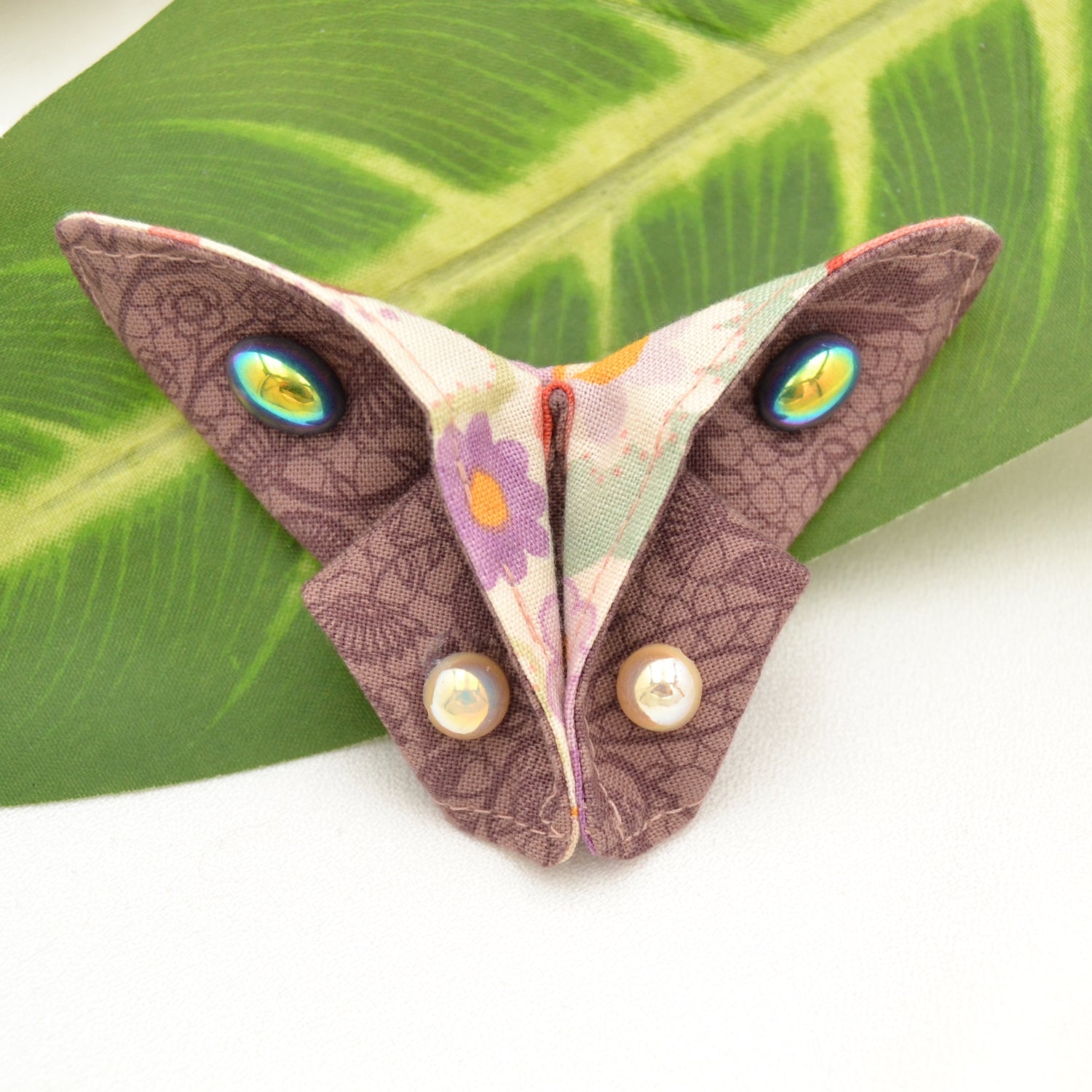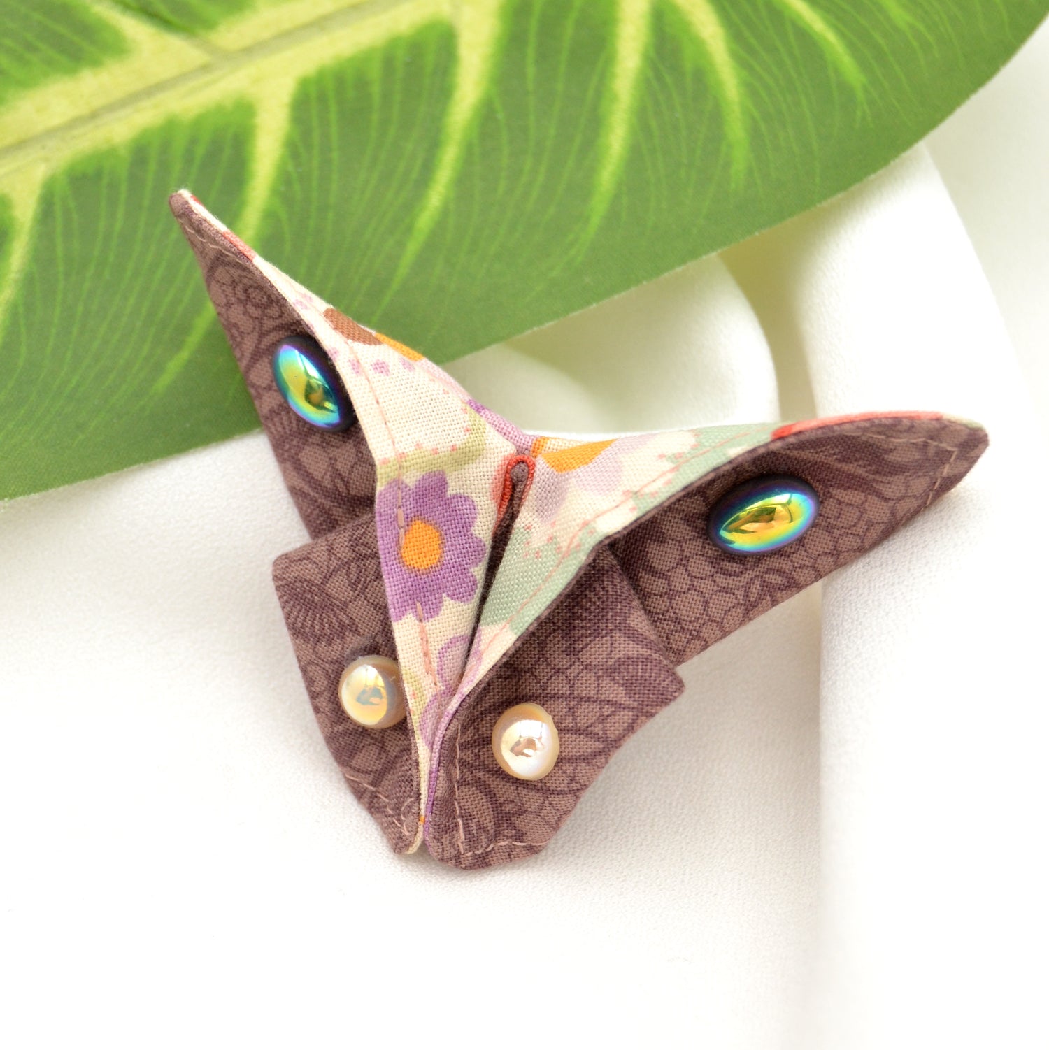 Entdecke zauberhafte Kreaturen in unserer Kollektion von handgefertigten Stoffbroschen in Schmetterlingsform. Diese entzückende Kreation vereint kunstvolles Origami-Handwerk mit zwei süßen retro Baumwollstoffen.