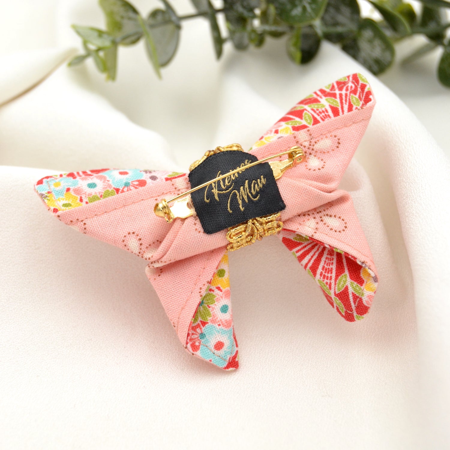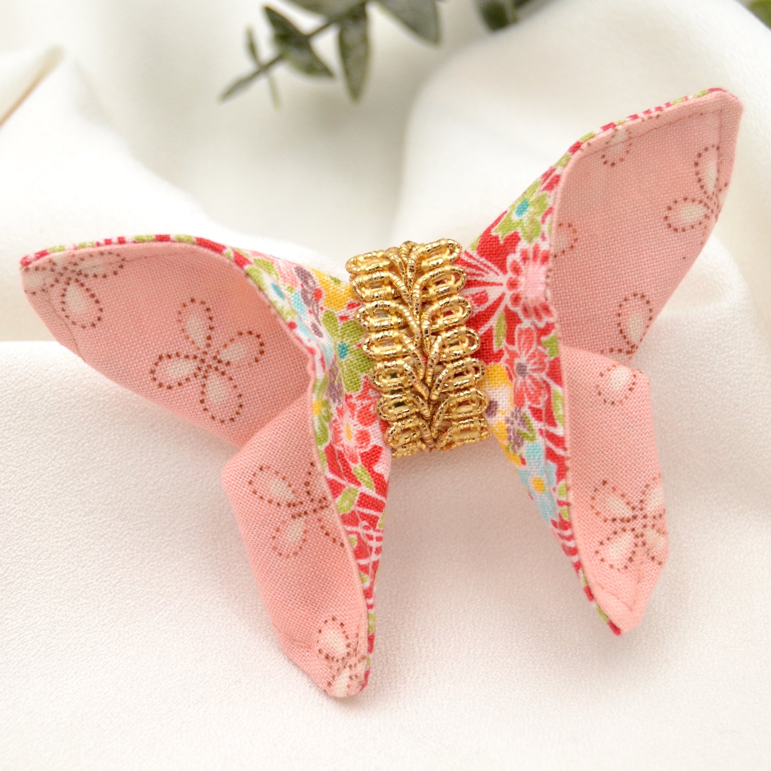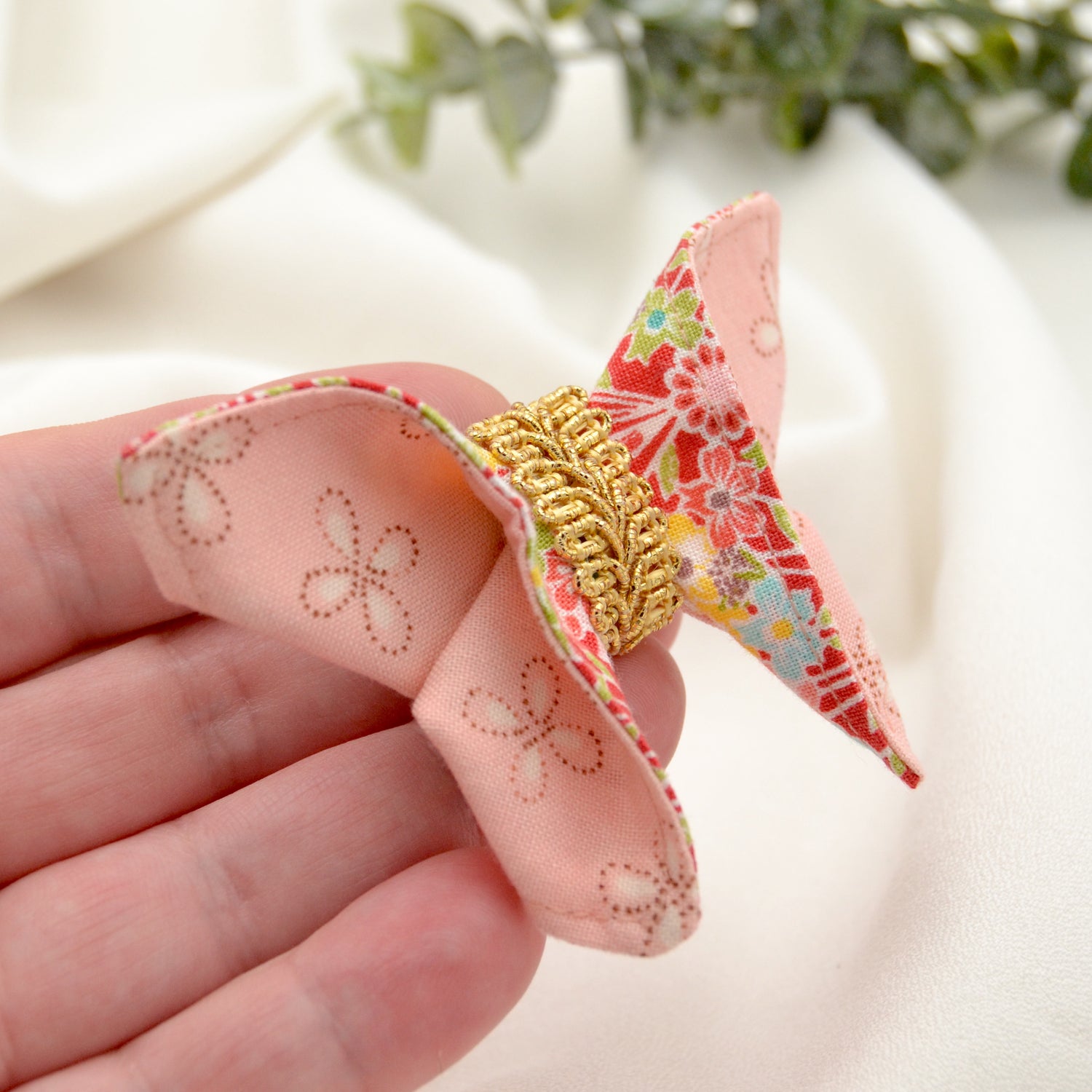 Entdecke zauberhafte Kreaturen in unserer Kollektion von handgefertigten Stoffbroschen in Schmetterlingsform. Diese entzückende Kreation vereint kunstvolles Origami-Handwerk mit zwei süßen Stoffen, einem in zartem Rosa und einem in lebhaftem Rot, beide verziert mit bezaubernden Blumenmustern.