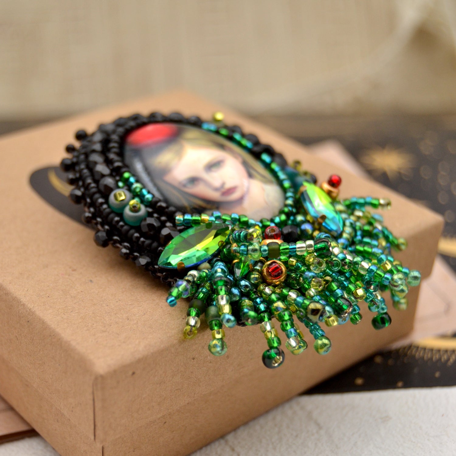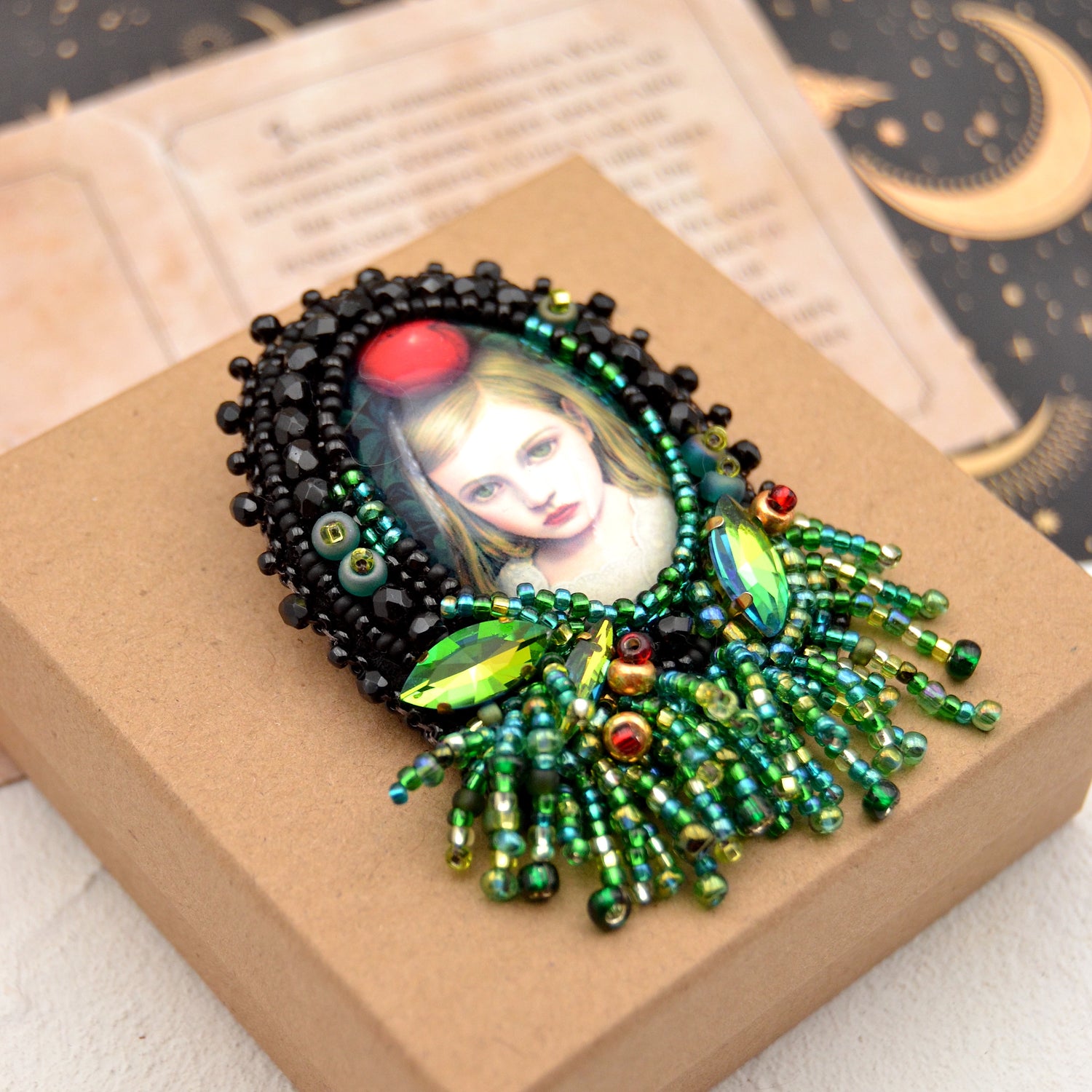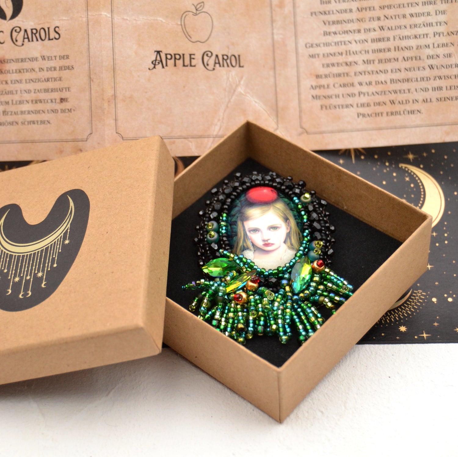 Tauche ein in die zauberhafte Welt von "Apple Carol" mit unserer bezaubernden Brosche. Das Herzstück dieser handgefertigten Kreation ist eine faszinierende Glas Cabochon, der von kunstvoll umstickten Perlen in Schwarz, Grün und Gold eingerahmt wird. Ein regelrechter Dschungel aus Grüntönen umgibt Apple Carol, während Perlenfransen den Eindruck von wildem Wuchs in einem verzauberten Garten erzeugen. Jedes Detail erweckt die magische Atmosphäre zum Leben, in der Apple Carol sitzt und uns mit ihrem geheimnisvollen Blick verzaubert. Diese Brosche ist nicht nur ein Schmuckstück, sondern auch eine Reise in eine Welt voller Fantasie und Magie.