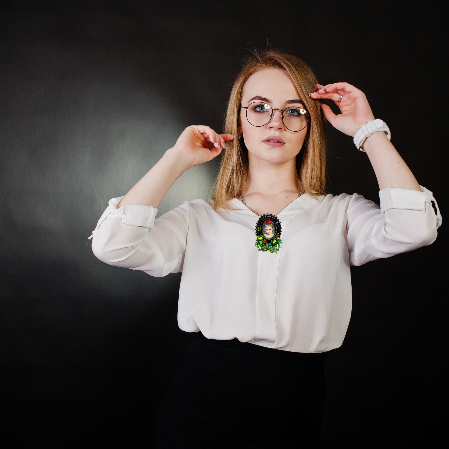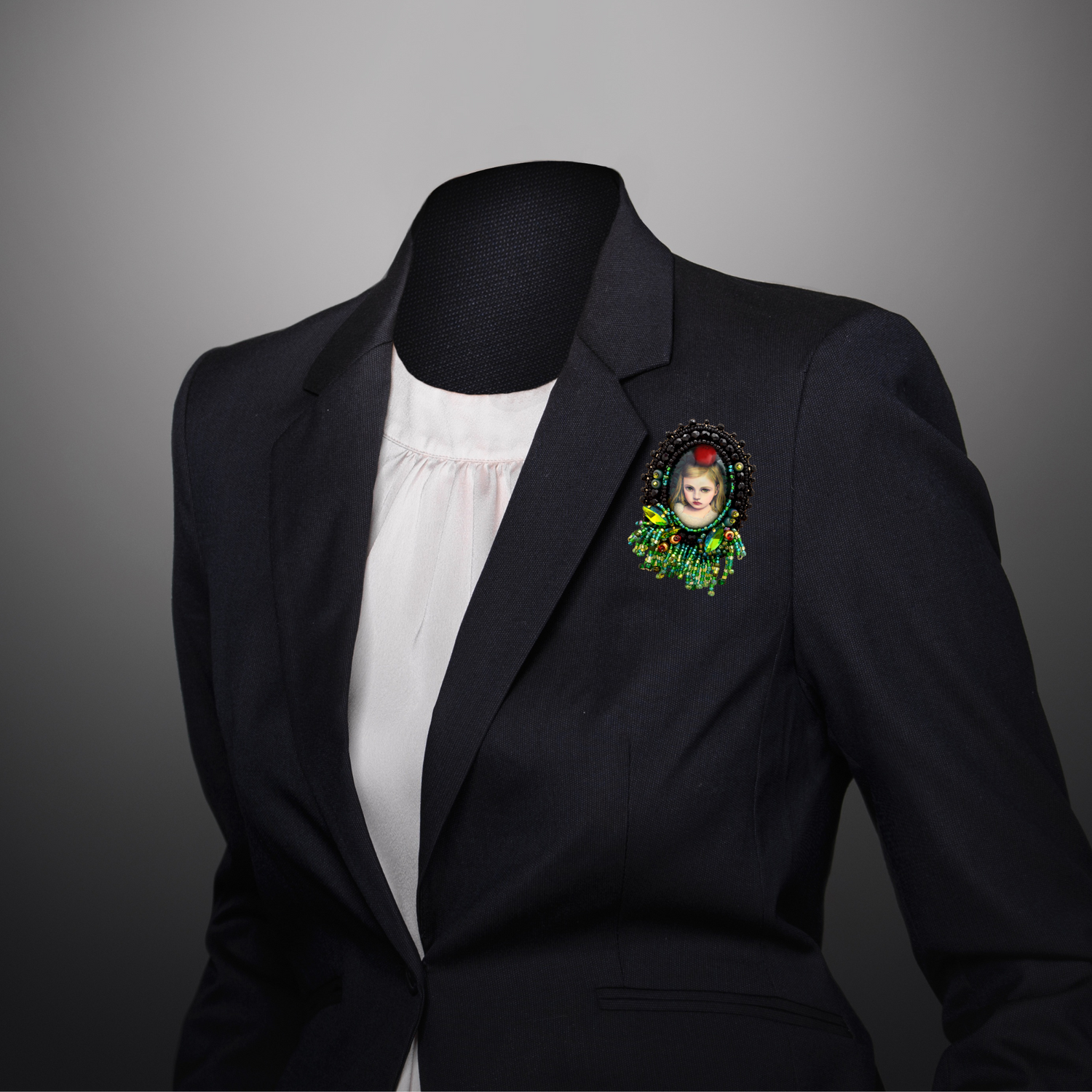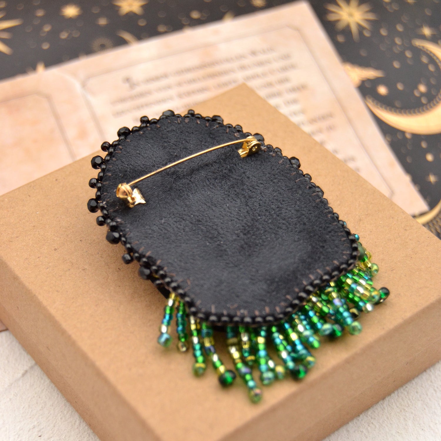 Tauche ein in die zauberhafte Welt von "Apple Carol" mit unserer bezaubernden Brosche. Das Herzstück dieser handgefertigten Kreation ist eine faszinierende Glas Cabochon, der von kunstvoll umstickten Perlen in Schwarz, Grün und Gold eingerahmt wird. Ein regelrechter Dschungel aus Grüntönen umgibt Apple Carol, während Perlenfransen den Eindruck von wildem Wuchs in einem verzauberten Garten erzeugen. Jedes Detail erweckt die magische Atmosphäre zum Leben, in der Apple Carol sitzt und uns mit ihrem geheimnisvollen Blick verzaubert. Diese Brosche ist nicht nur ein Schmuckstück, sondern auch eine Reise in eine Welt voller Fantasie und Magie.