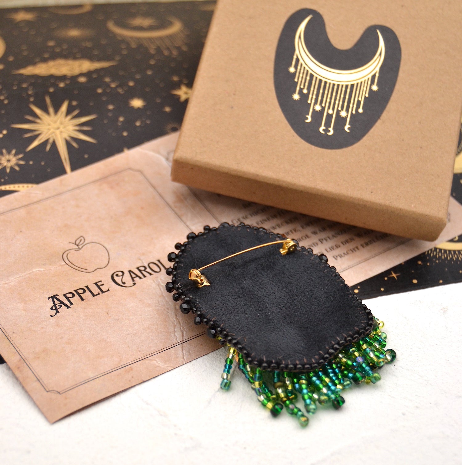 Perlen Brosche "Apple Carol" Perlenbestickte Brosche mit Fransen Dschungel Magic Carols Collection