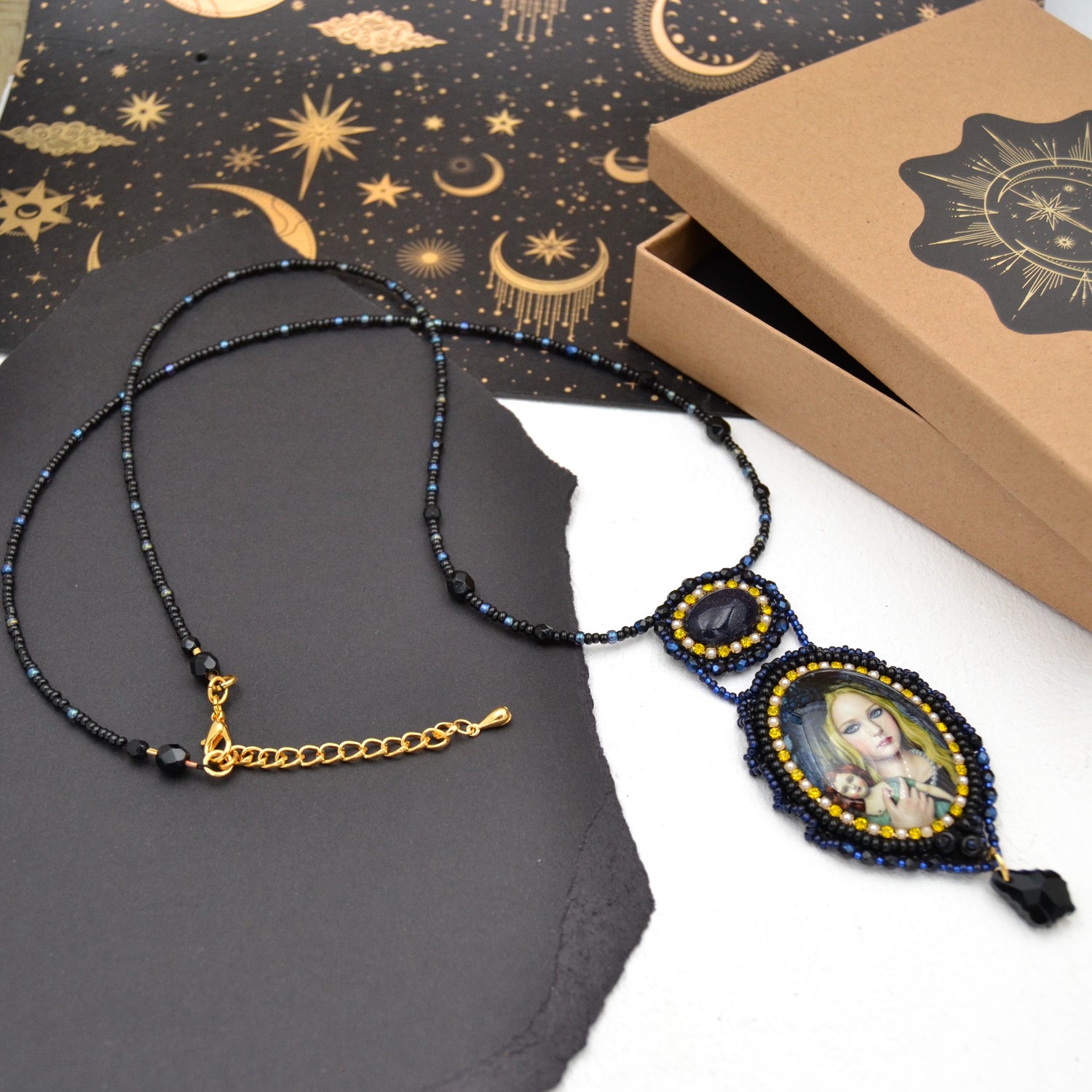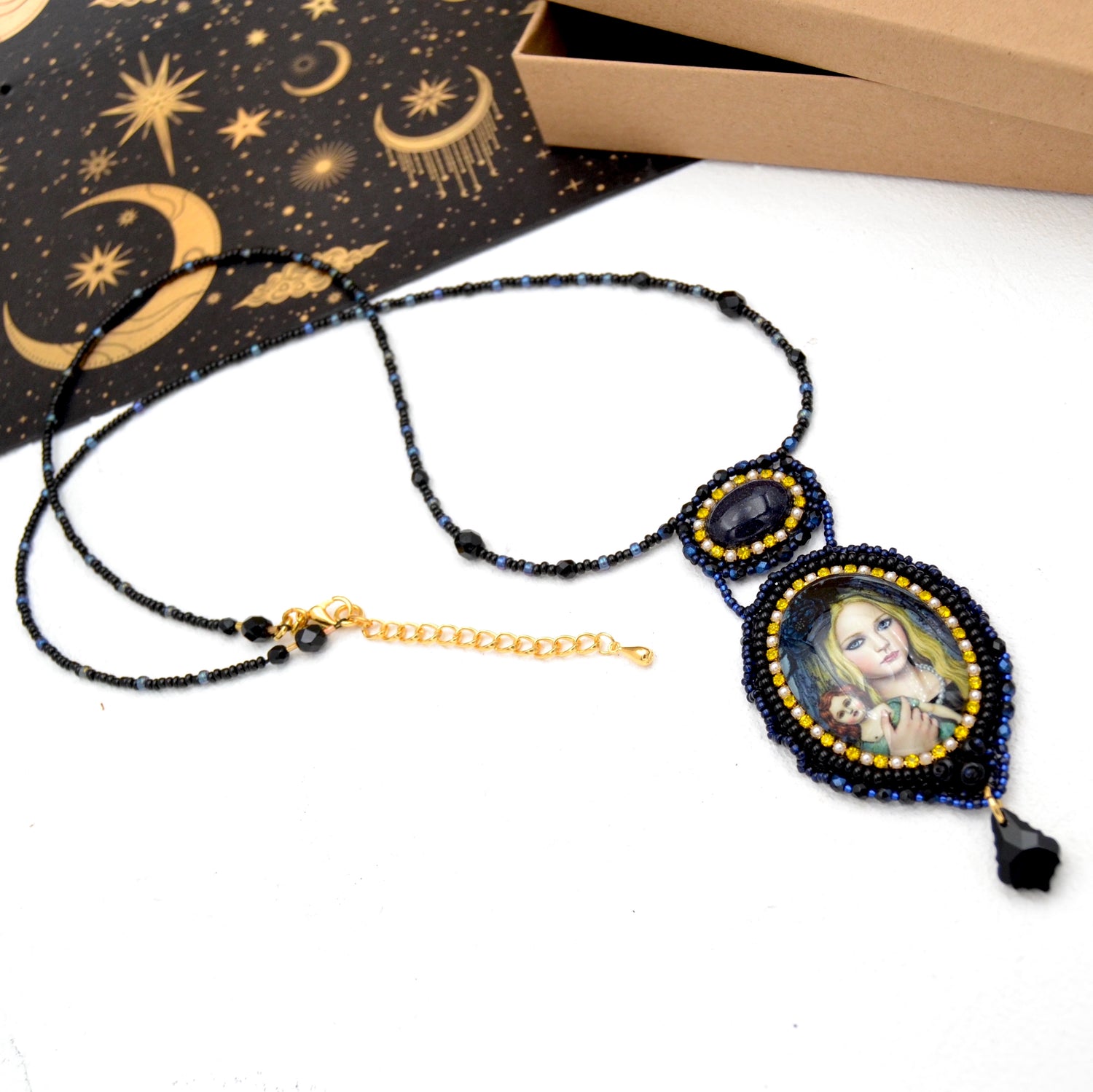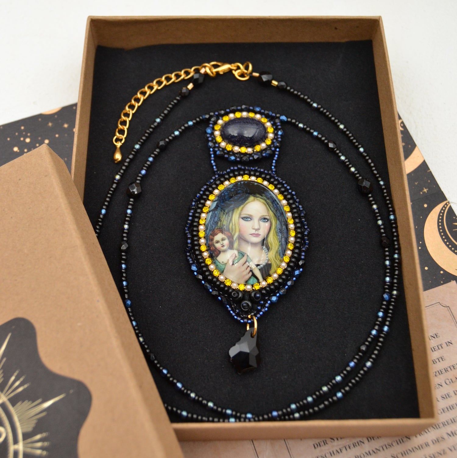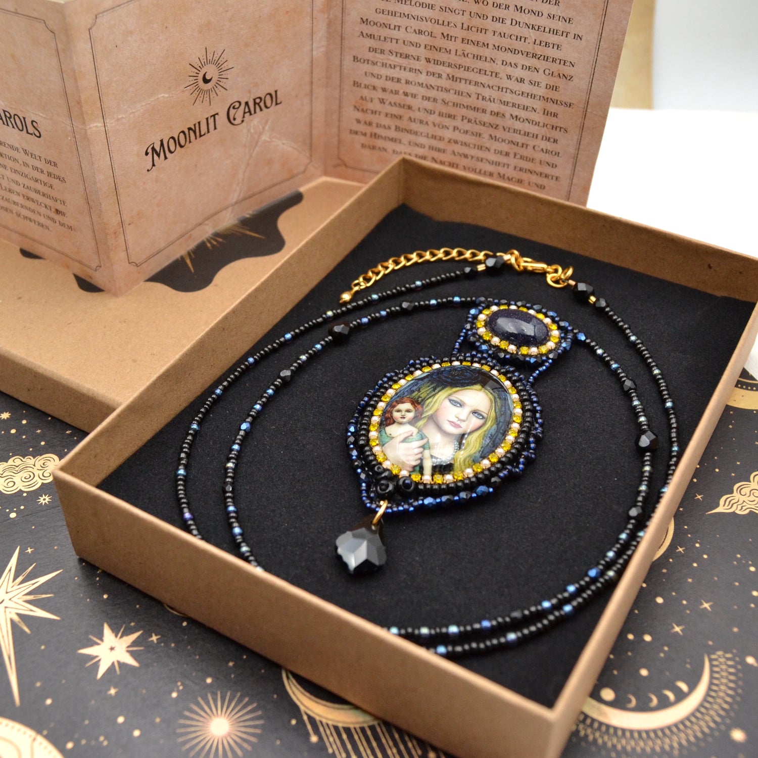 Begib dich auf eine faszinierende Reise in die verträumte Welt von "Moonlit Carol" mit unserem bezaubernden Collier. Diese lange Kette aus dunkelblauen und schwarzen Perlen erweckt die Magie der nächtlichen Stunde zum Leben. Der ovale Anhänger, ein schützendes Amulett, enthält das atemberaubende Motiv von "Moonlit Carol" – ein Mädchen mit mondblasser Haut, gekleidet in schwarze Spitze, das liebevoll eine Puppe im Arm hält.