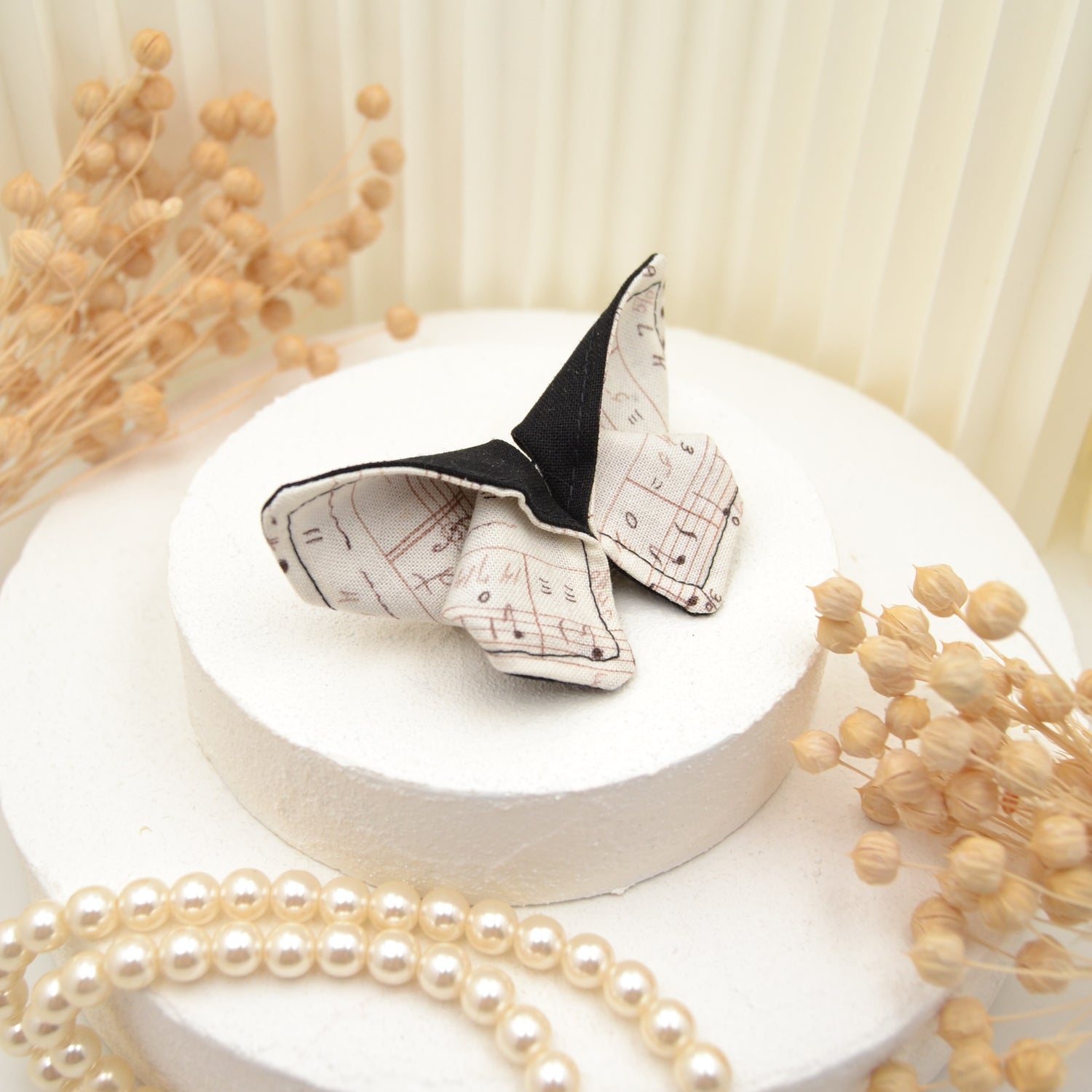 Entdecke zauberhafte Kreaturen in unserer Kollektion von handgefertigten Stoffbroschen in Schmetterlingsform. Diese entzückende Kreation vereint kunstvolles Origami-Handwerk mit zwei wunderschönen Baumwollstoffen in schwarz und mit Notenmotiv.