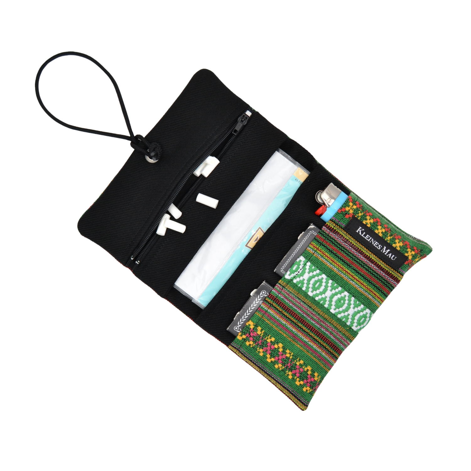 Der Beutel besteht aus einer Reißverschlußtasche, einem Fach für die Tabakpackung, sowie 3 Schubfächern für Papers, Feuerzeug oder was sonst noch mit muss.