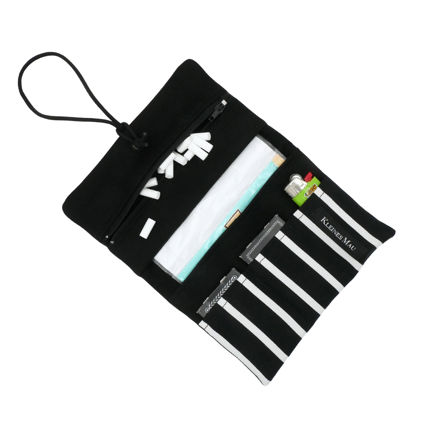 Der Beutel besteht aus einer Reißverschlußtasche, einem Fach für die Tabakpackung, sowie 3 Schubfächern für Papers, Feuerzeug oder was sonst noch mit muss.