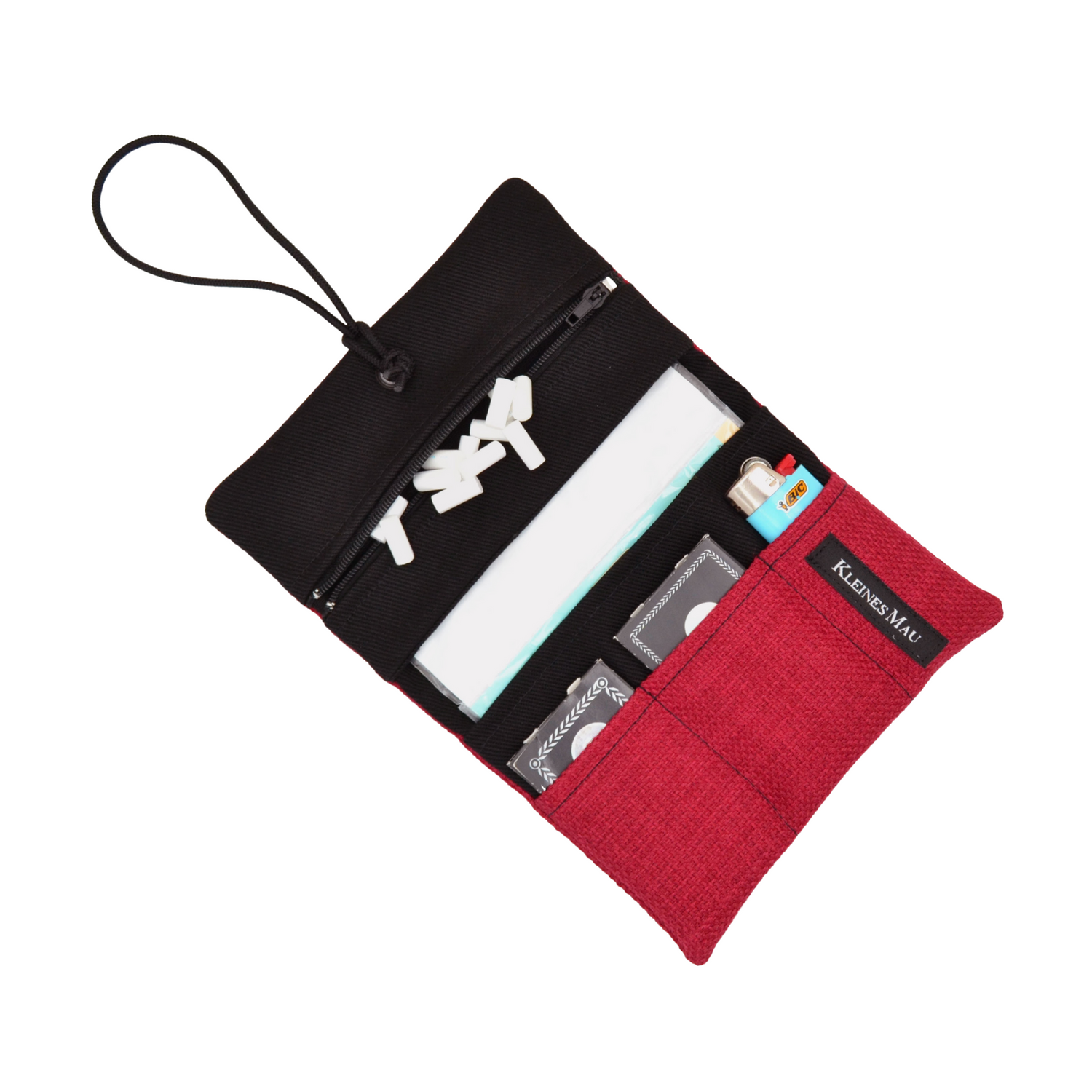 Der Beutel besteht aus einer Reißverschlußtasche, einem Fach für die Tabakpackung, sowie 3 Schubfächern für Papers, Feuerzeug oder was sonst noch mit muss.