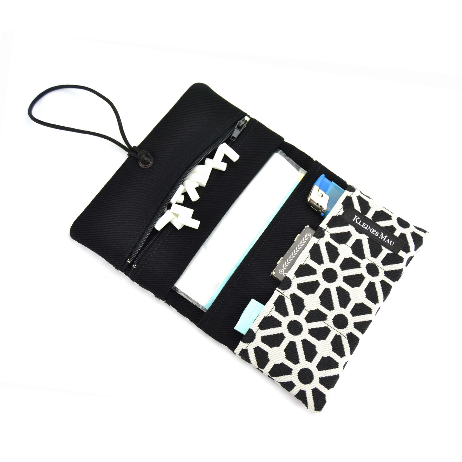 Der Beutel besteht aus einer Reißverschlußtasche, einem Fach für die Tabakpackung, sowie 3 Schubfächern für Papers, Feuerzeug oder was sonst noch mit muss.