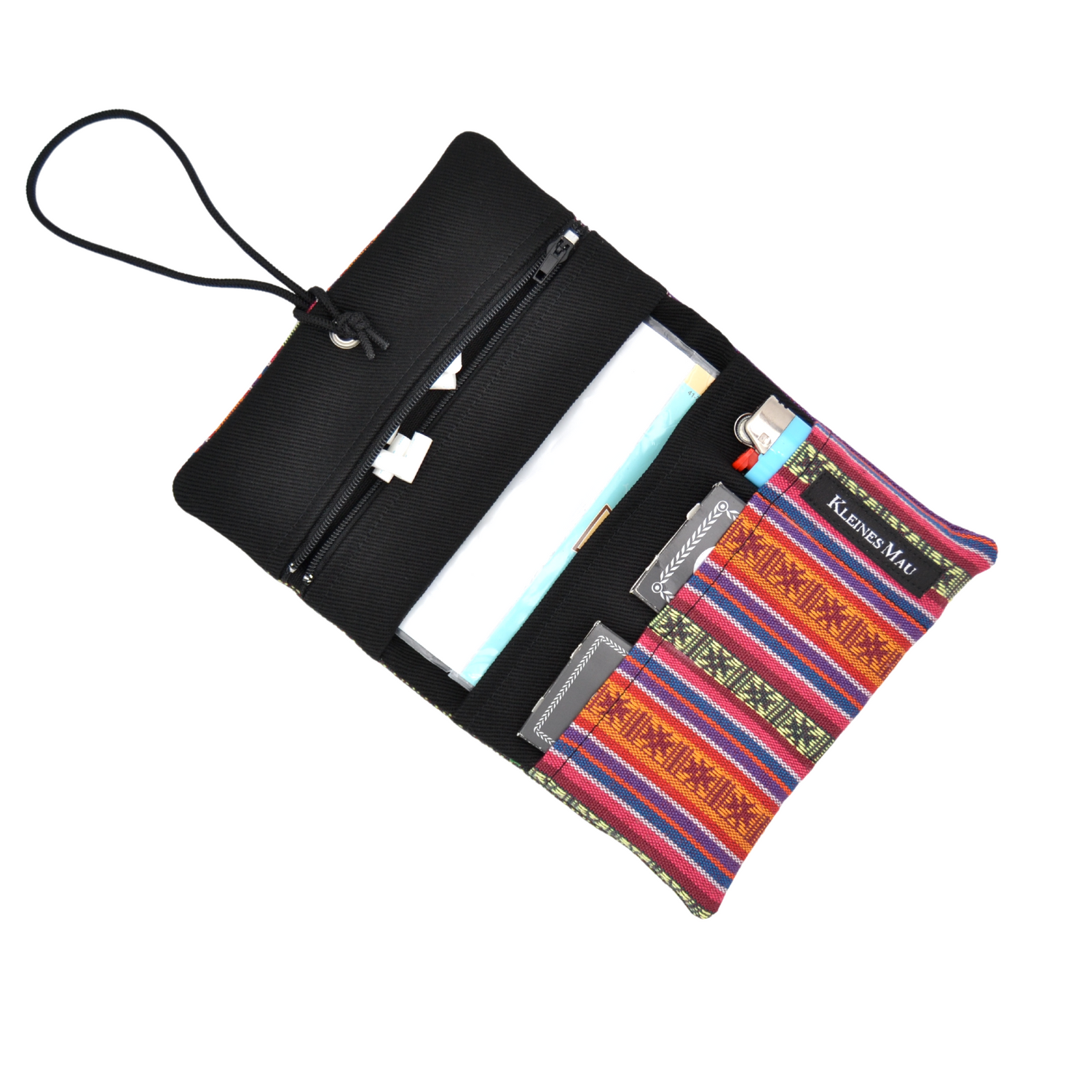 Der Beutel besteht aus einer Reißverschlußtasche, einem Fach für die Tabakpackung, sowie 3 Schubfächern für Papers, Feuerzeug oder was sonst noch mit muss.