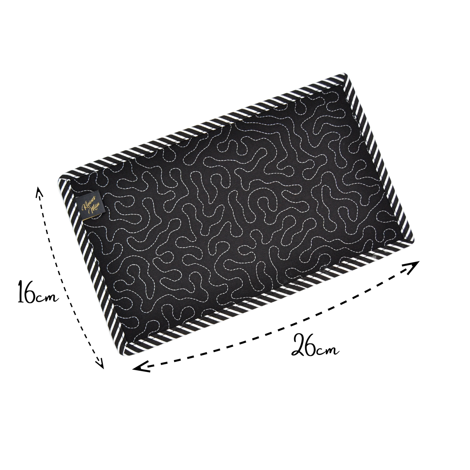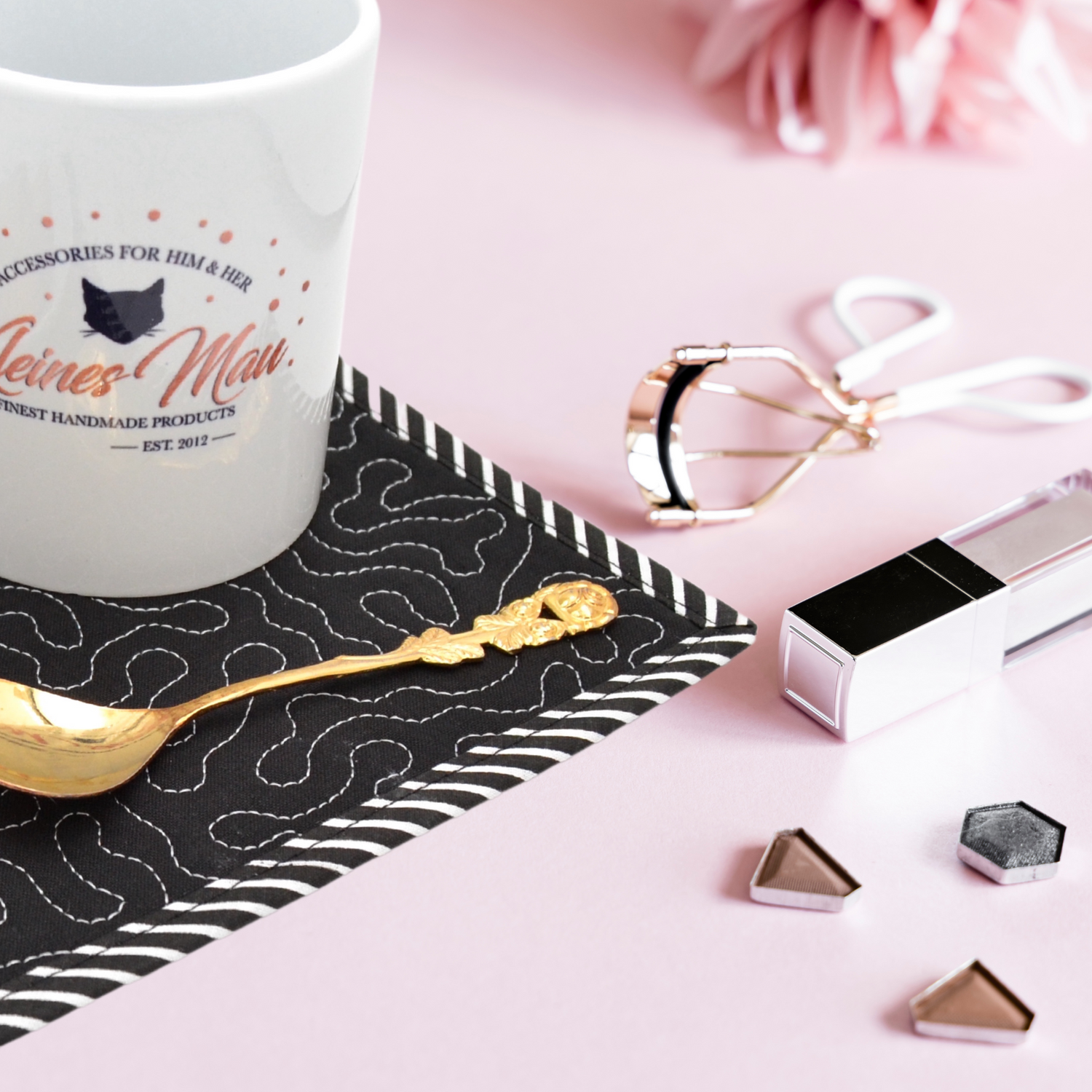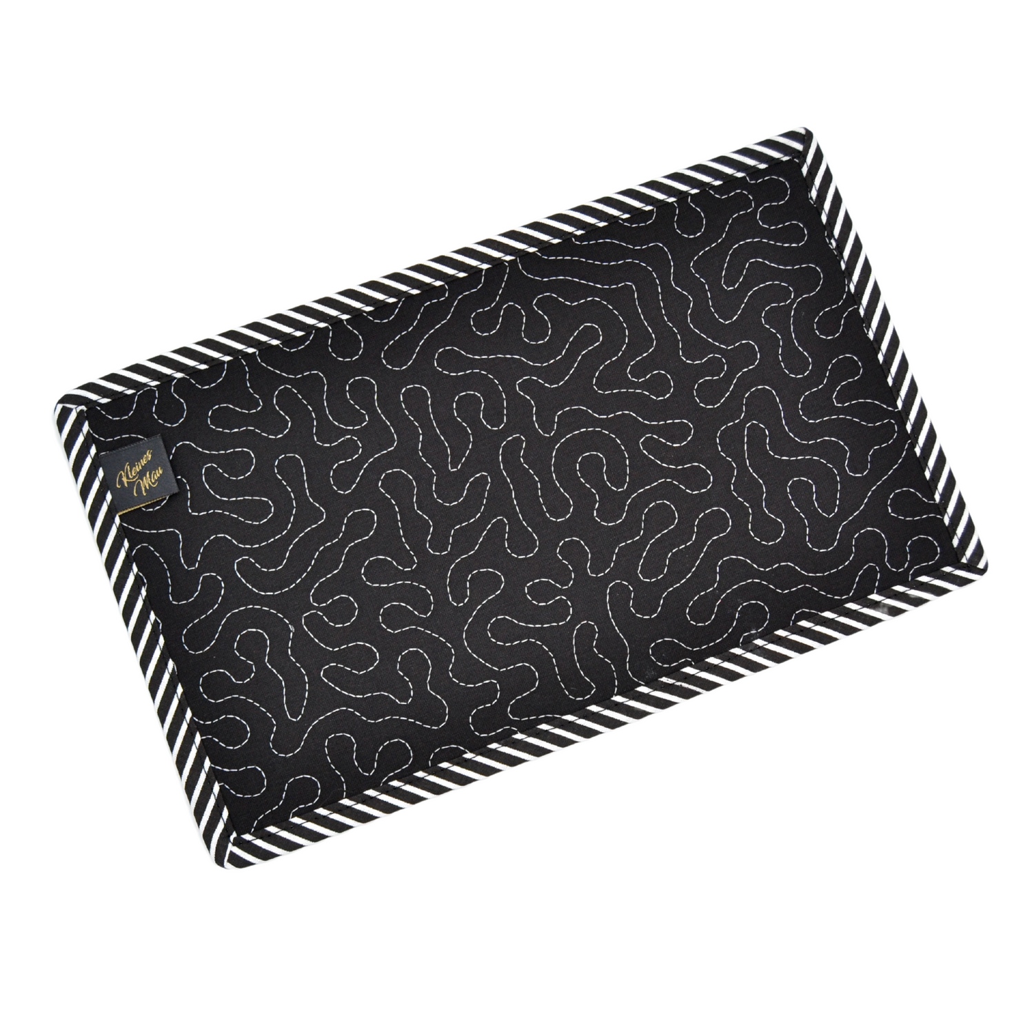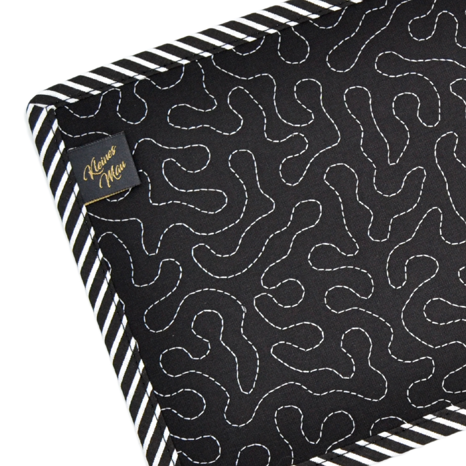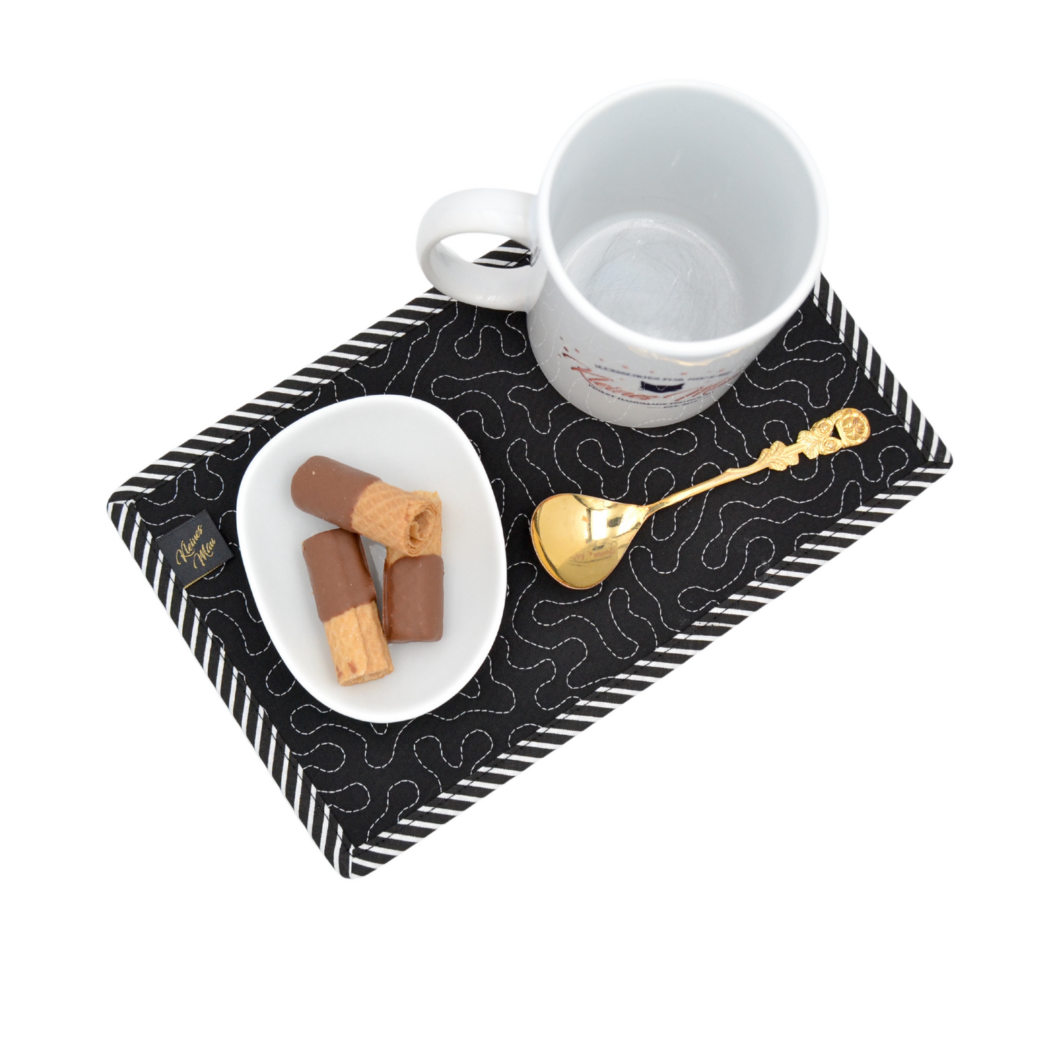 Der Untersetzer besteht aus hochwertiger schwarzer Baumwolle und ist auf der Oberseite mit einem verspielten und modernen, kurvigen "Labyrinthmuster" gequiltet. Das schwarz-weiß gestreifte Baumwollband verleiht dem Design einen tollen Kontrast und macht einen schlichten Untersetzer zum Hingucker.
