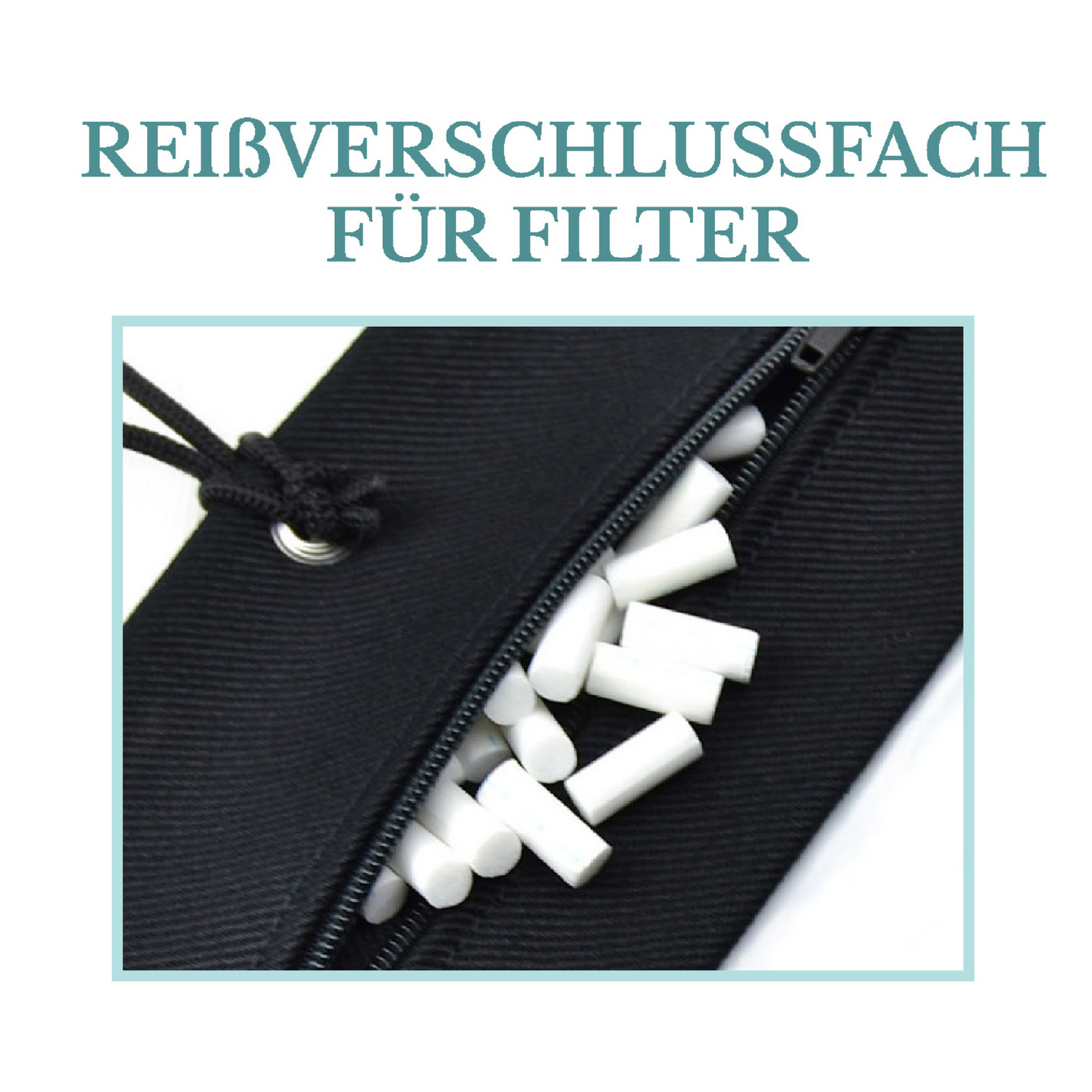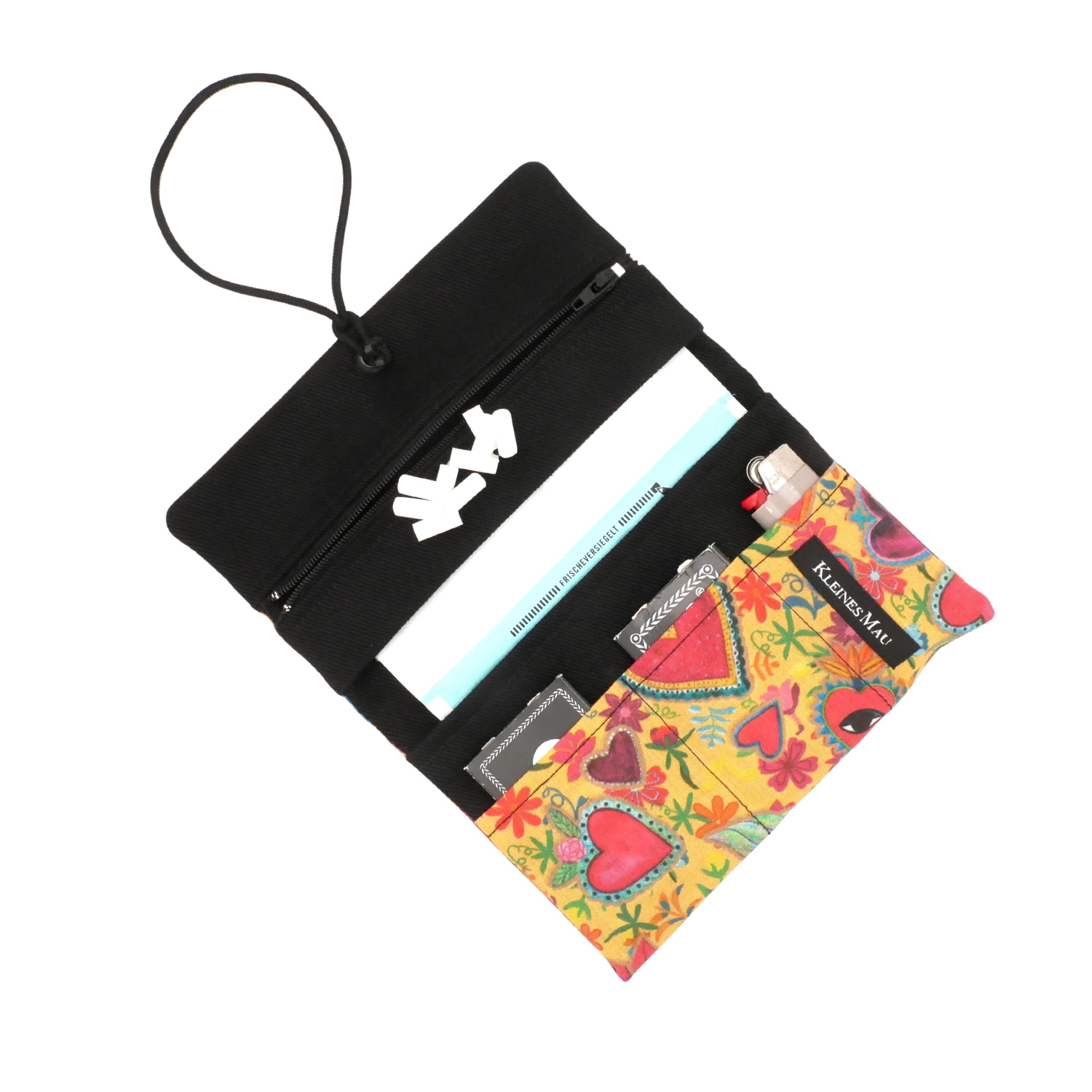 Der Beutel besteht aus einer Reißverschlußtasche, einem Fach für die Tabakpackung, sowie 3 Schubfächern für Papers, Feuerzeug oder was sonst noch mit muss.