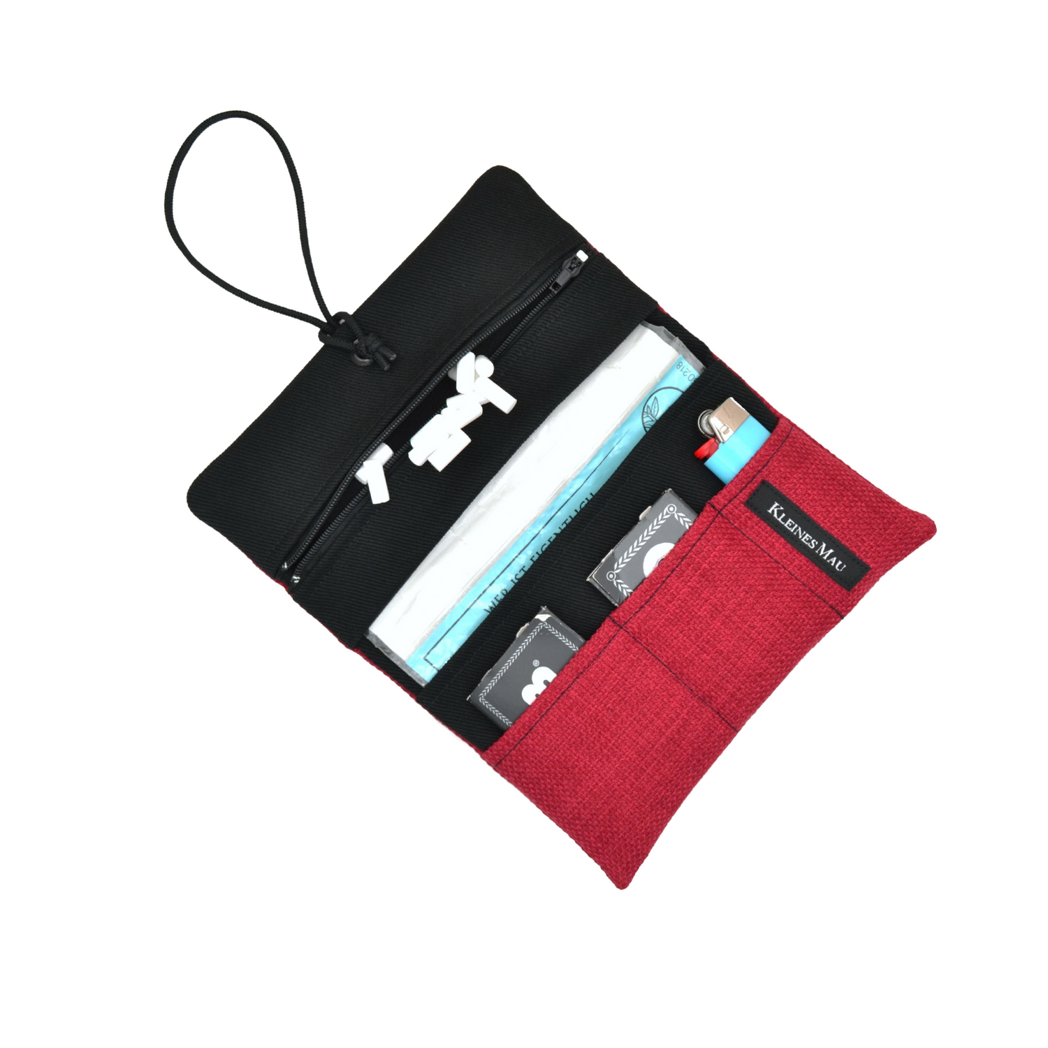 Der Beutel besteht aus einer Reißverschlußtasche, einem Fach für die Tabakpackung, sowie 3 Schubfächern für Papers, Feuerzeug oder was sonst noch mit muss.