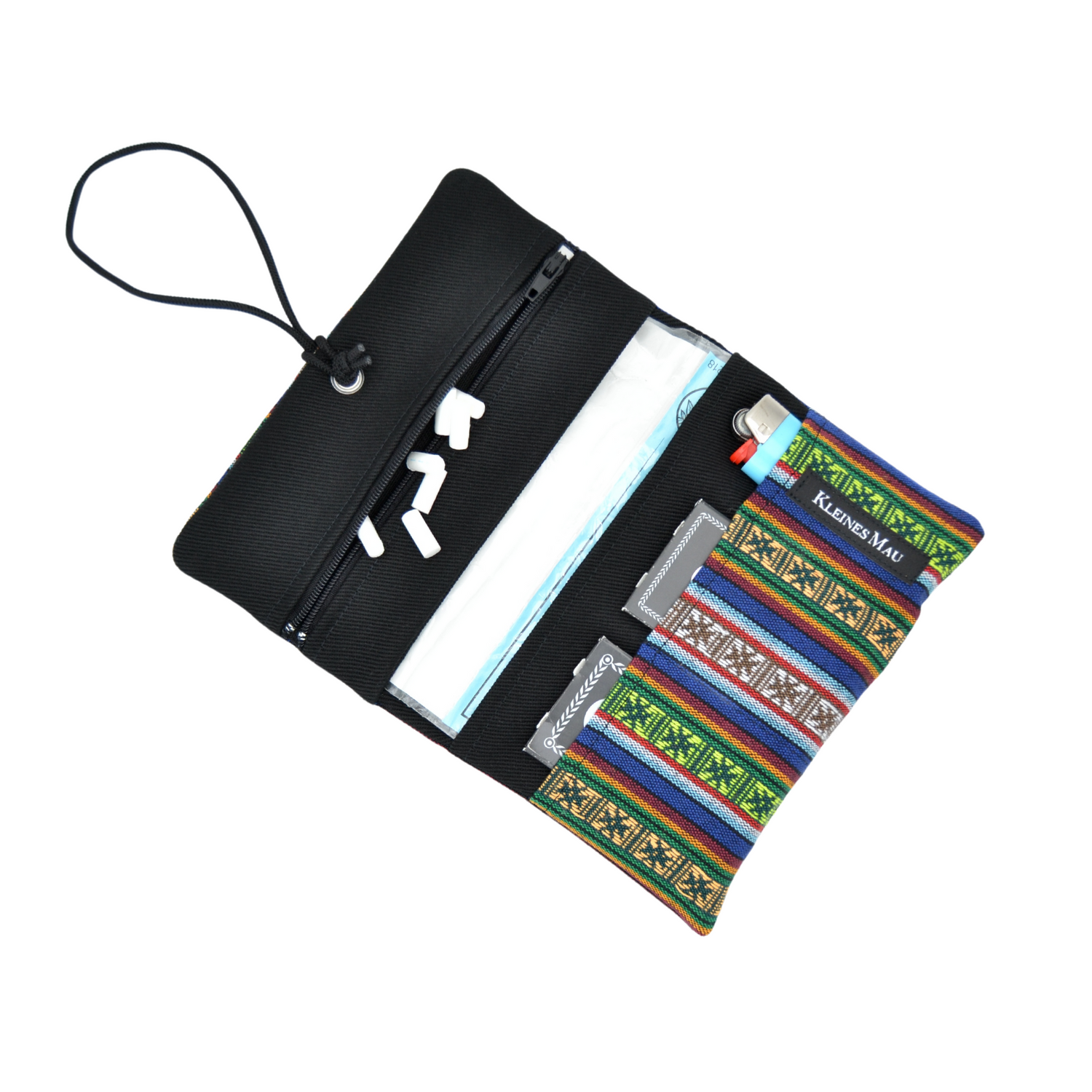 Der Beutel besteht aus einer Reißverschlußtasche, einem Fach für die Tabakpackung, sowie 3 Schubfächern für Papers, Feuerzeug oder was sonst noch mit muss.