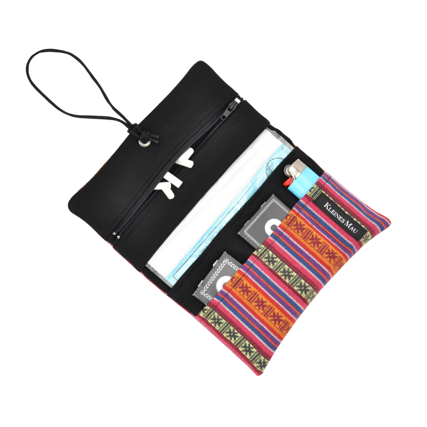 Der Beutel besteht aus einer Reißverschlußtasche, einem Fach für die Tabakpackung, sowie 3 Schubfächern für Papers, Feuerzeug oder was sonst noch mit muss.