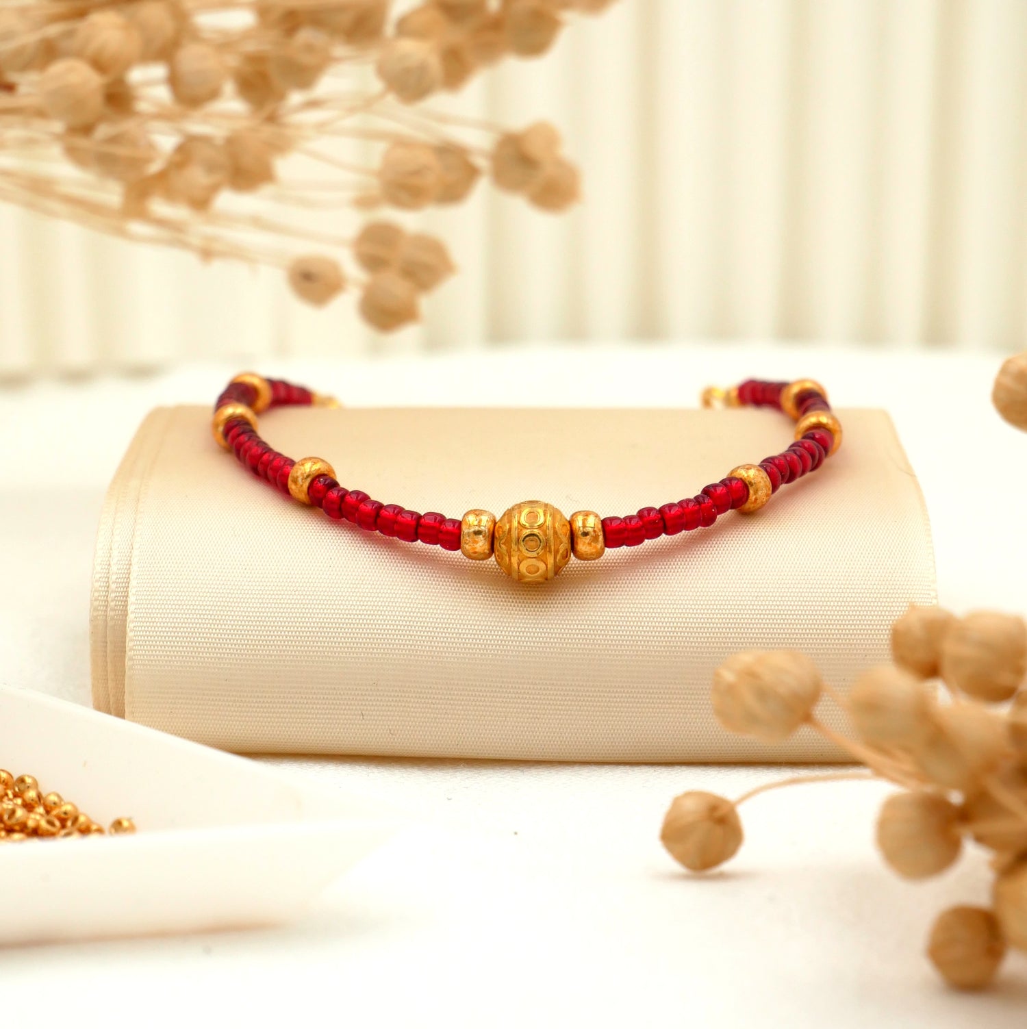 Dieses elegante Armband verbindet schlichte Schönheit mit liebevollen Details. Die filigranen, goldfarbenen Miyuki-Glasperlen sorgen für eine sanfte, aber stilvolle Note, während die dunkelroten Glasperlen einen feurigen Kontrast erzeugen. Die große goldfarbene Ornamentperle in der Mitte des Designs ergänzt das Ganze durch einen schönen Blickfang.