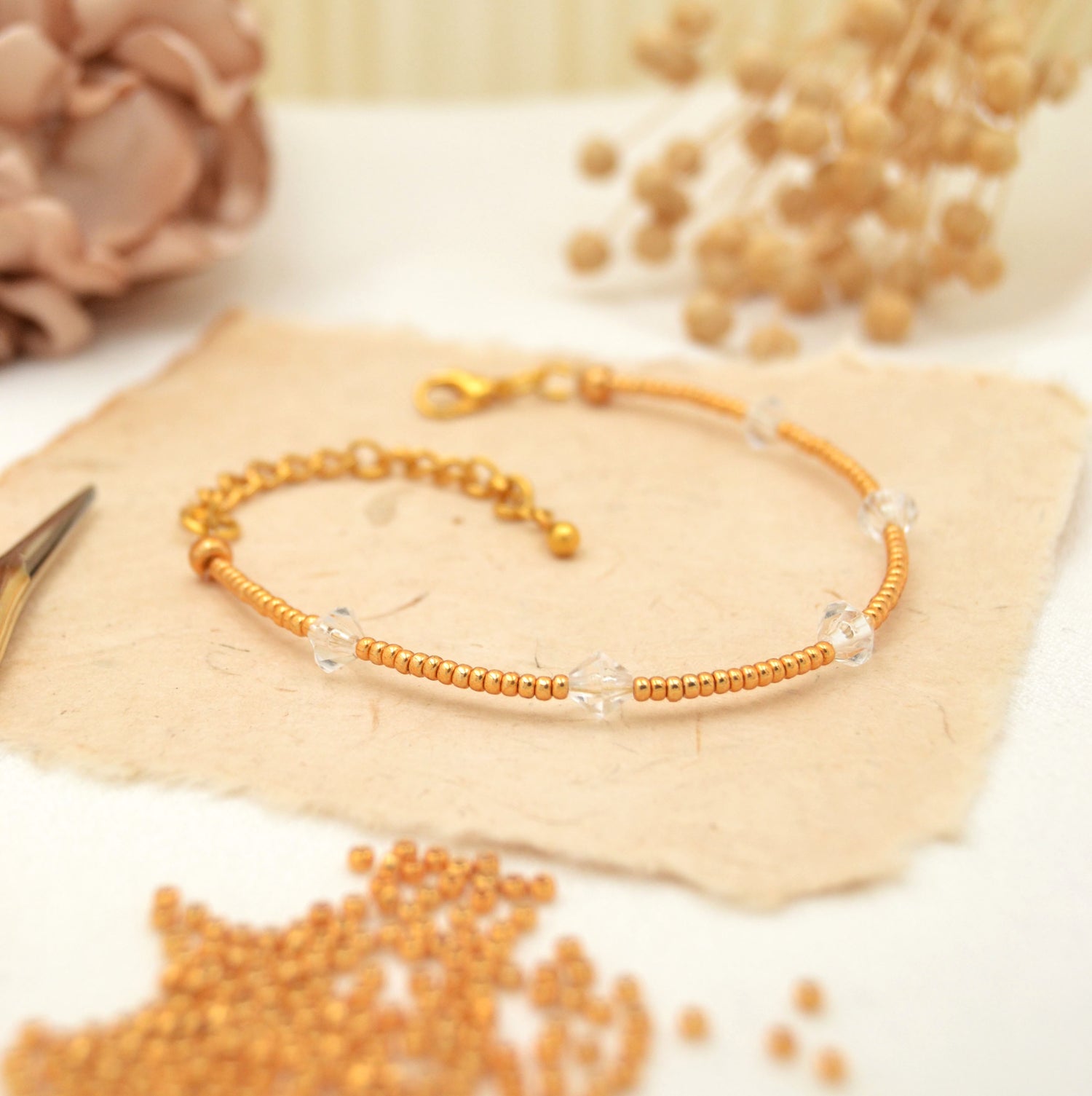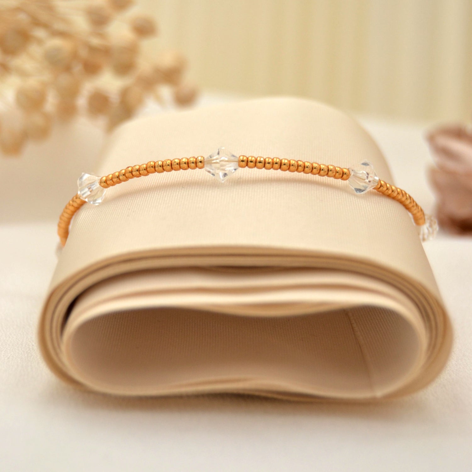 Twinkle, twinkle, little star..." – lass dich von unserem zarten, funkelnden Perlenarmband verzaubern! Dieses handgefertigte Schmuckstück ist von mir für dich eingefädelt und wurde aus goldenen japanischen Saatperlen und transparenten Bicones gefertigt.
